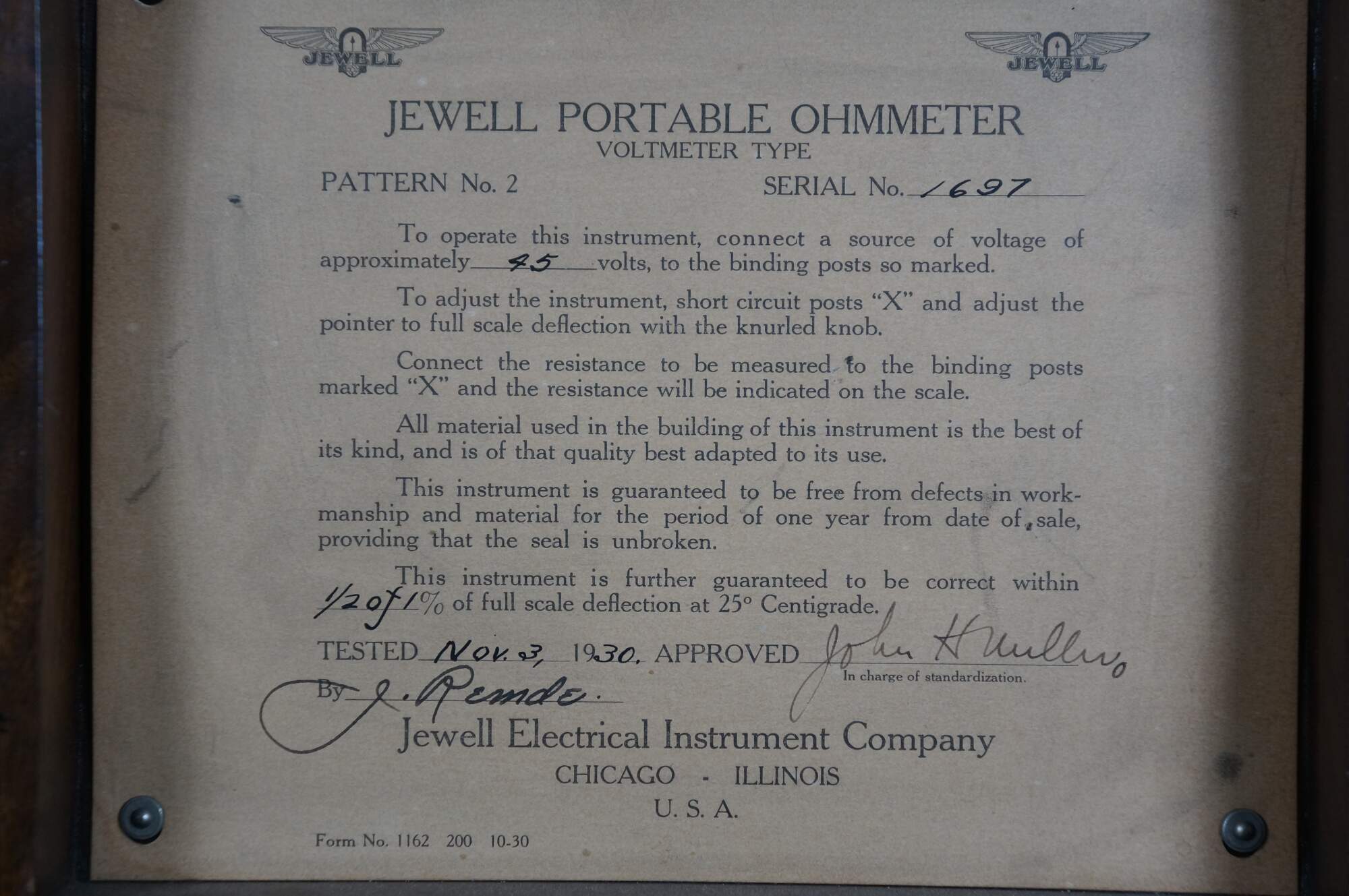 1930's Jewel portable voltmeter type ohmeter in wood case. Jewell Electrical Instrument Company, Chicago, IL - Jewell Portable Ohmmeter - Voltmeter Type - Pattern 2 - Serial No. 1080 (device) - Serial No. 1697 (case) - Made in USA.