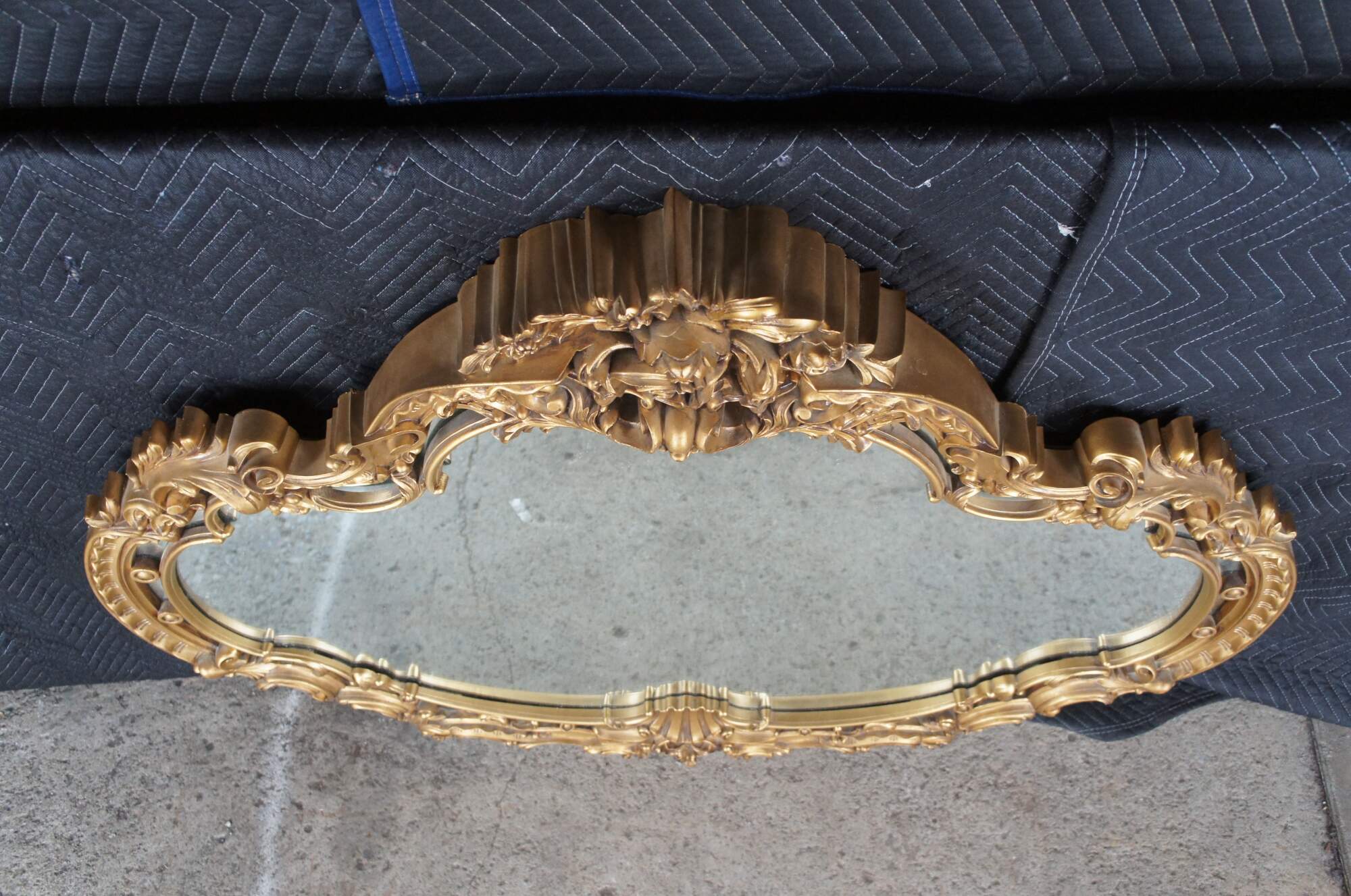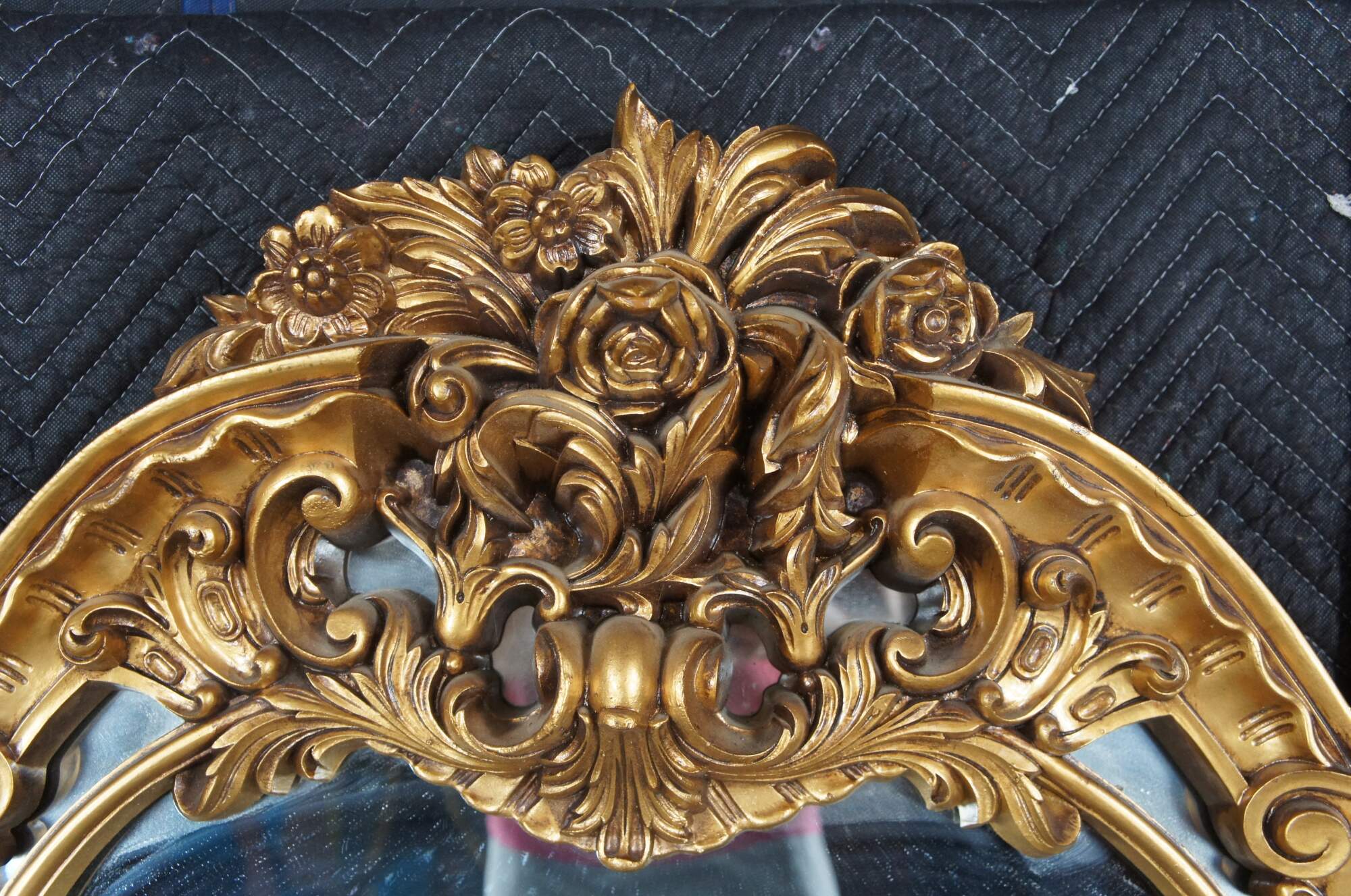 Turner Mfg Italian Baroque / Hollywood Regency style wall mirror, circa 1970s. Features a beautifully molded and scalloped frame with a rose crown and 'S' and 'C' scroll foliate and scalloped detail. A warm addition to any space.