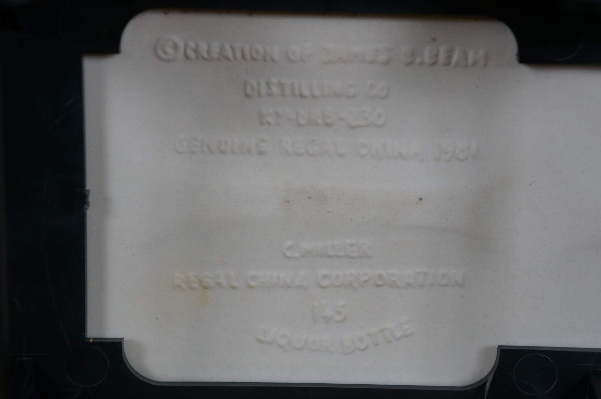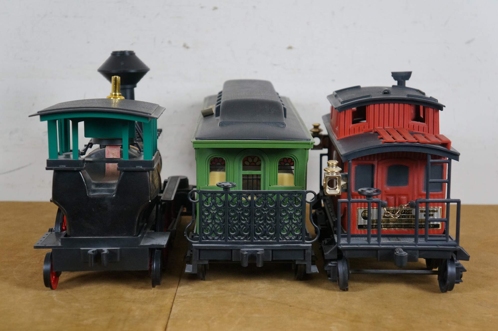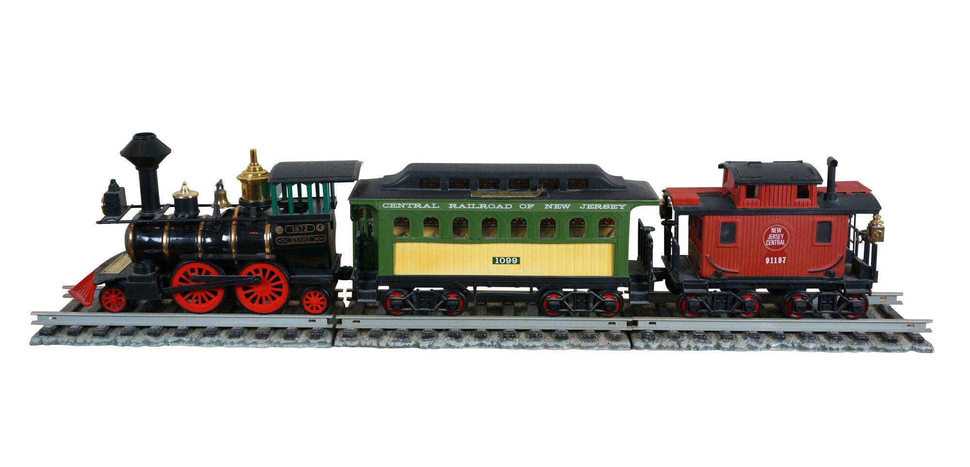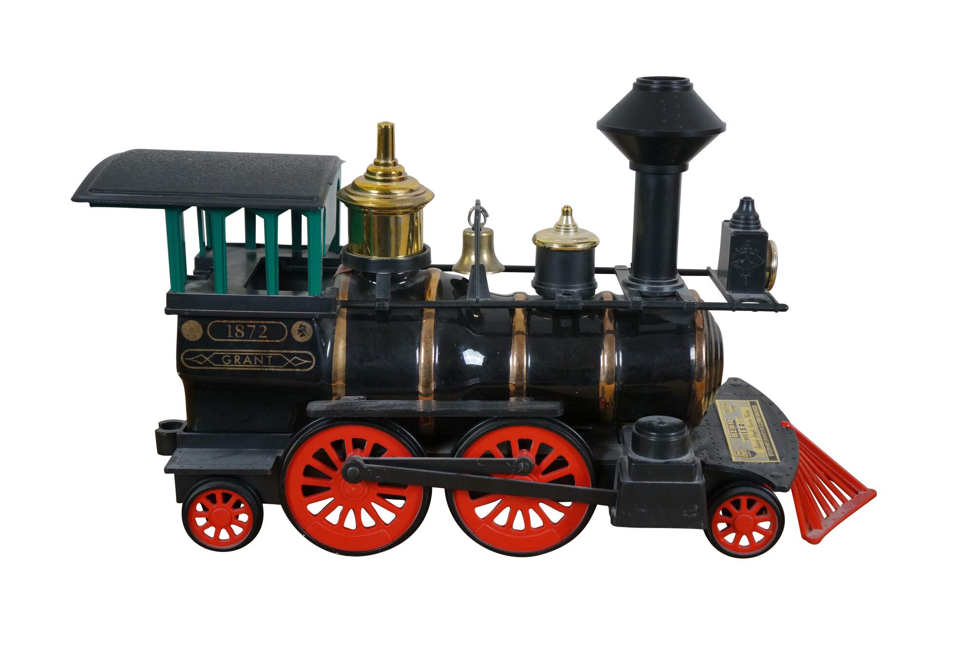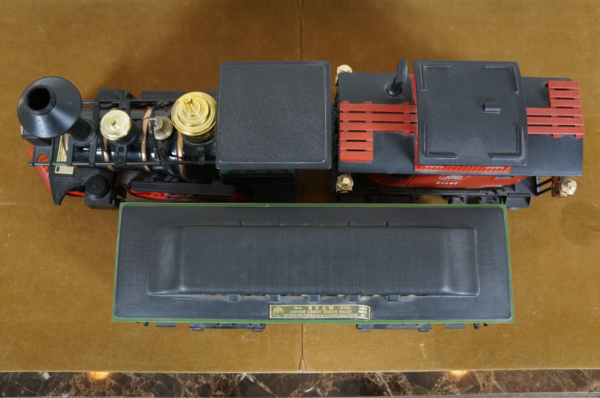 Vintage 1980's Jim Beam Whiskey train. These train cars are crafted of plastic and metal with porcelain bottle/ decanter bodies / interior structures, containing aged Kentucky Straight Bourbon Whiskey. Set includes five pieces of plastic and metal connecting display track, 1872 Grant steam engine/ locomotive, and passenger car. Seals / whiskey intact on all car decanters except the engine.
