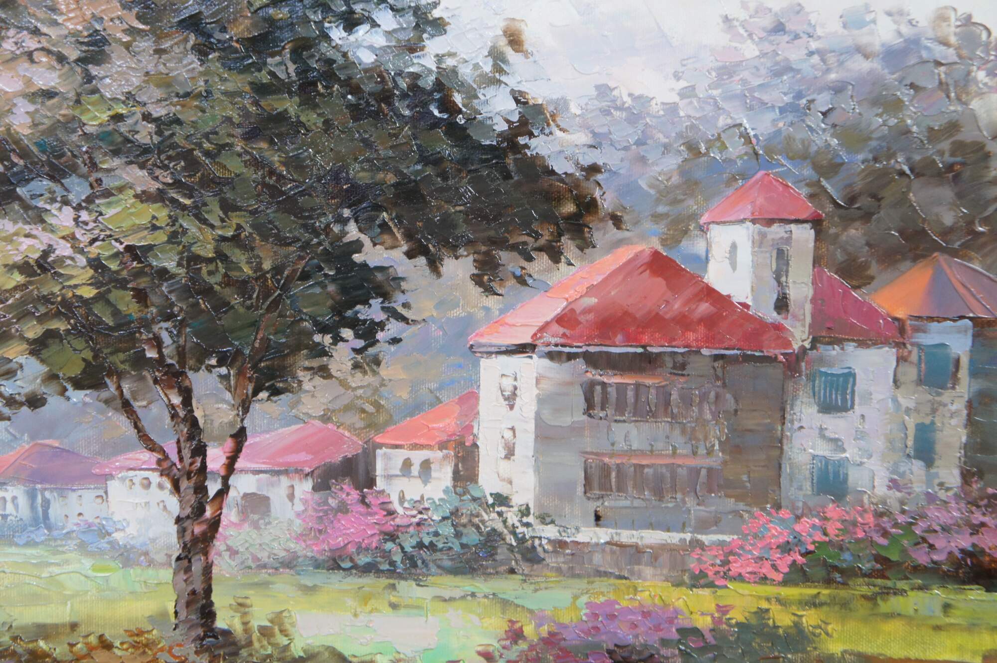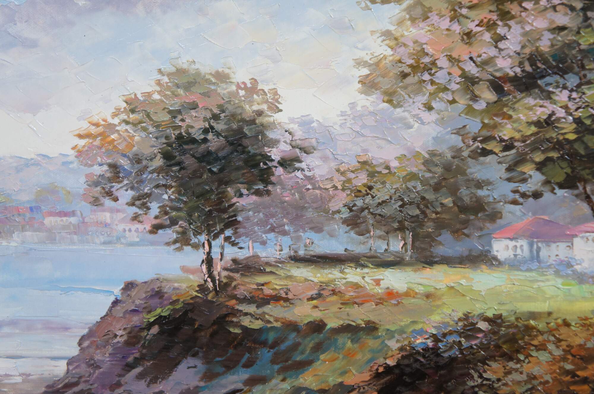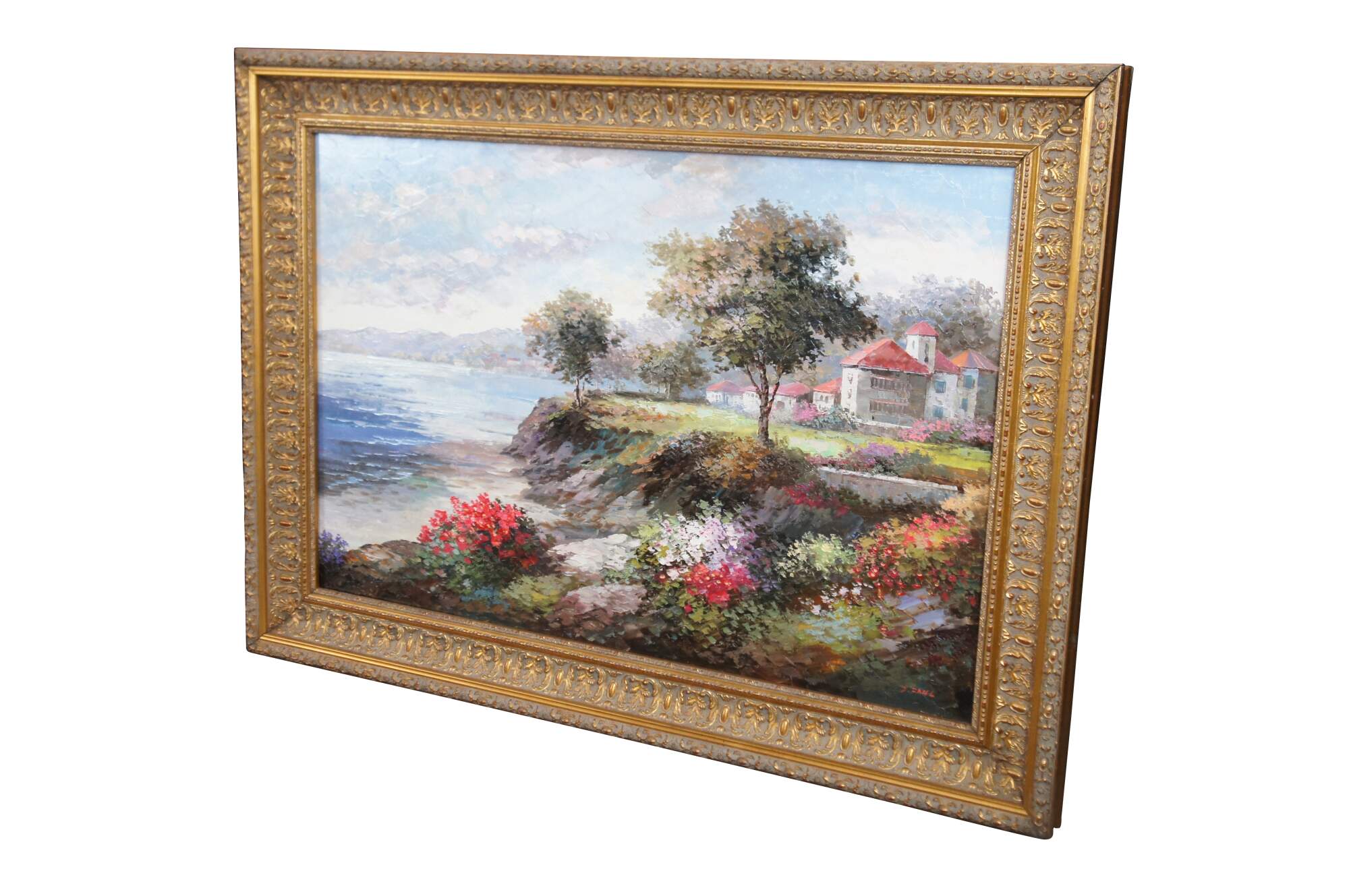 A late 20th Century Impressionist oil painting by P. Paul (American), canvas signed lower right. Features a charming oceanside Tuscan / Mediterranean villa on a calm afternoon. Beautiful flowers can be seen in bloom as the waves crash ashore. A well executed piece framed in a wooden neoclassical gold finished frame.
