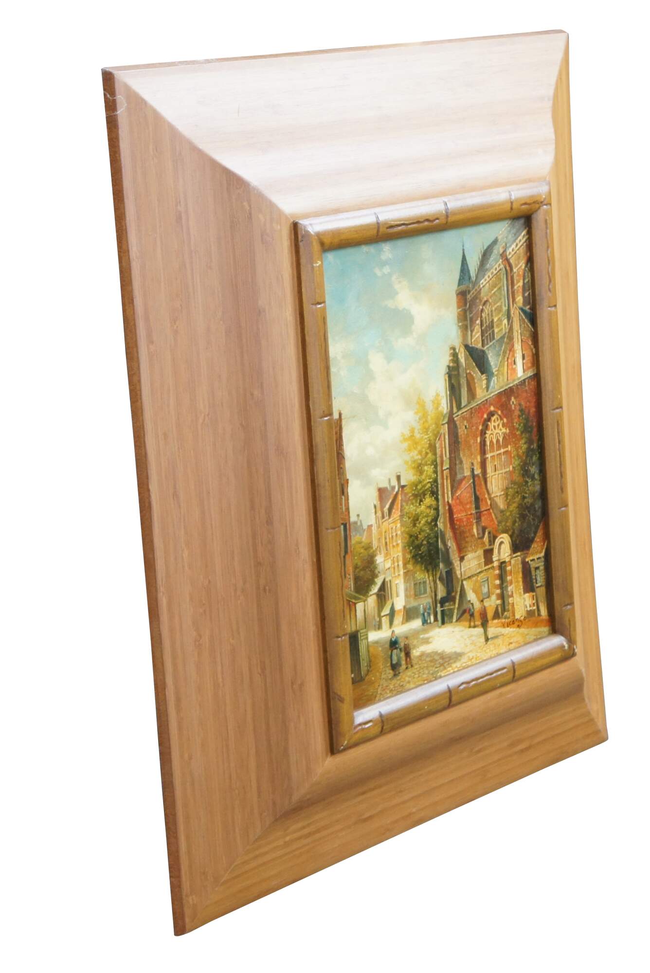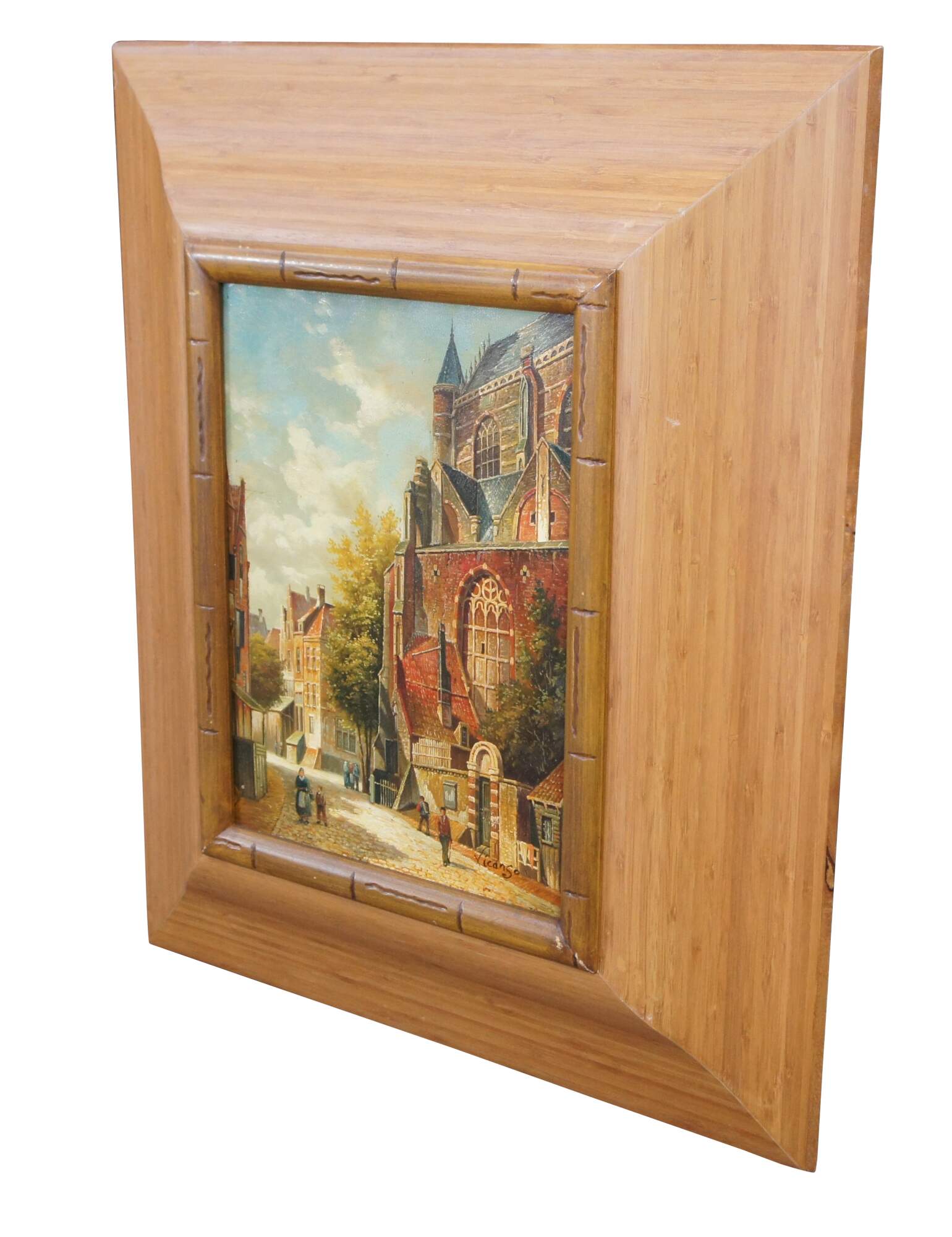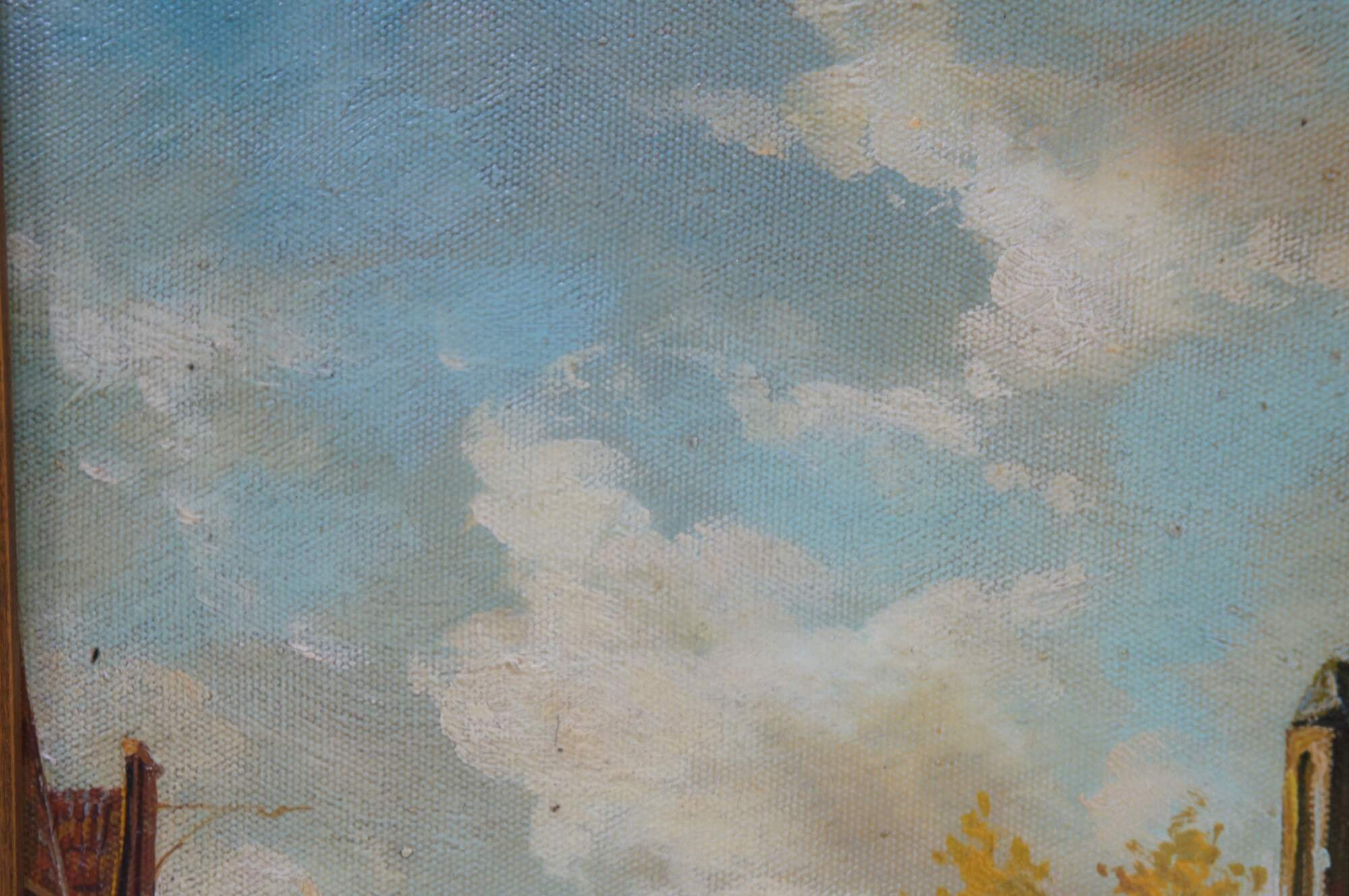 Late 20th Century Timeless Treasures European oil painting on canvas, signed lower right. The painting showcases a village with a large cathedral next to a cobblestone road with figures and houses in the background.