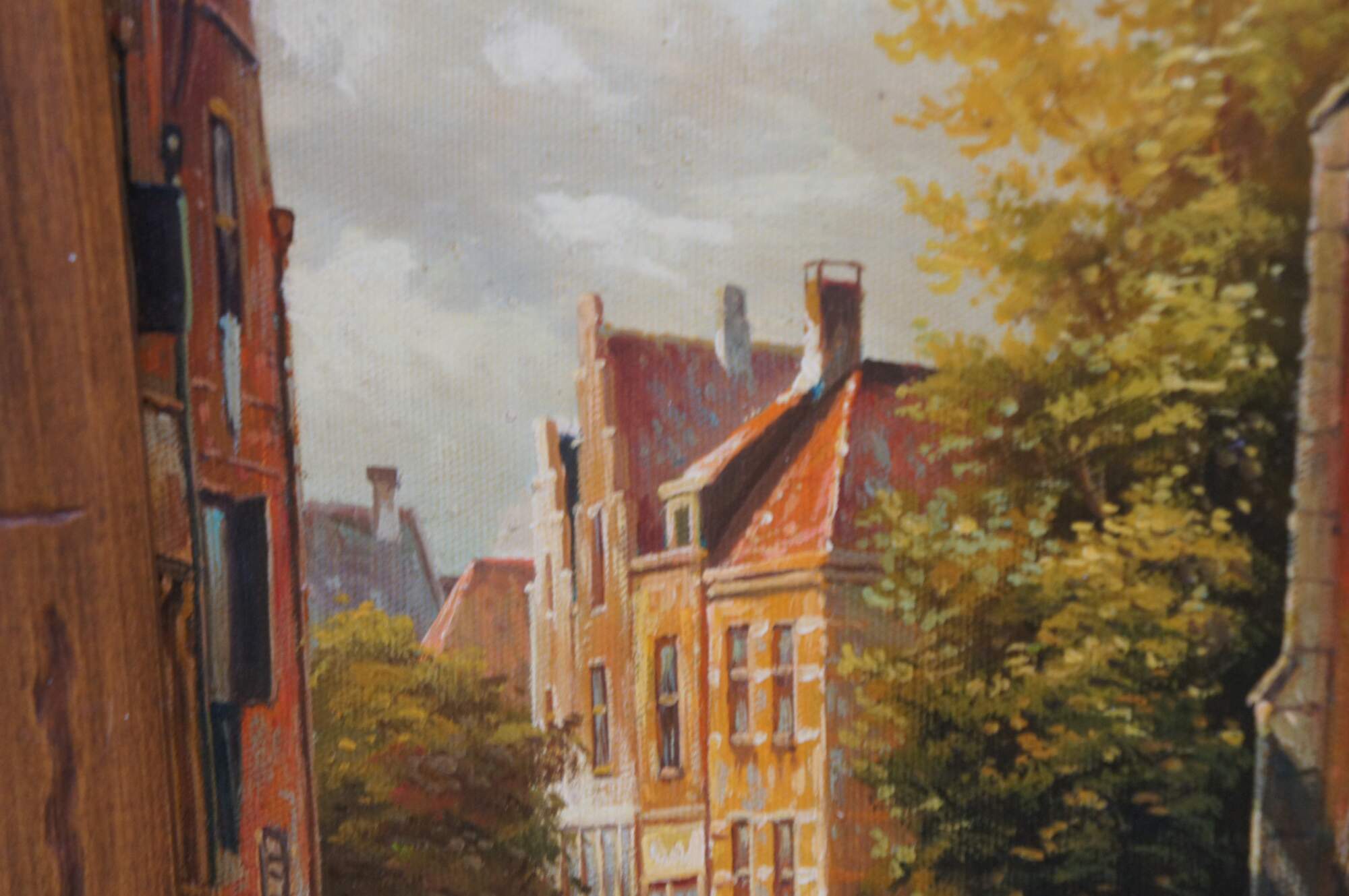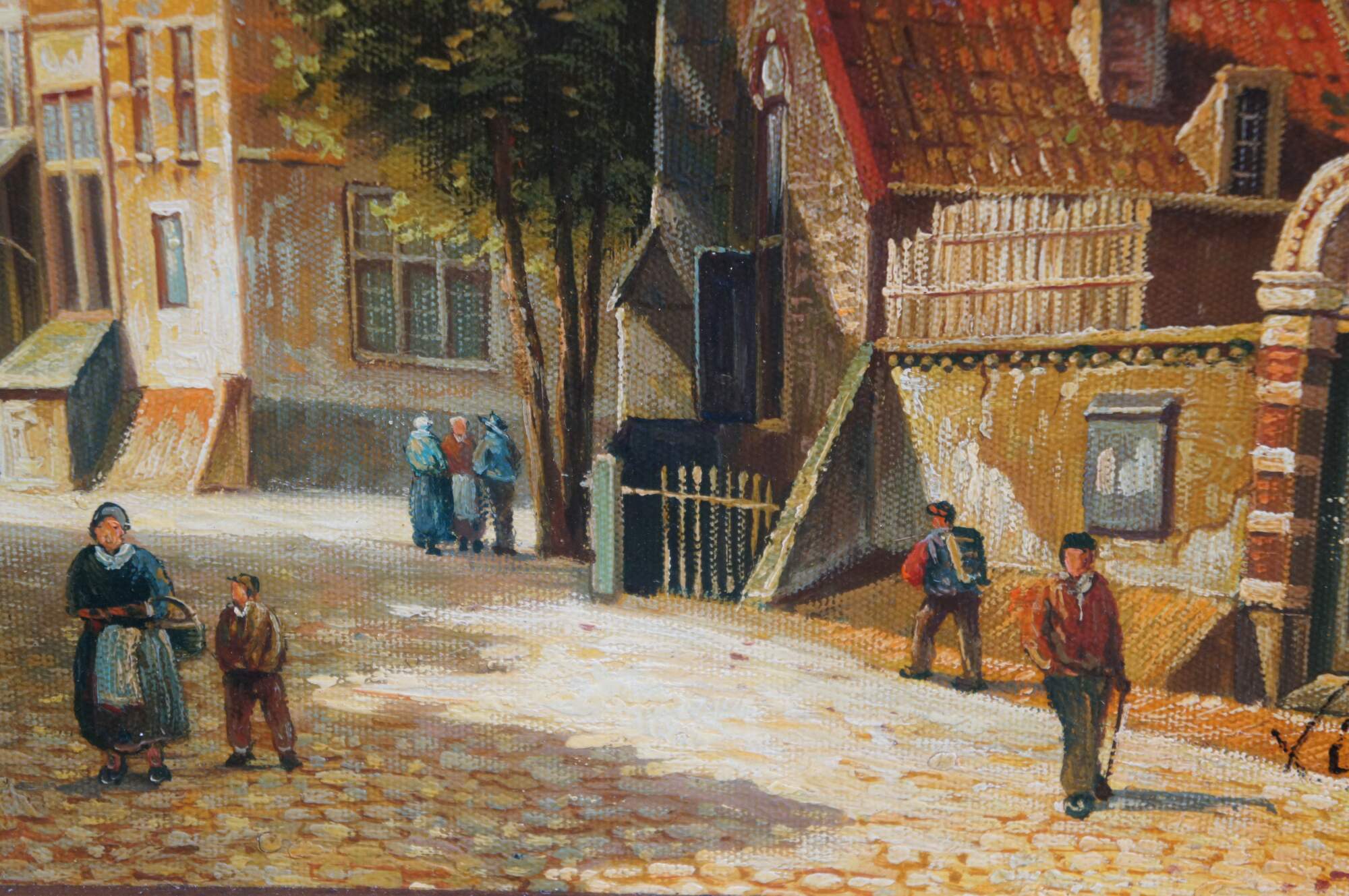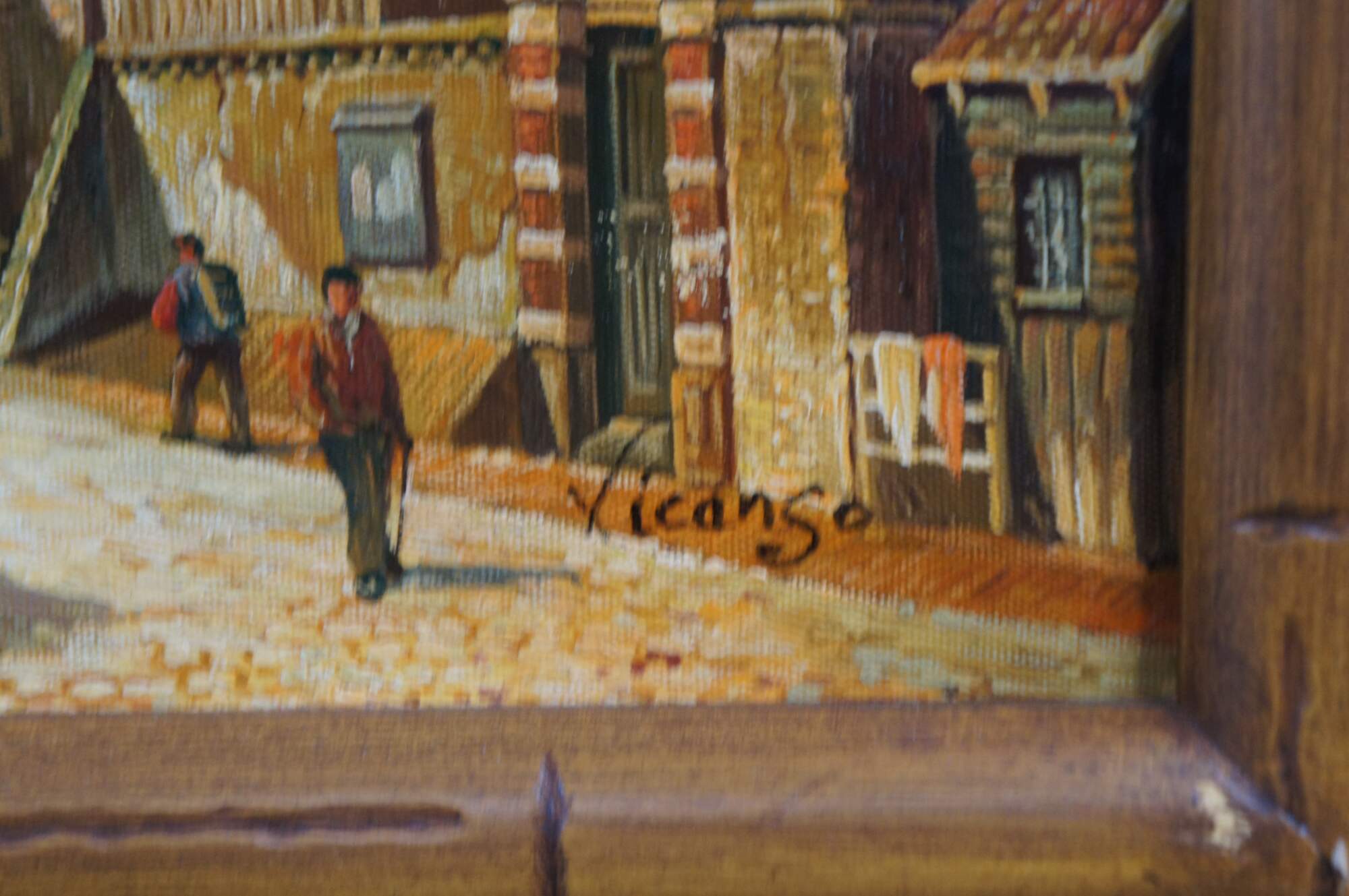 Late 20th Century Timeless Treasures European oil painting on canvas, signed lower right. The painting showcases a village with a large cathedral next to a cobblestone road with figures and houses in the background.