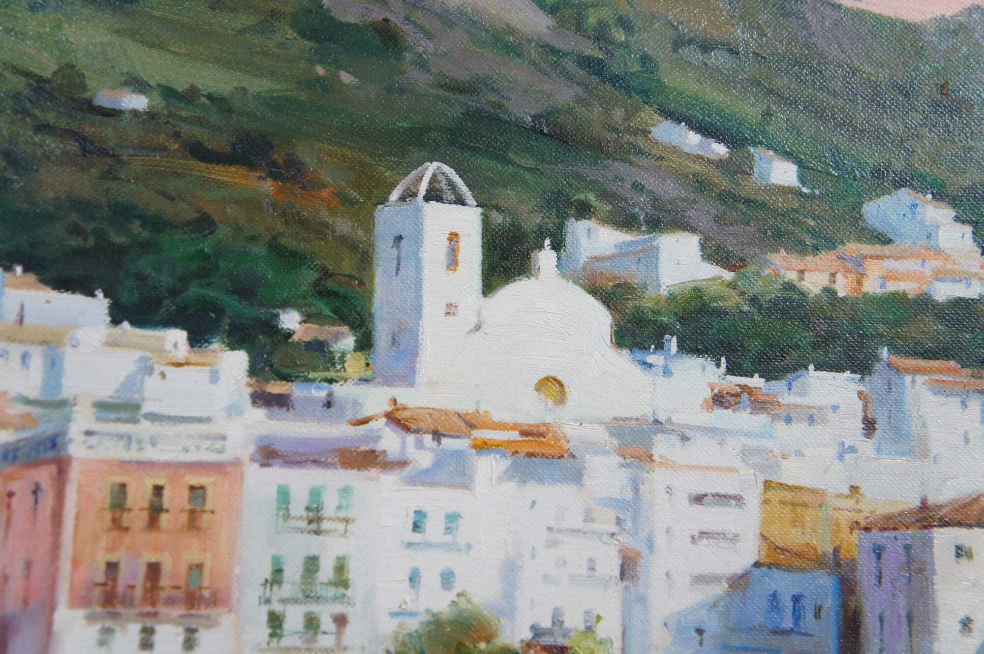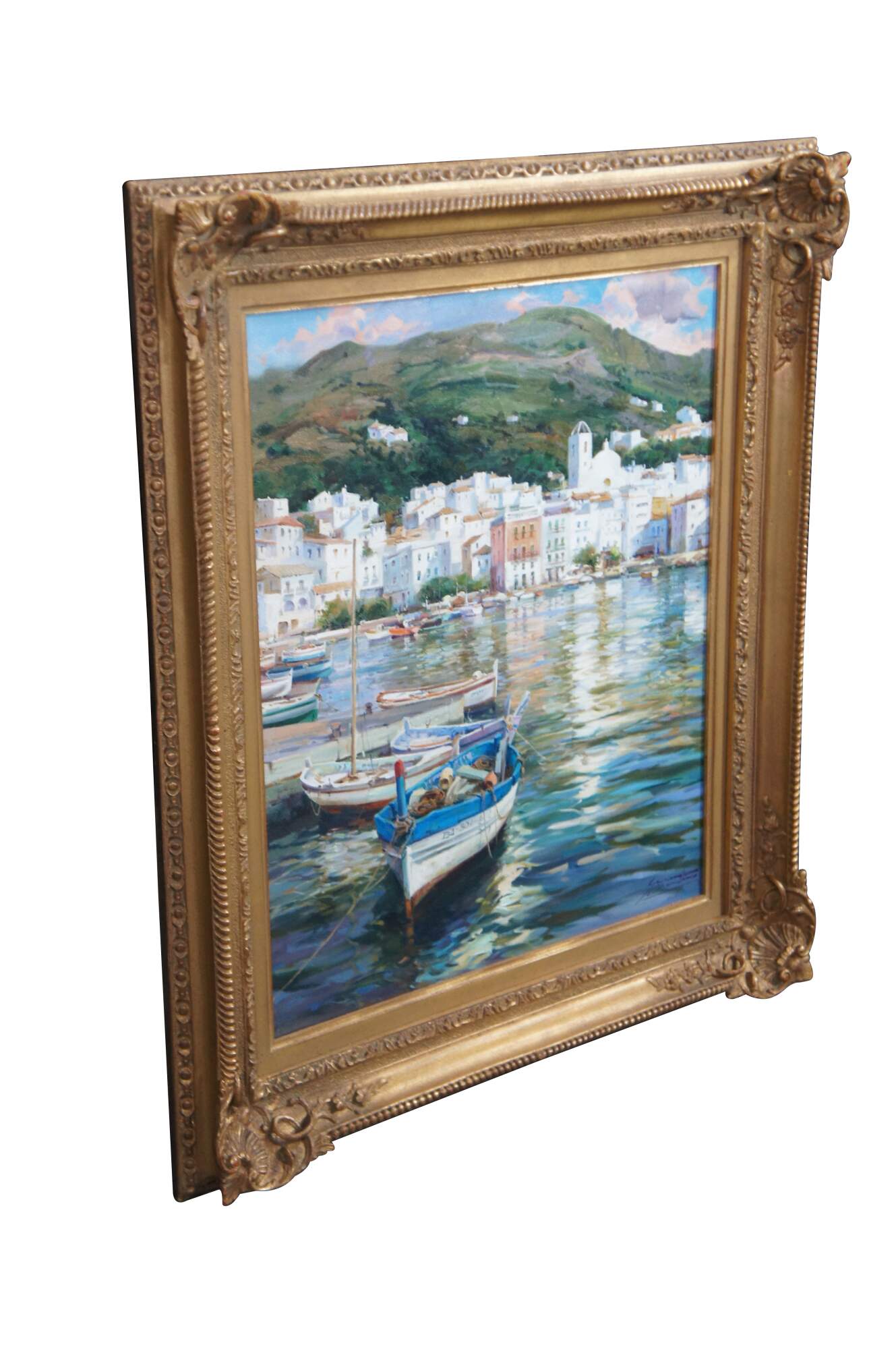 This exquisite oil painting by Salvador Caballero (1944-2006), a Spanish artist, captures the essence of Port De La Selva, a coastal gem in the Costa Brava region of northeastern Spain. The painting presents a panoramic coastal view from a dock or boat, with a vibrant architectural landscape adorning a prominent hillside. Fishing vessels and sailboats are elegantly docked within the harbour.