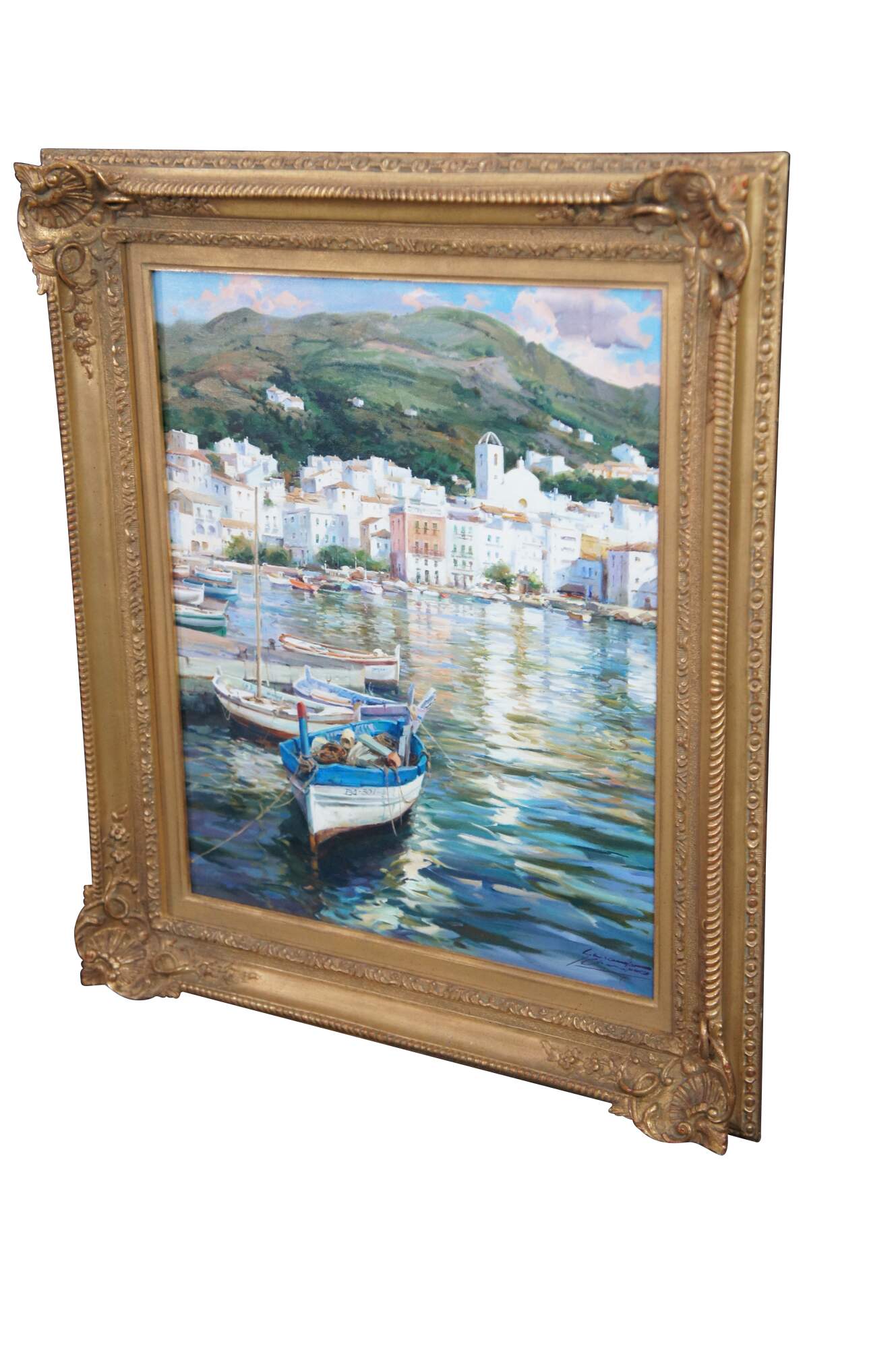 The signed lower right and verso markings indicate the artist’s authorship. The painting is encased in a baroque frame adorned with scalloped corners, executed in gold.