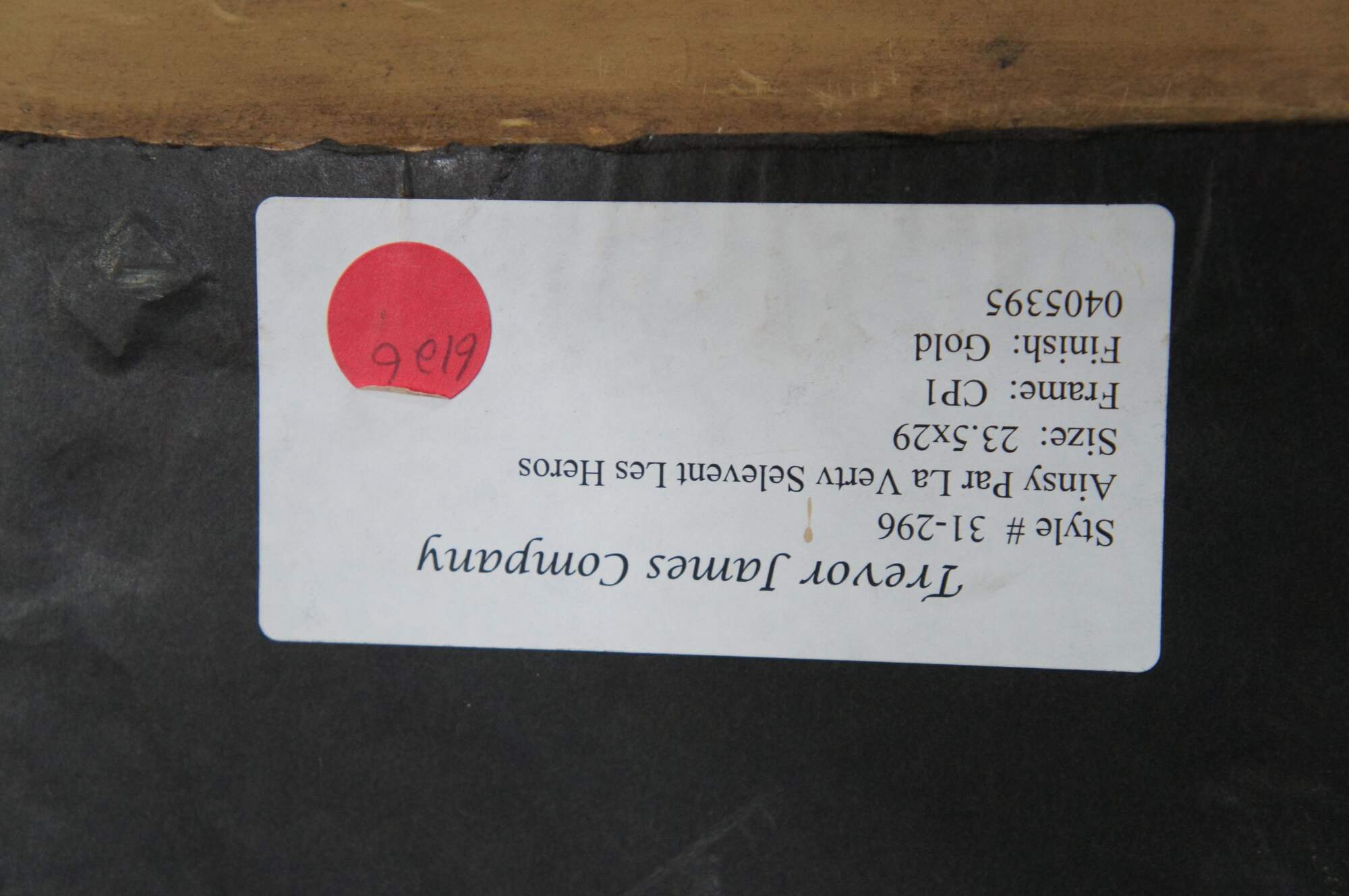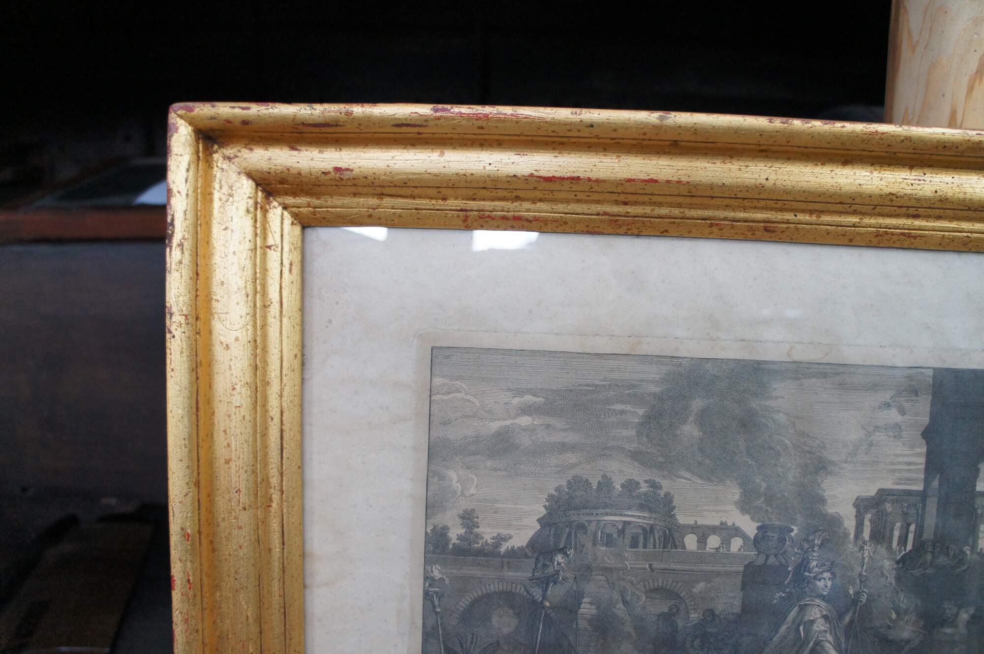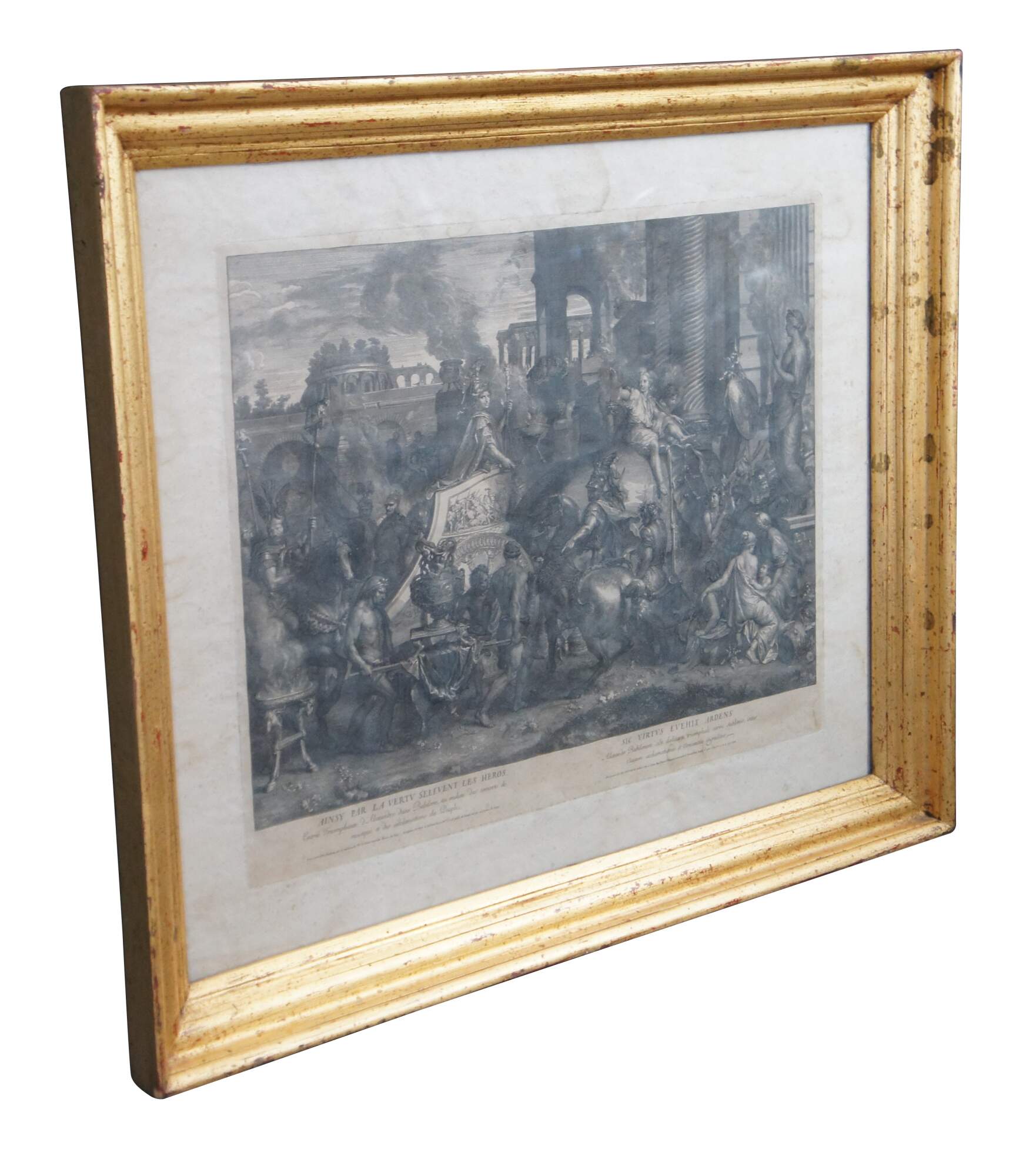 This etching is titled Ainsy Par La Vertue Selevent Les Heros. The artwork is framed in a naturally distressed gold frame with beveled edges and glass protecting the artwork.