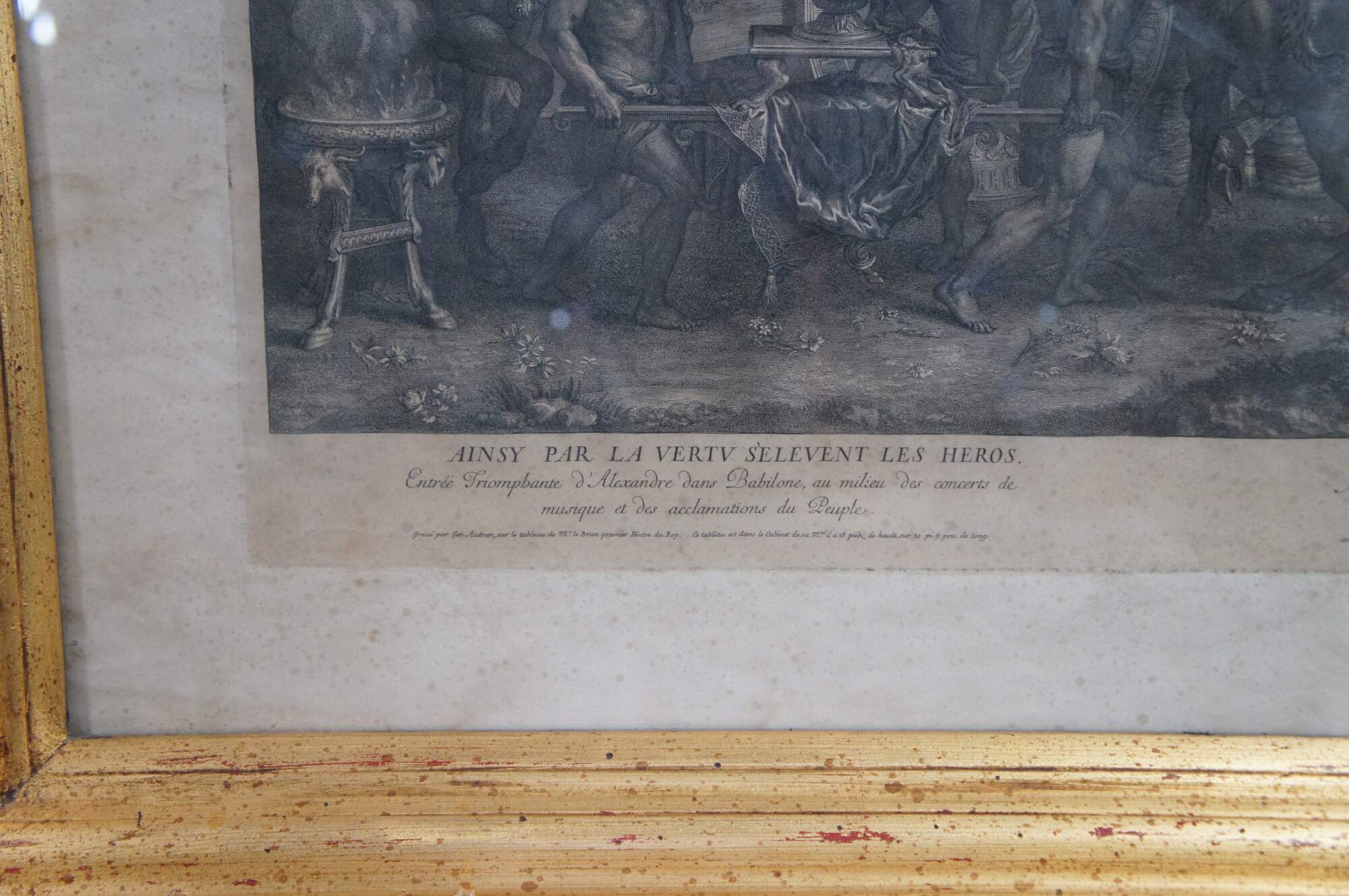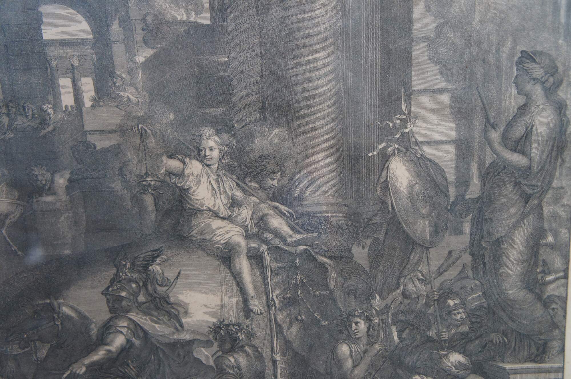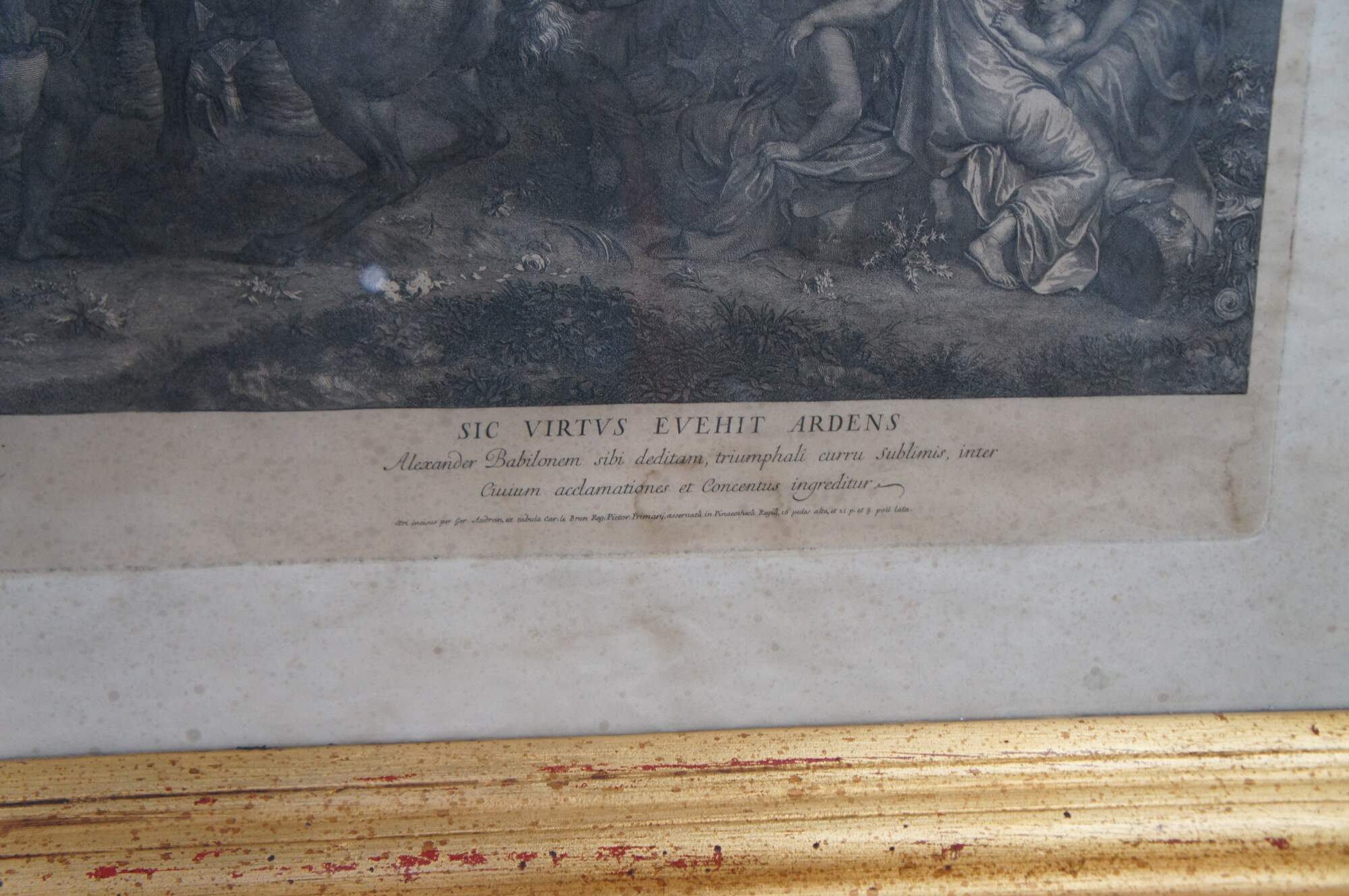 Trevor James Company black and white framed etching of Alexander Entering Babylon. The original work and painting was created by Charles Le Brun between 1661-1665 and currently displayed in the Louvre. The artwork showcases Alexander the Great triumphantly entering Babylon on his chariot.