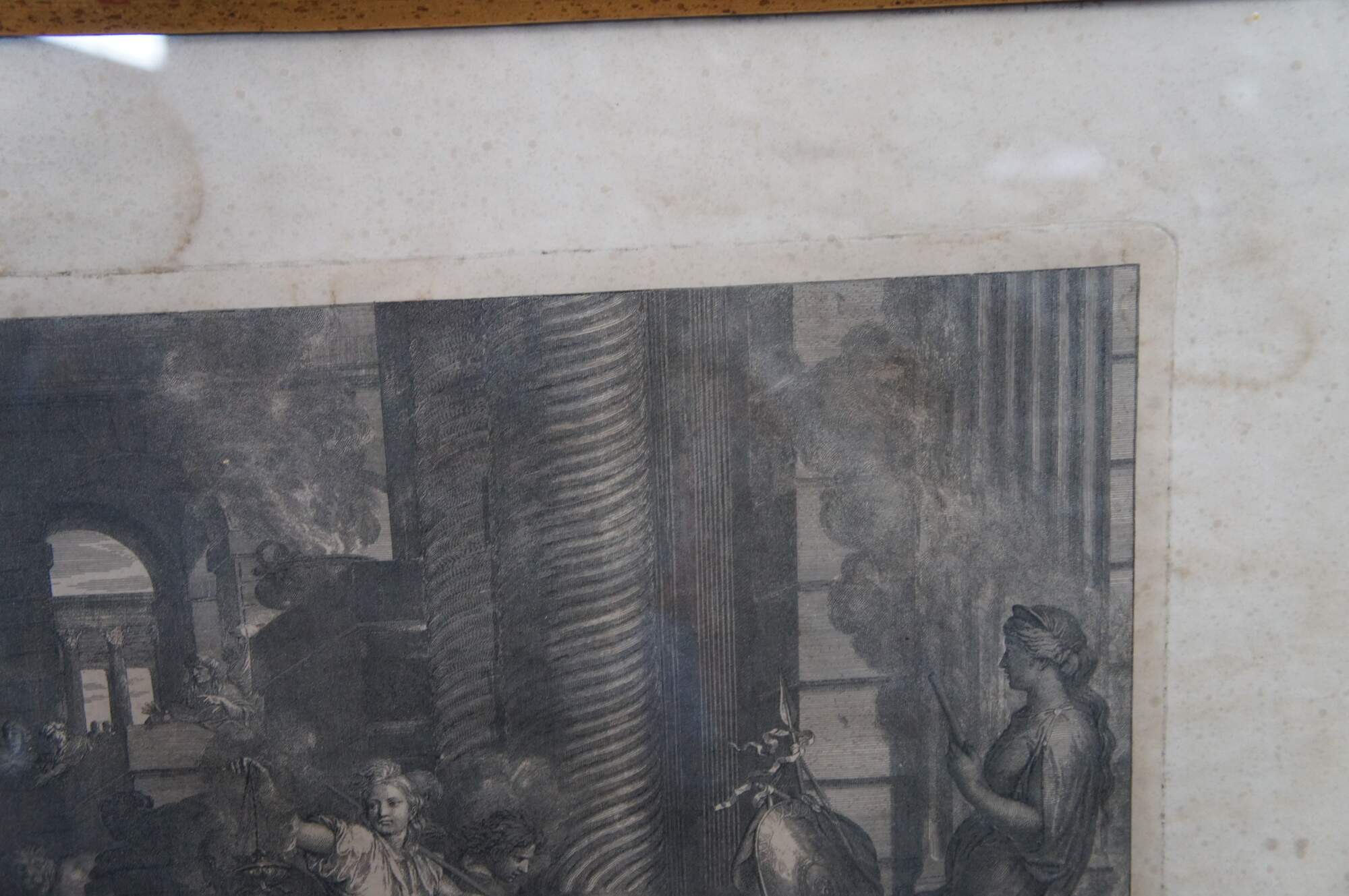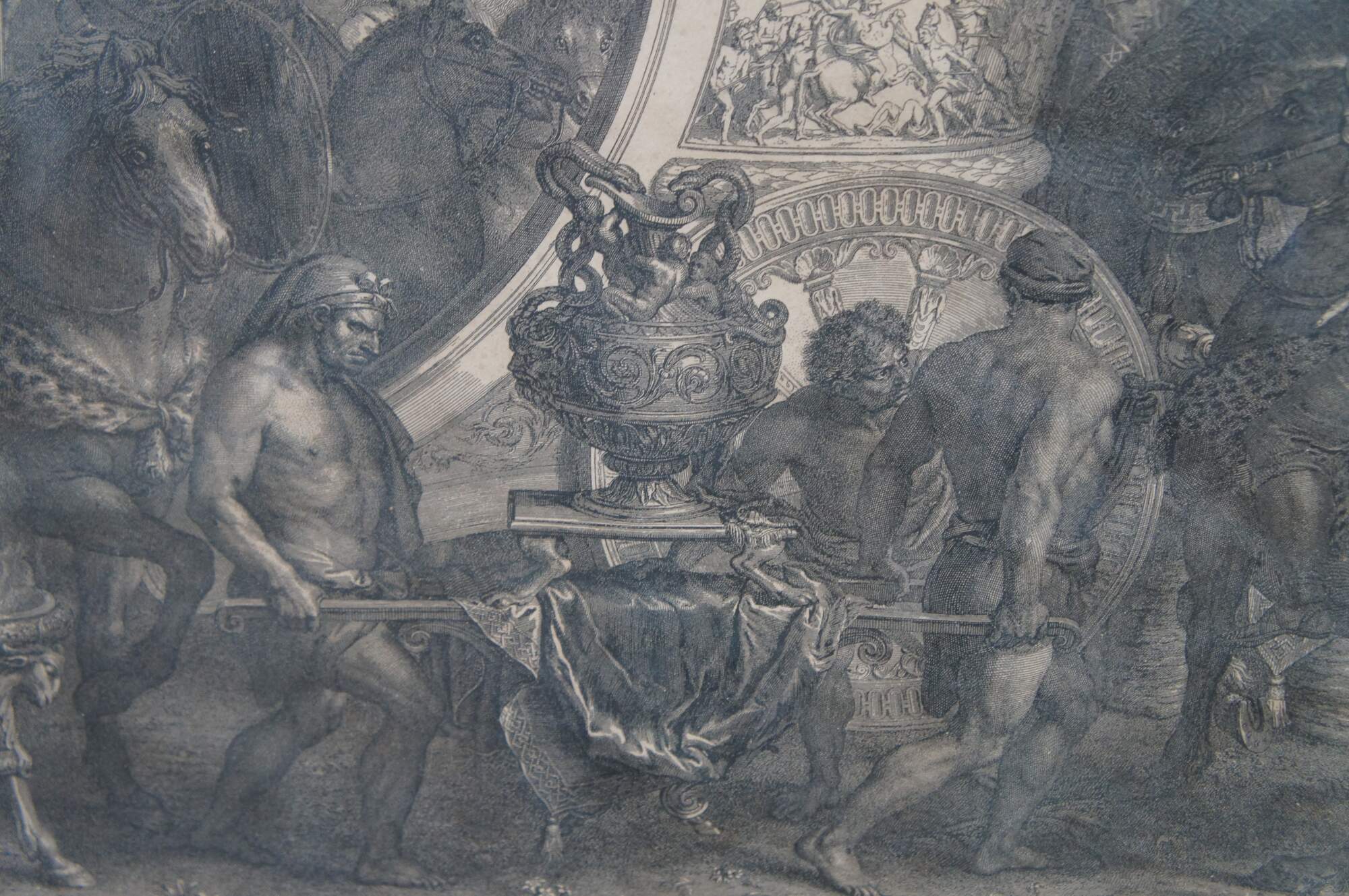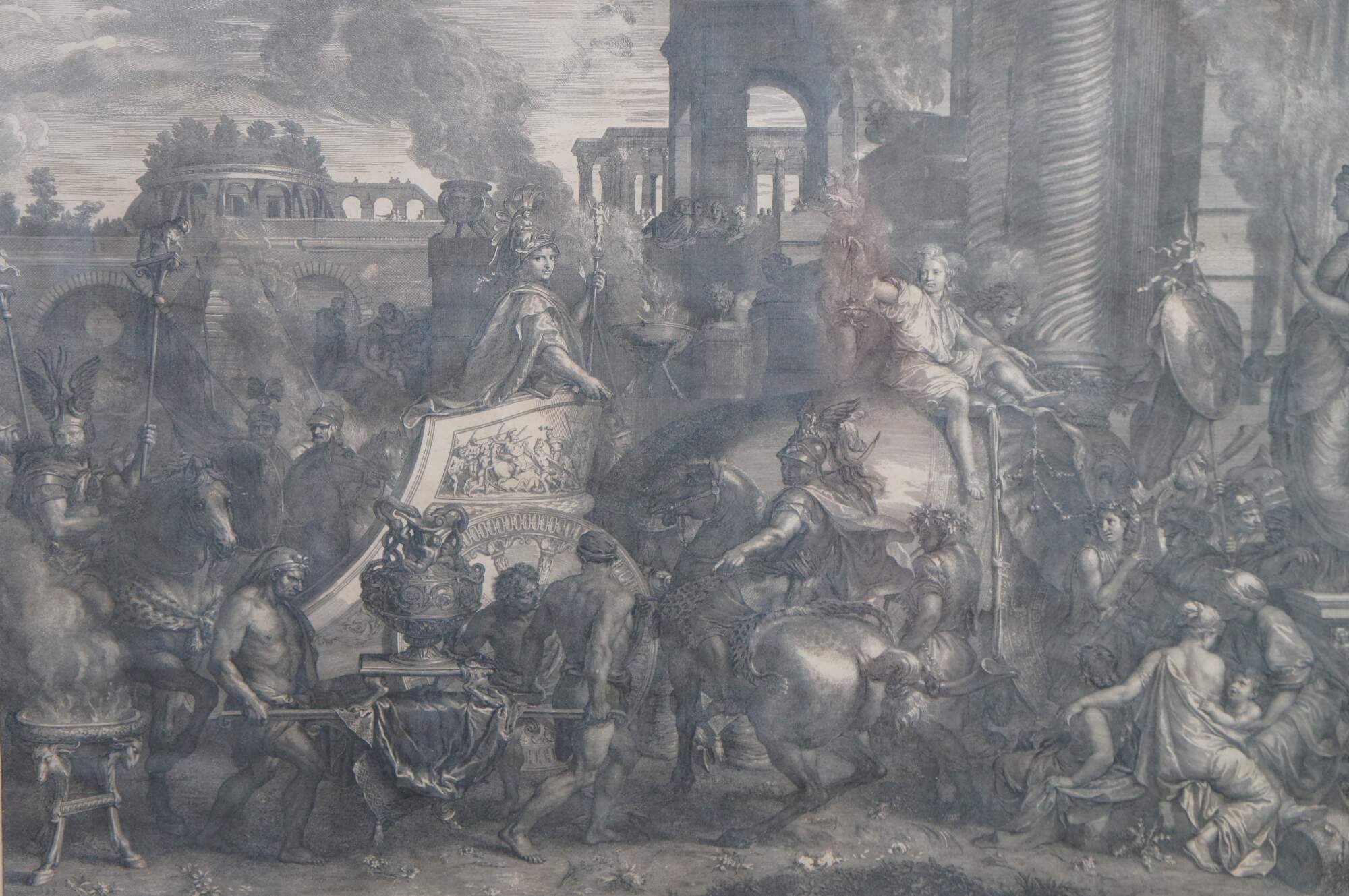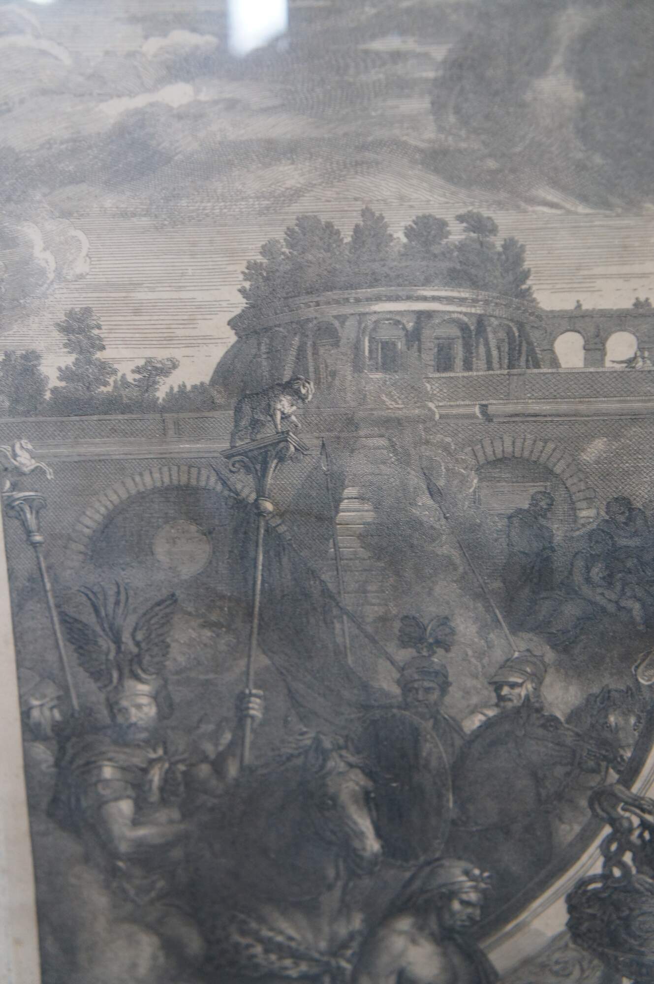 Trevor James Company black and white framed etching of Alexander Entering Babylon. The original work and painting was created by Charles Le Brun between 1661-1665 and currently displayed in the Louvre. The artwork showcases Alexander the Great triumphantly entering Babylon on his chariot.