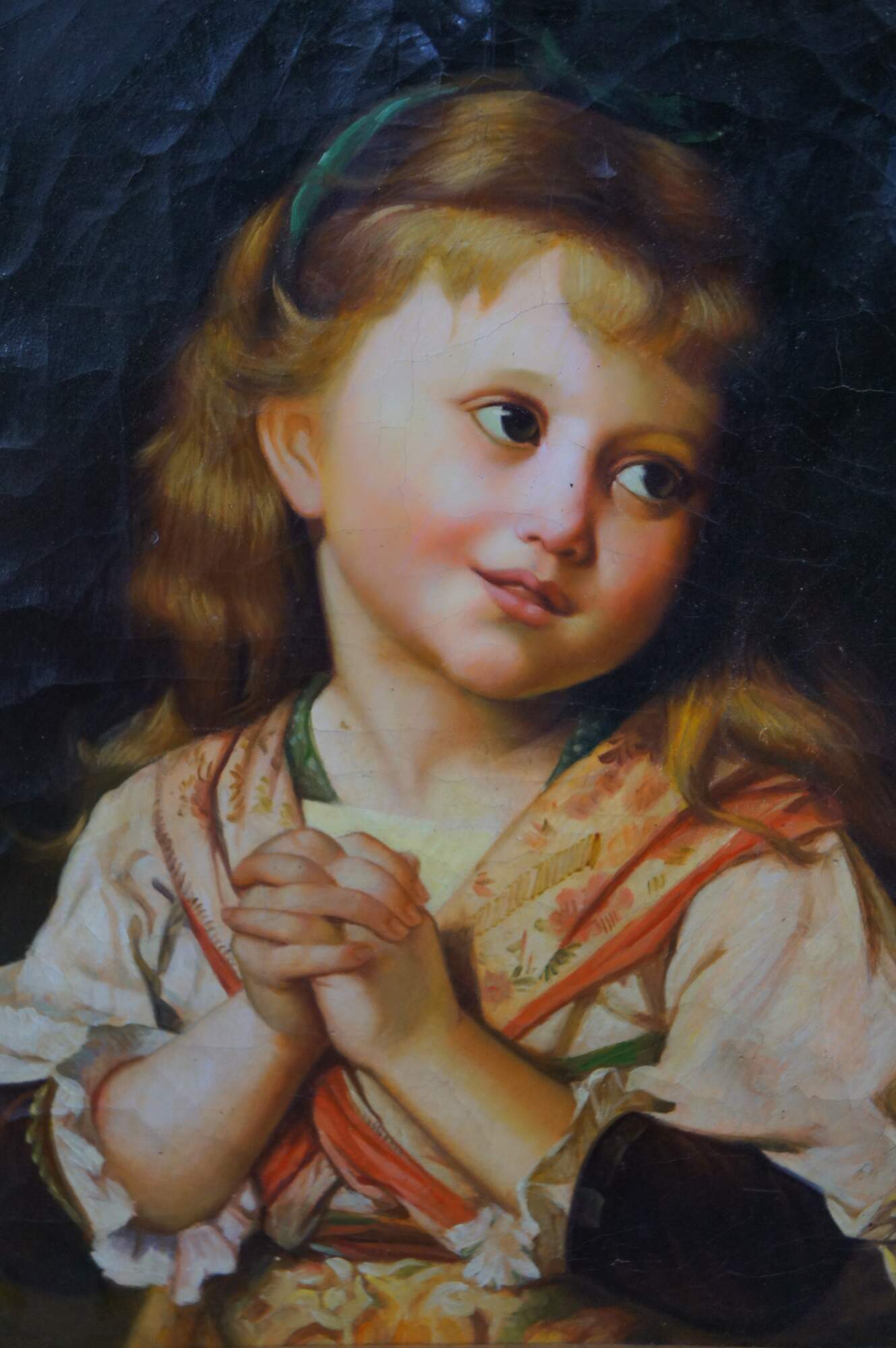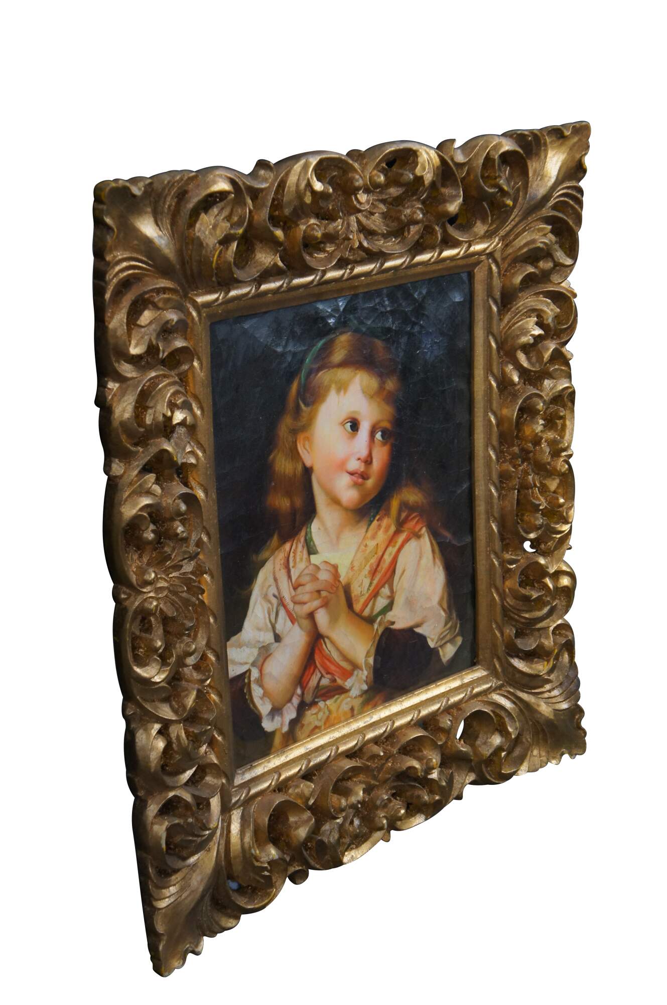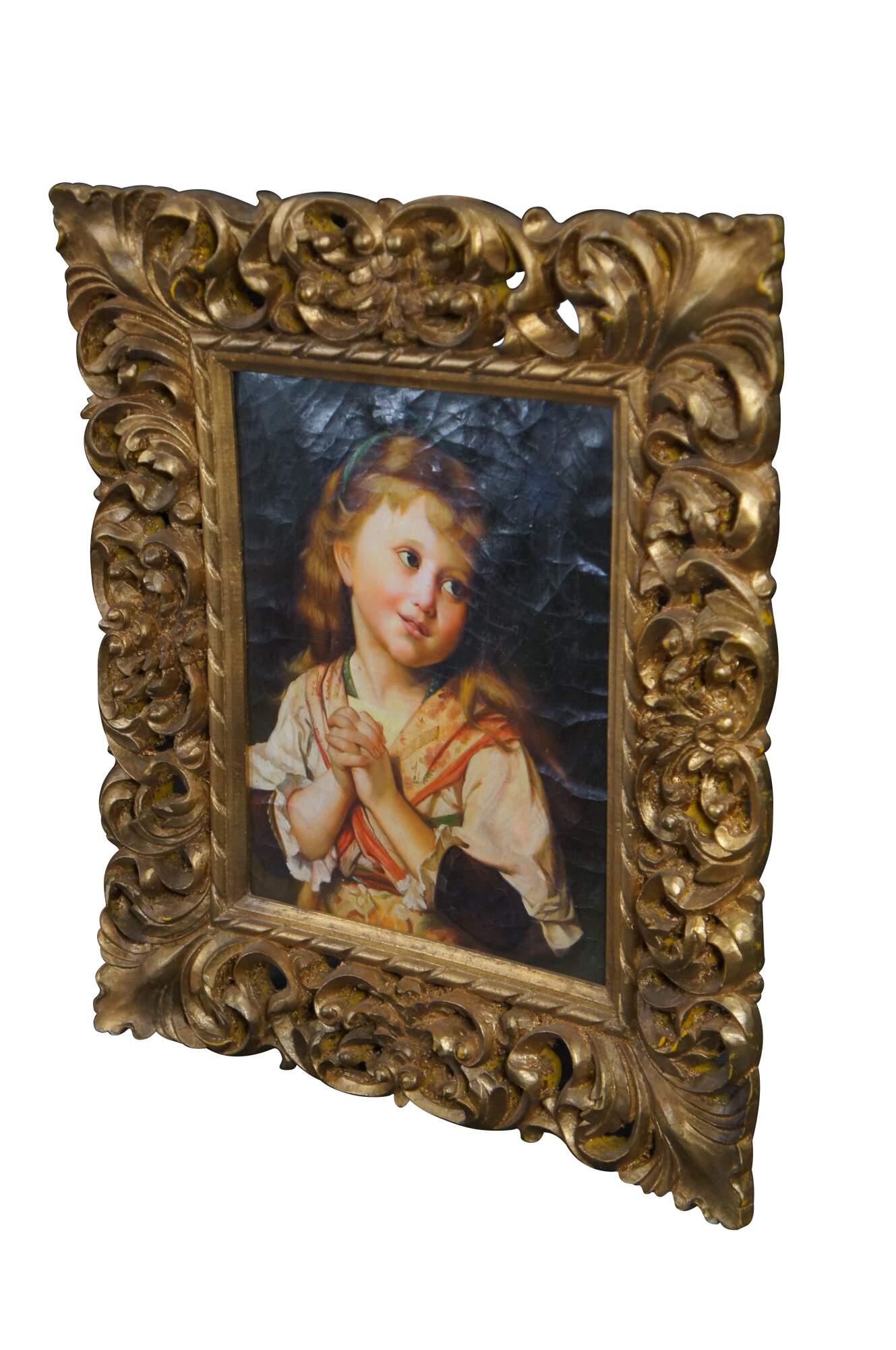 'The Girl Entreaty' by Kalina Oksana, circa late 20th century. Features a young girl posing in the form of an earnest or humble request. Features a heavy ornate Rococo-style frame.