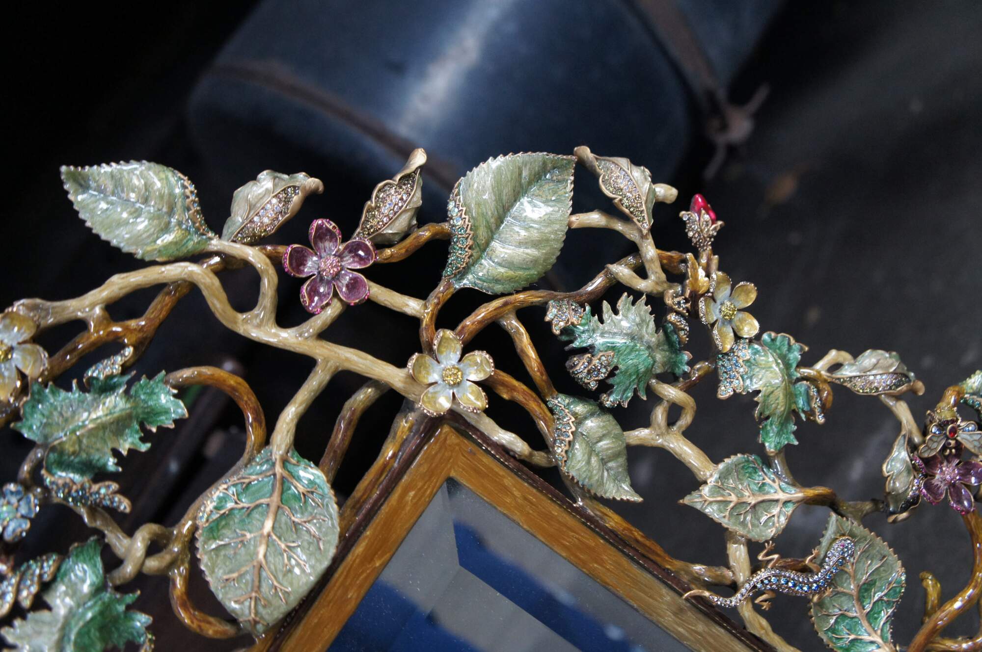 A rare exquisite mirror by Jay Strongwater, circa late 1990s. Aptly Titled 'Flora and Fauna'. Features a heavy ornamental bronze frame with beveled mirror at the center. The mirror is surrounded by flowing flora with an interlaced vine motif and fauna (insects and amphibians) throughout. The frame is crafted in bronze with polychrome enamel and stunning Swarovski crystals. This breathtaking masterpiece showcases frogs, salamanders, butterflies and bees. Retailed for $26,000