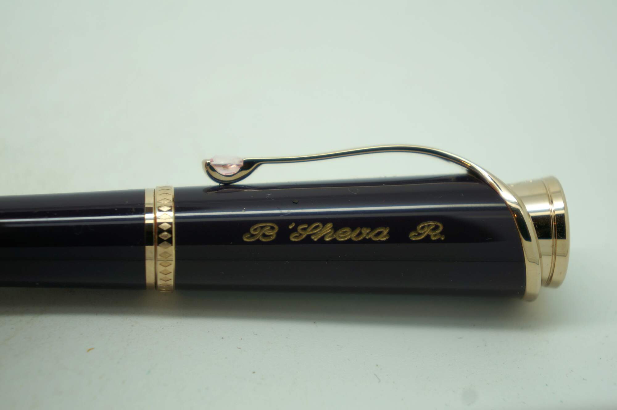 Montblanc Princesse Grace de Monaco Collection special edition ballpoint pen. Style Number: 106633 - Barrel: Royal purple precious resin - Cap, Trim, & Clip: Champagne-tone gold-plated, set with a petal-cut pink topaz (heat-treated) of approx. 0.39 ct. Serial Number: MBMC5Y0D1. Personalized by the previous owner. Includes the original box.