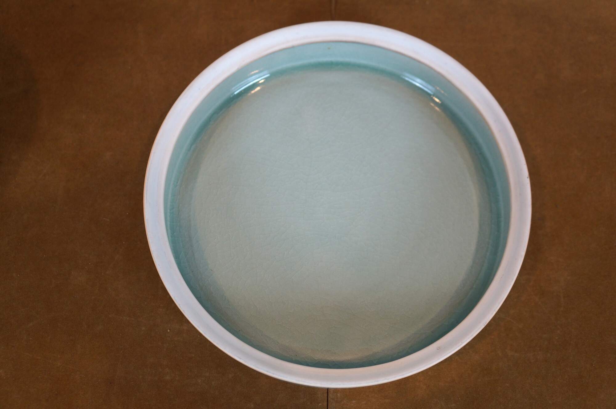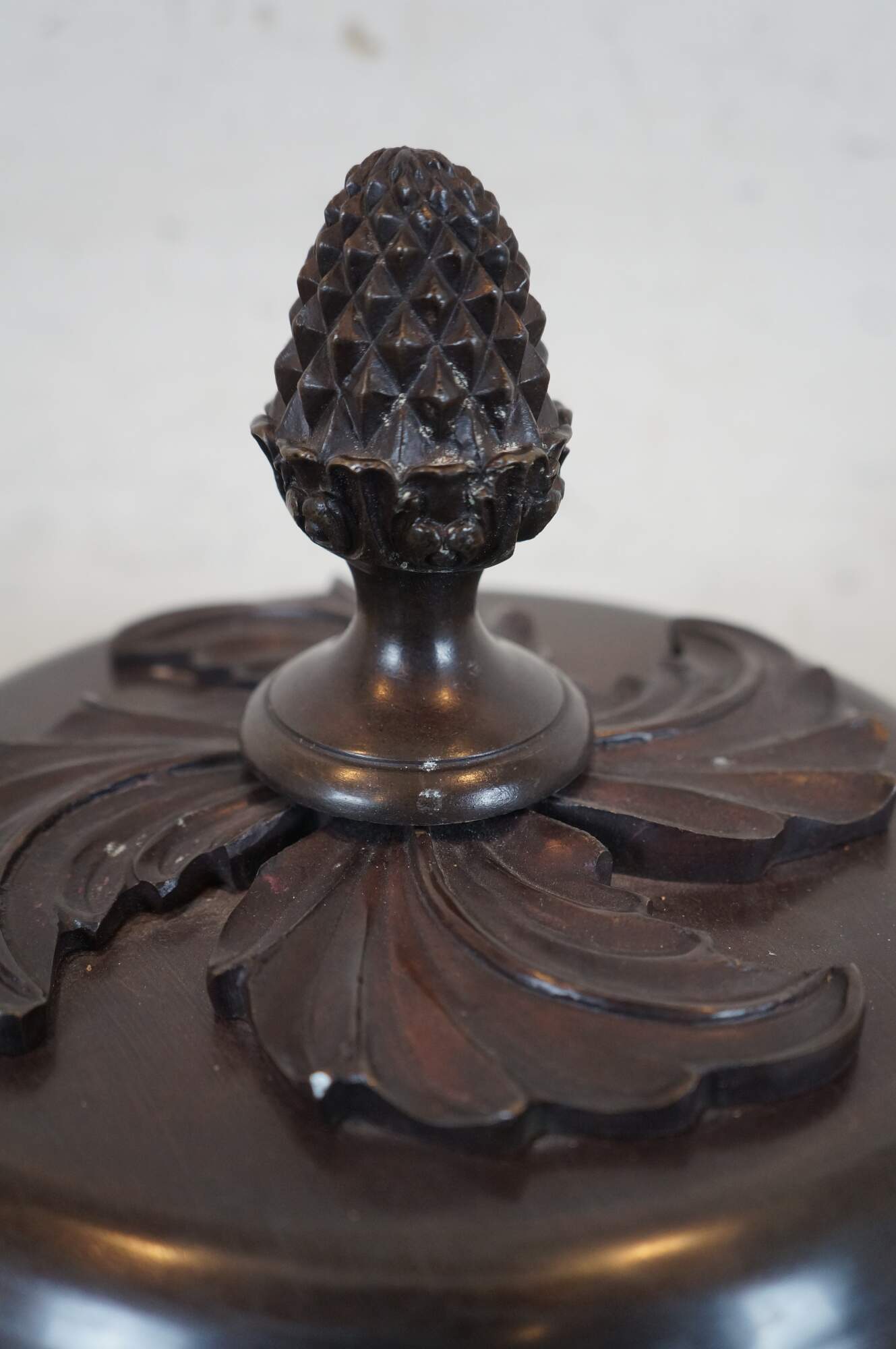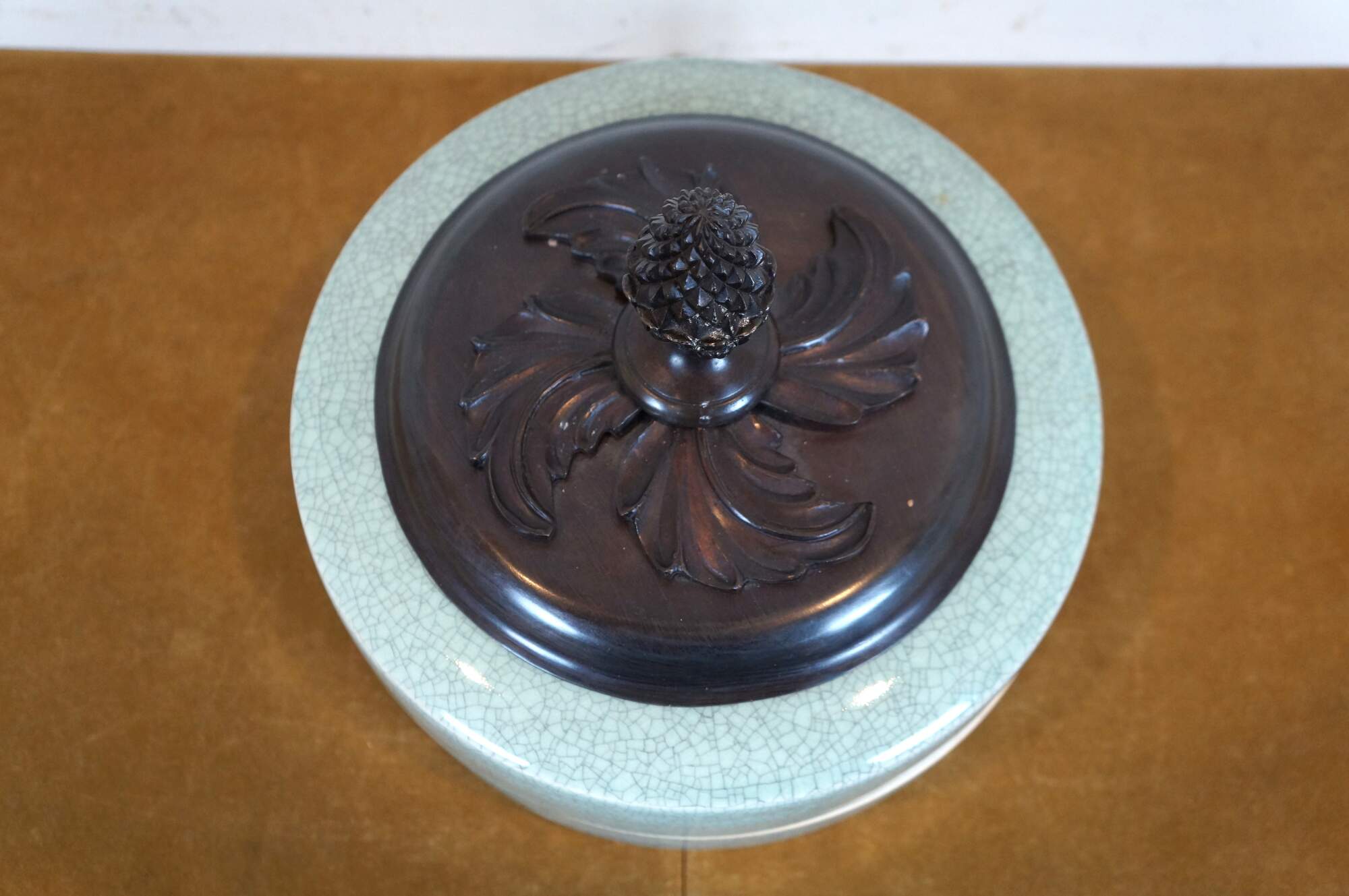 Maitland Smith round lidded trinket dish/box with a factory distressed pale celadon green glaze, topped with a bronze pineapple shaped finial.