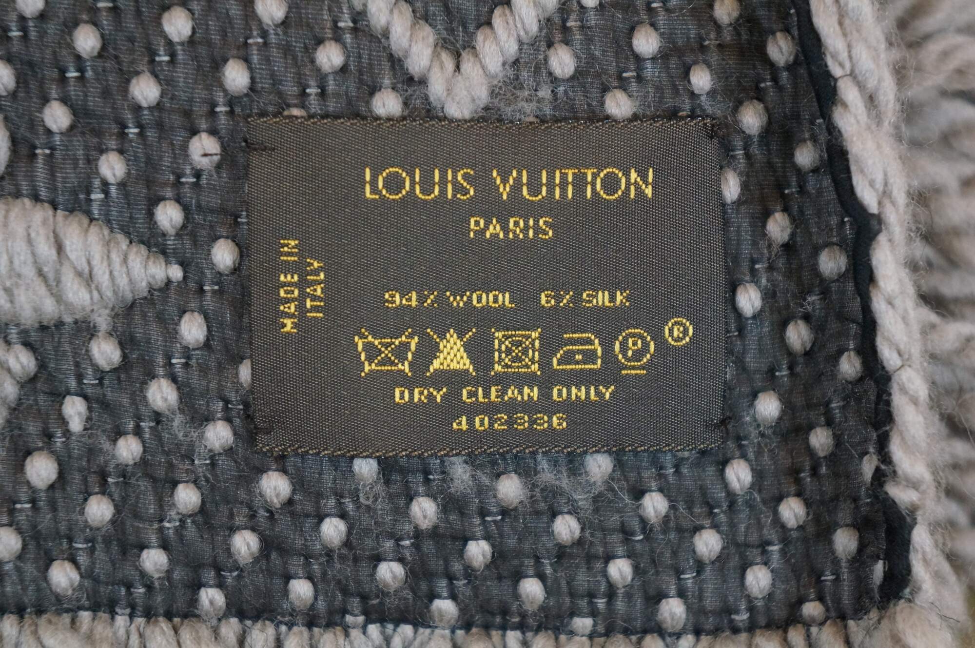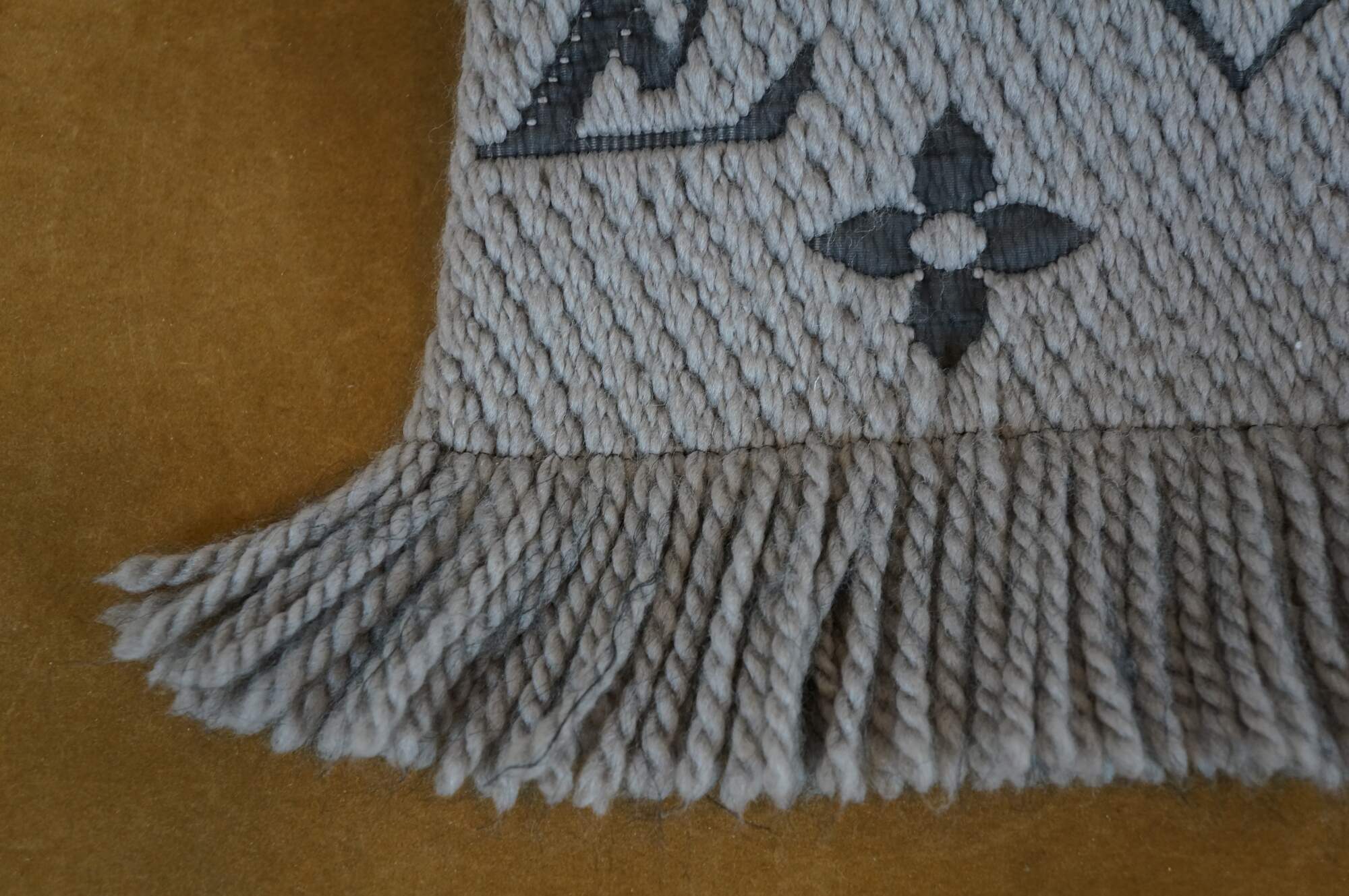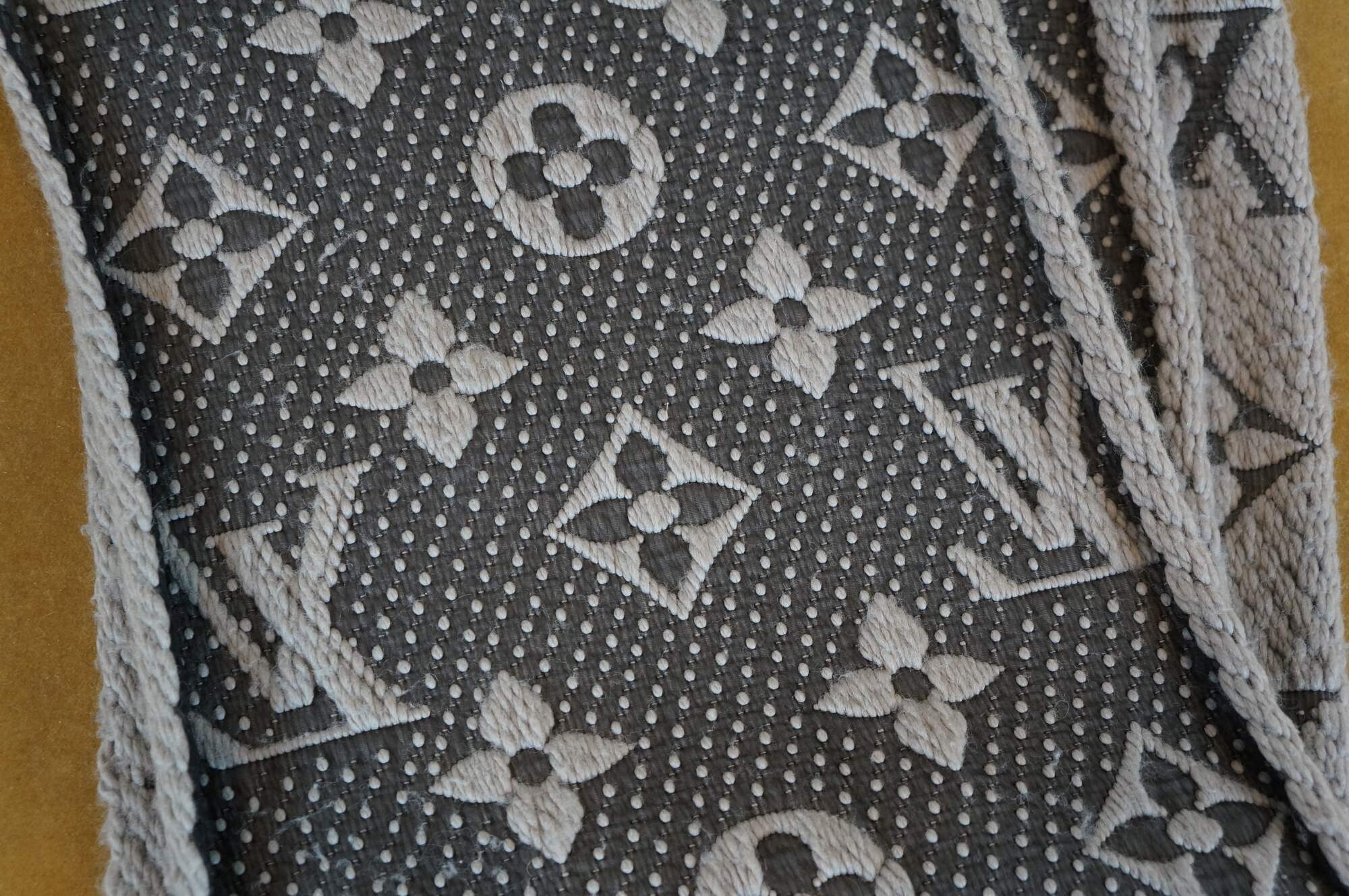 Louis Vuitton Paris 94% Wool / 6% Silk Monogram scarf in gray / taupe with fringe. Made in Italy.