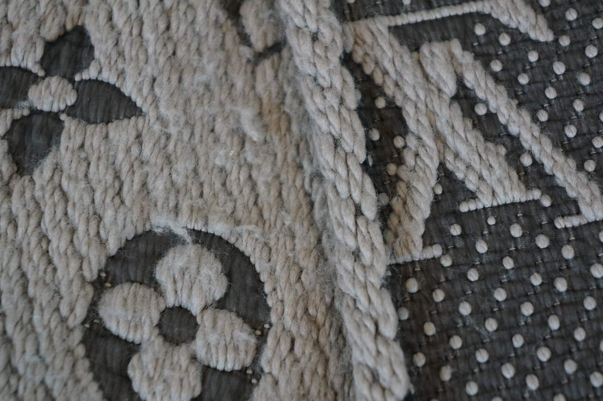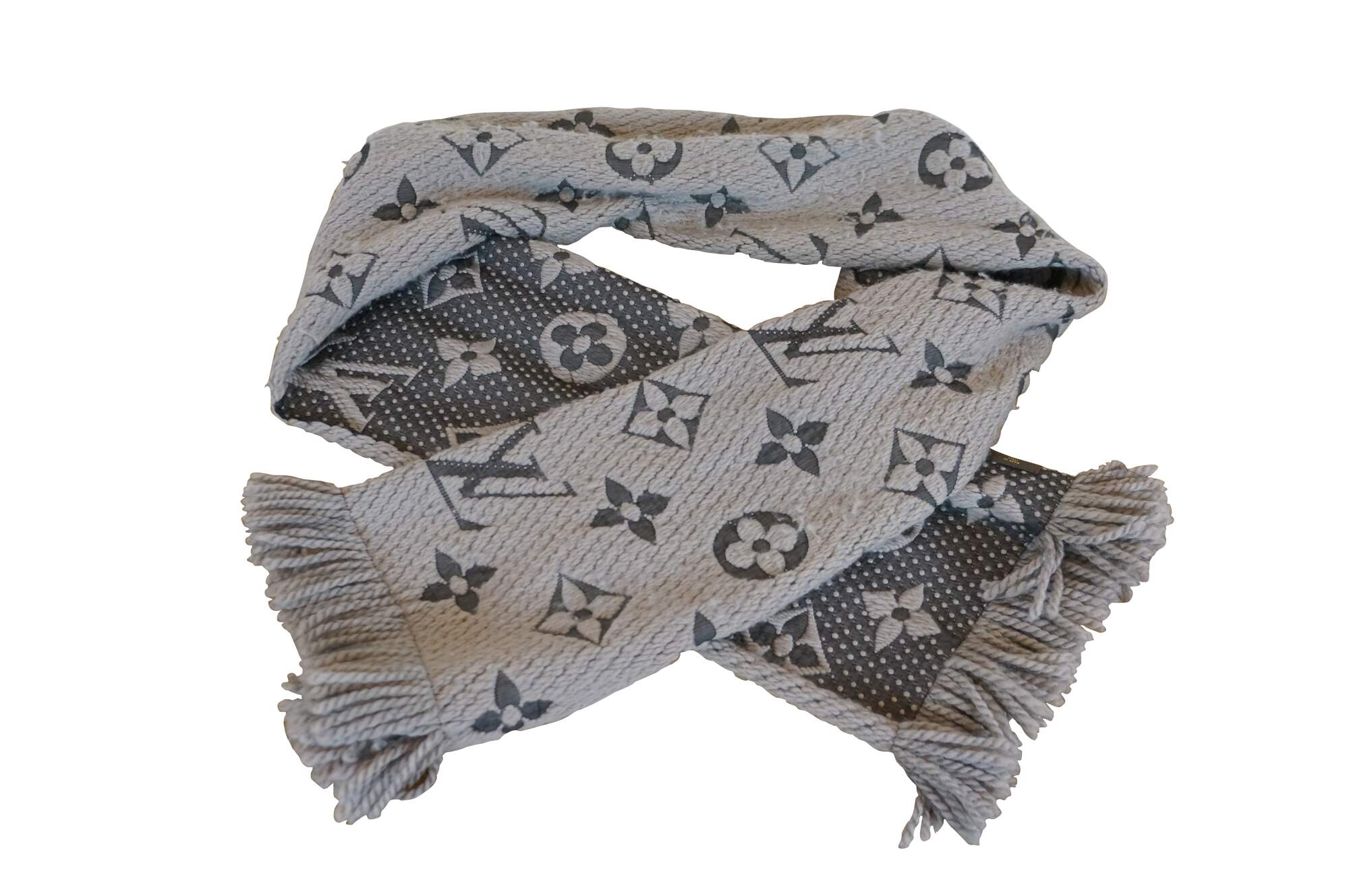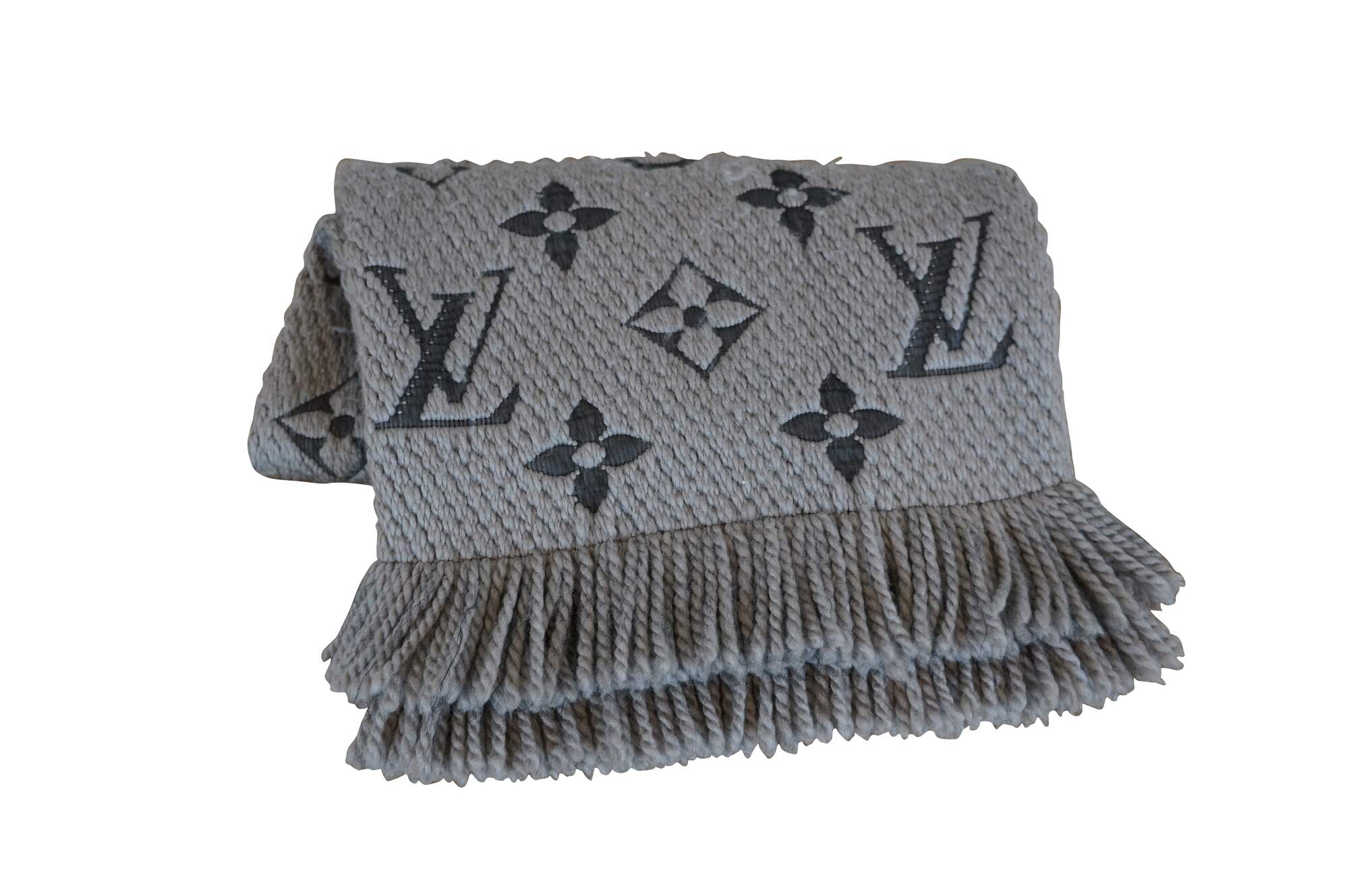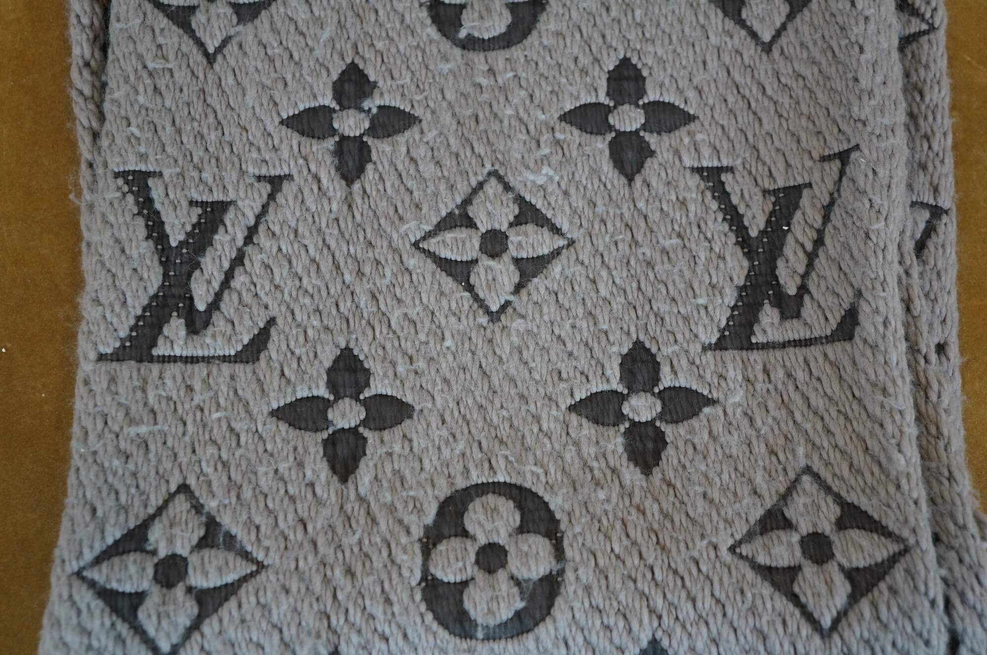Louis Vuitton Paris 94% Wool / 6% Silk Monogram scarf in gray / taupe with fringe. Made in Italy.