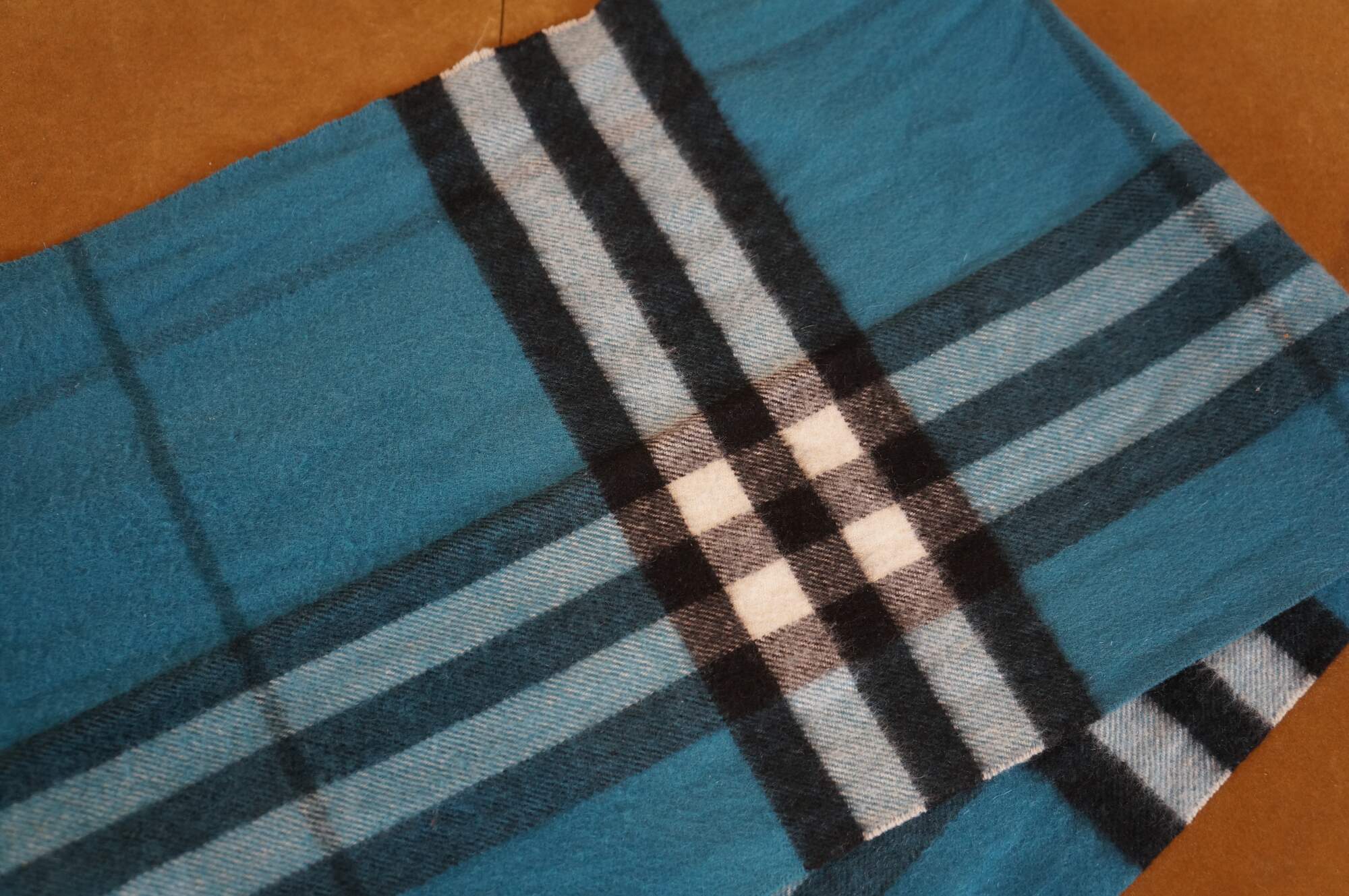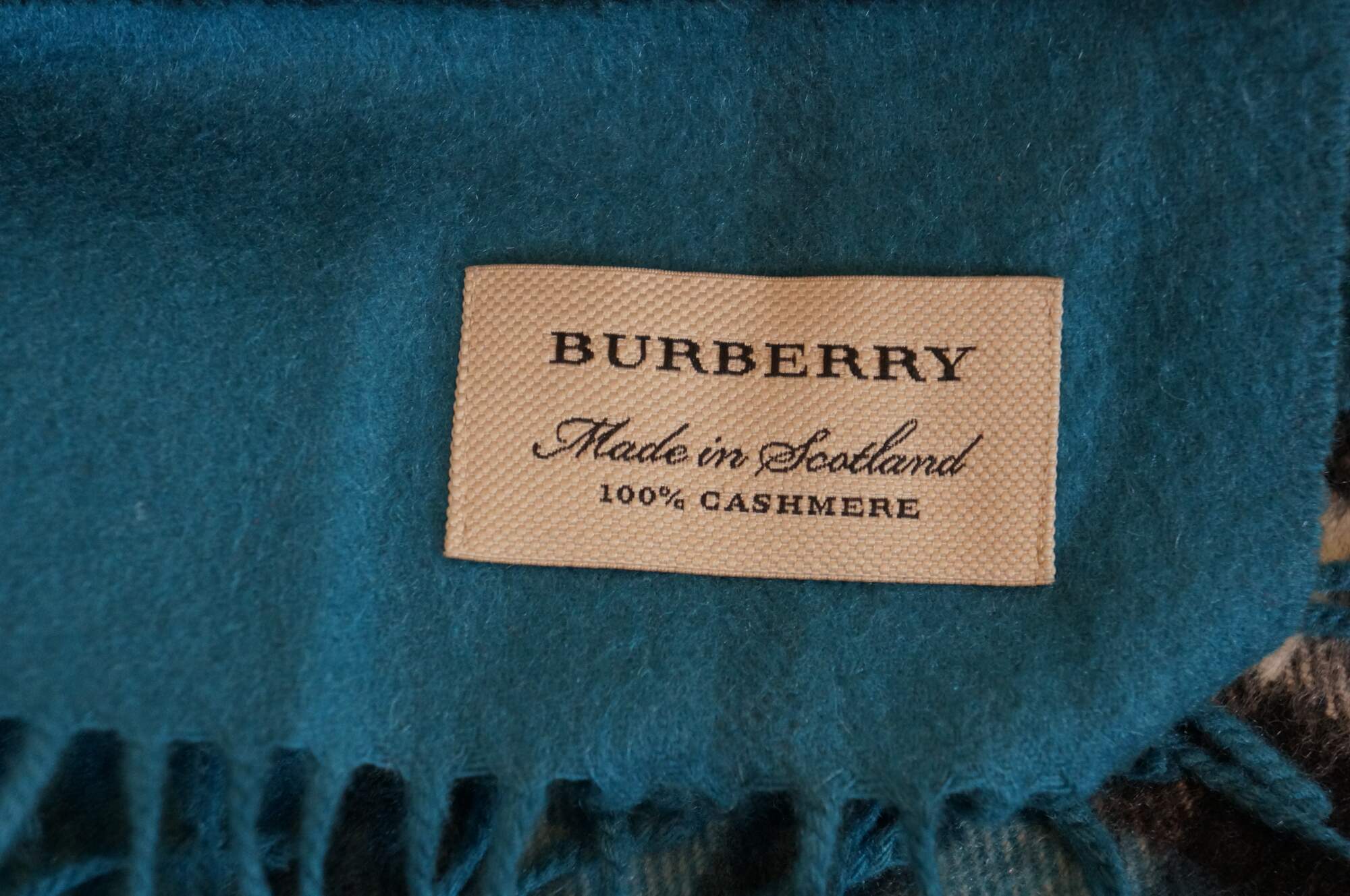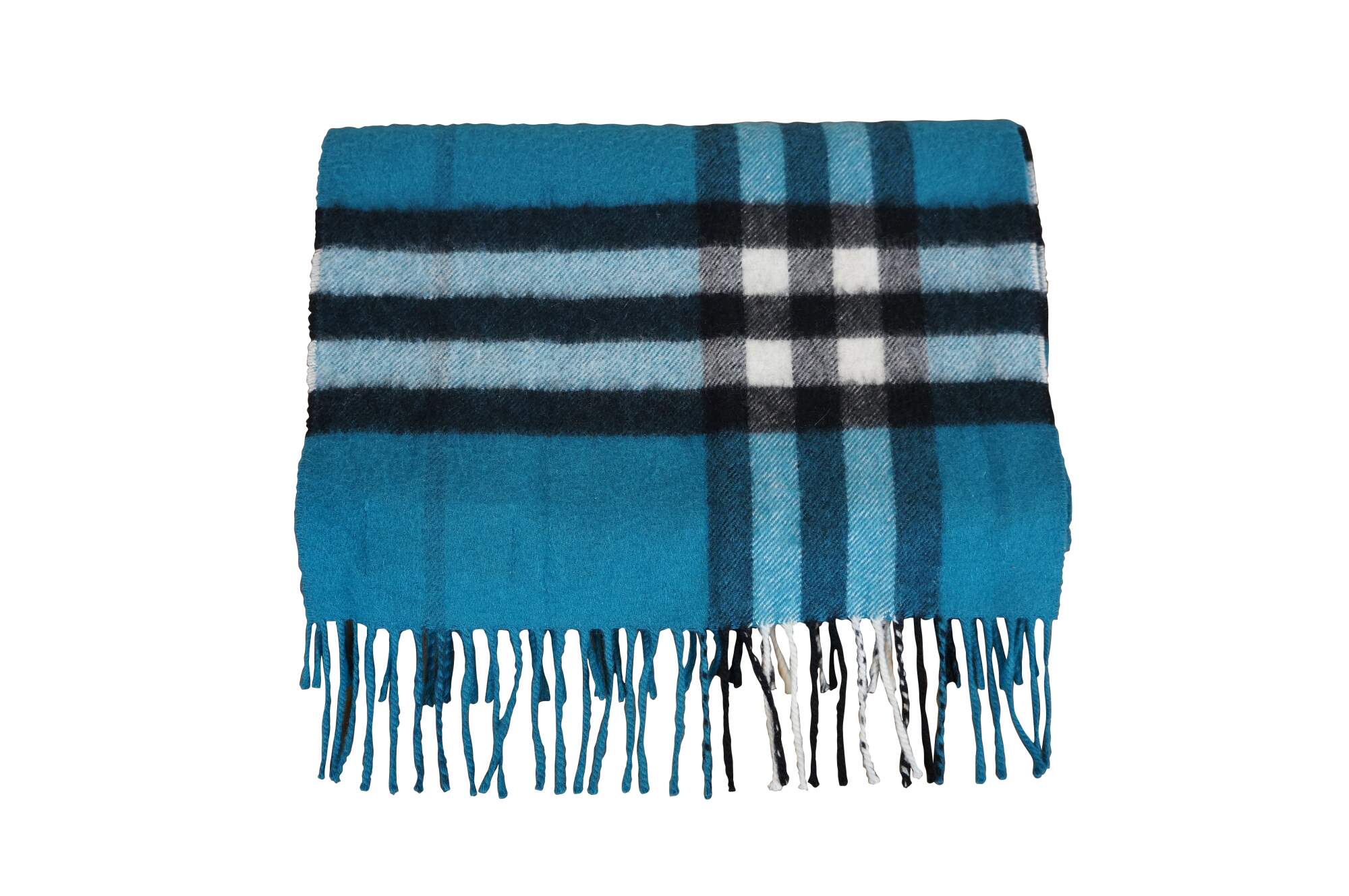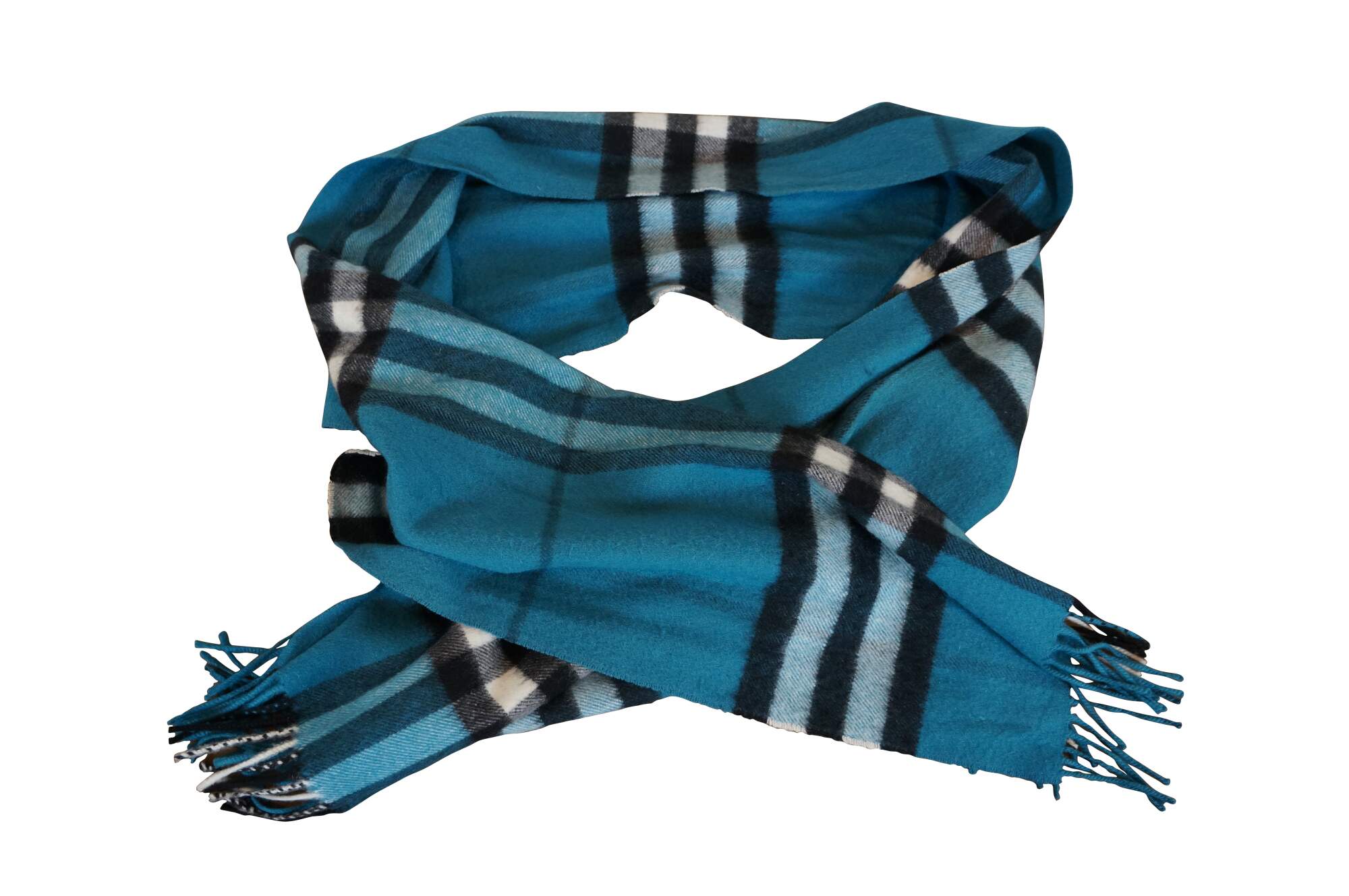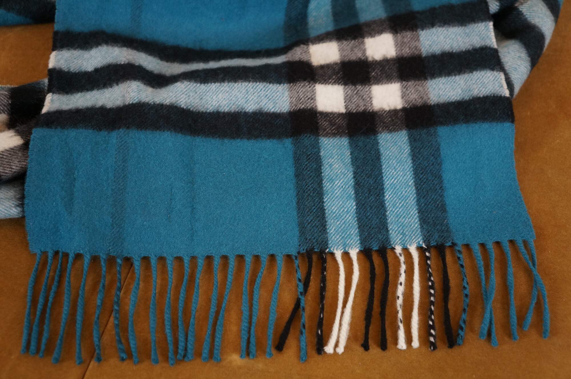 Burberry London 100% Cashmere scarf in teal / turquoise Nova check with fringe. "The iconic Burberry Check cashmere scarf, made in Scotland at a mill founded in 1797. Woven on traditional looms, the scarf takes more than 30 steps to complete. The fabric is washed in local spring water and brushed with teasels – dried flowers that are drawn along the surface of the cashmere to 'raise' the cloth, creating a natural lustre and ultra-soft finish.
