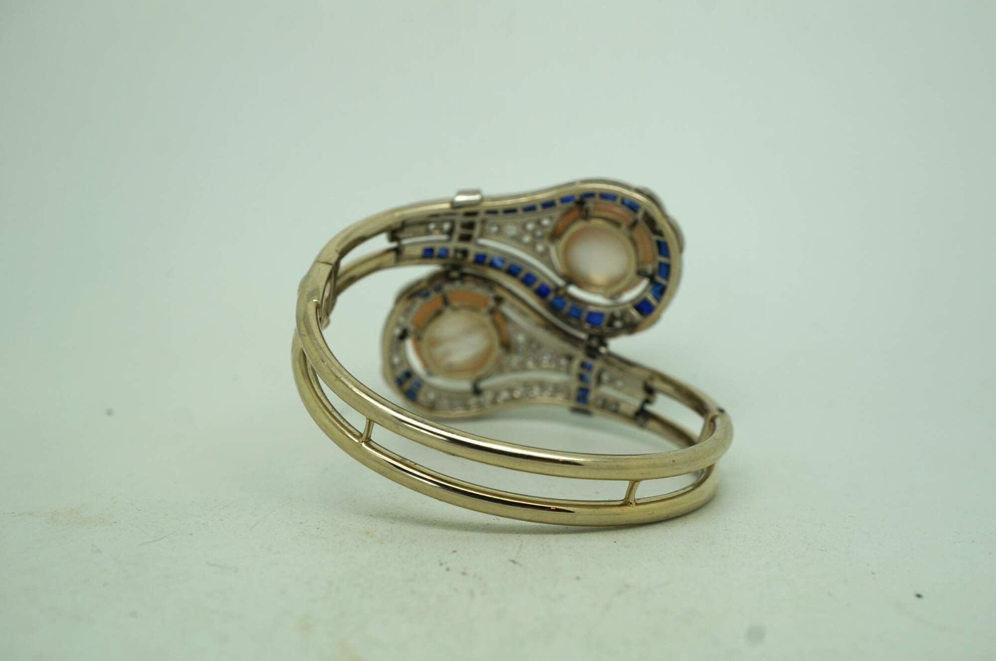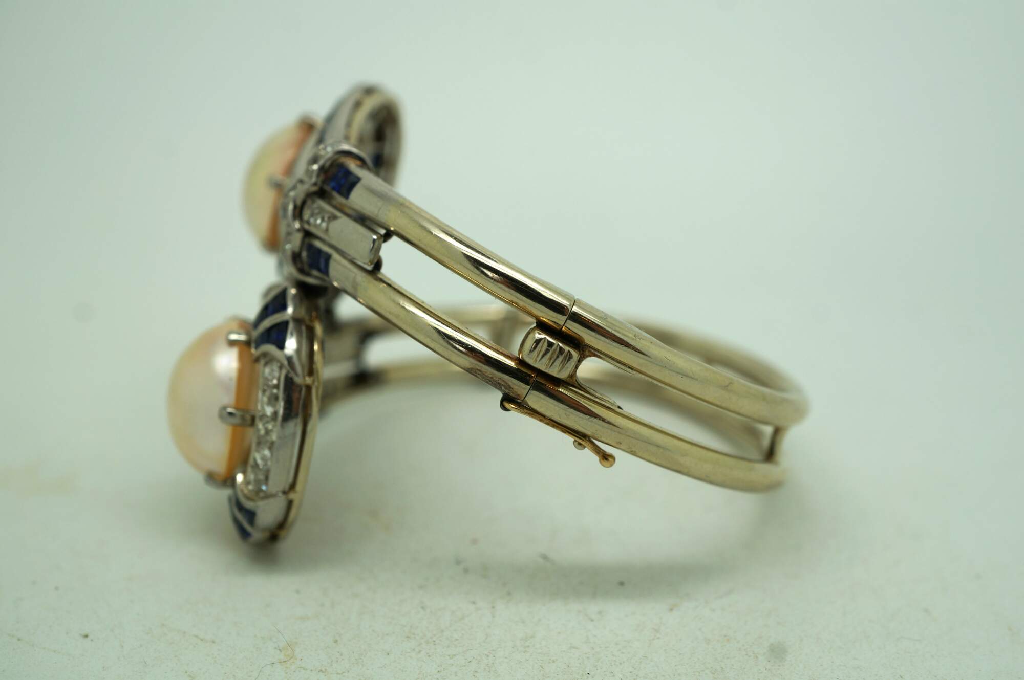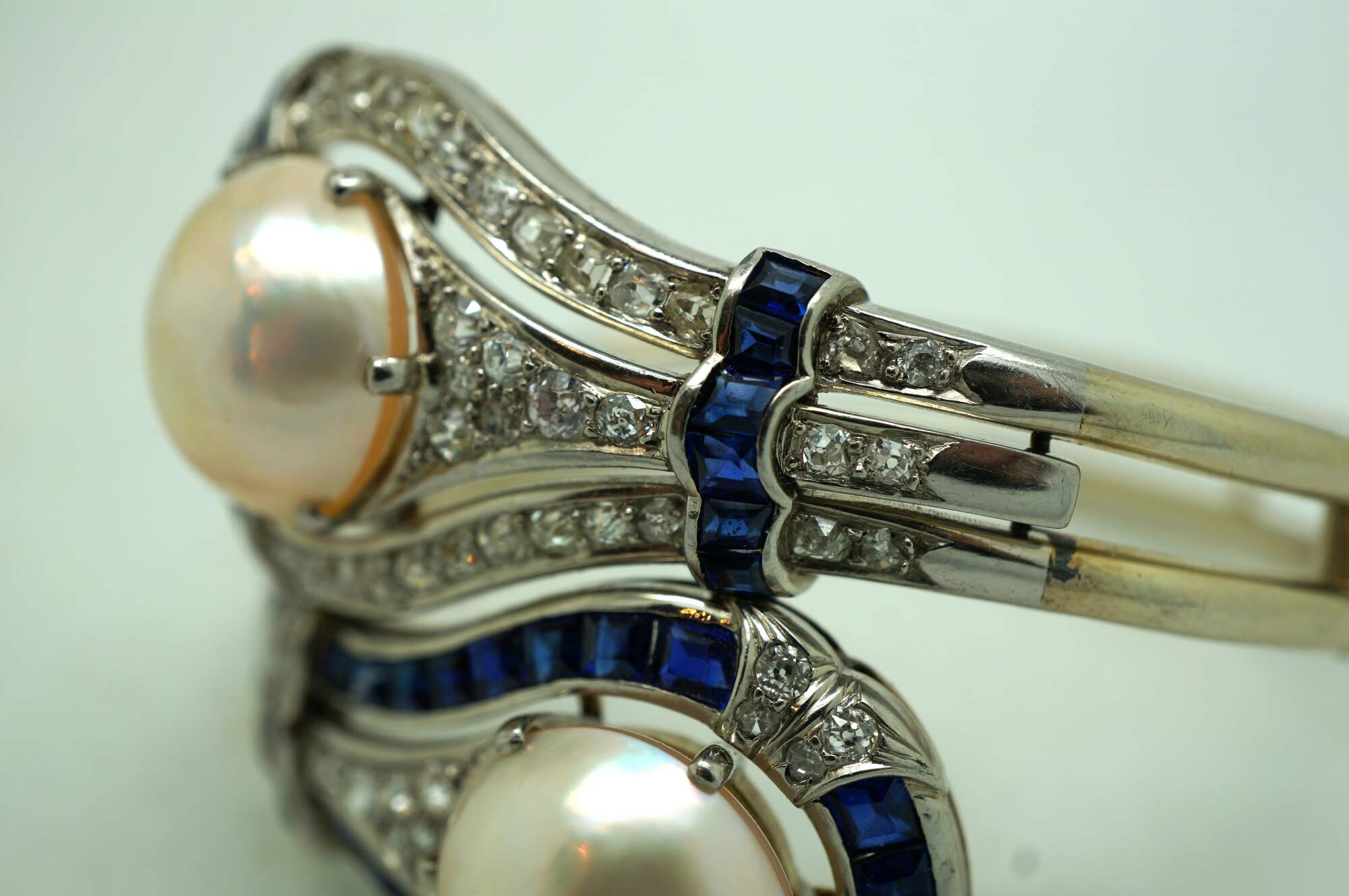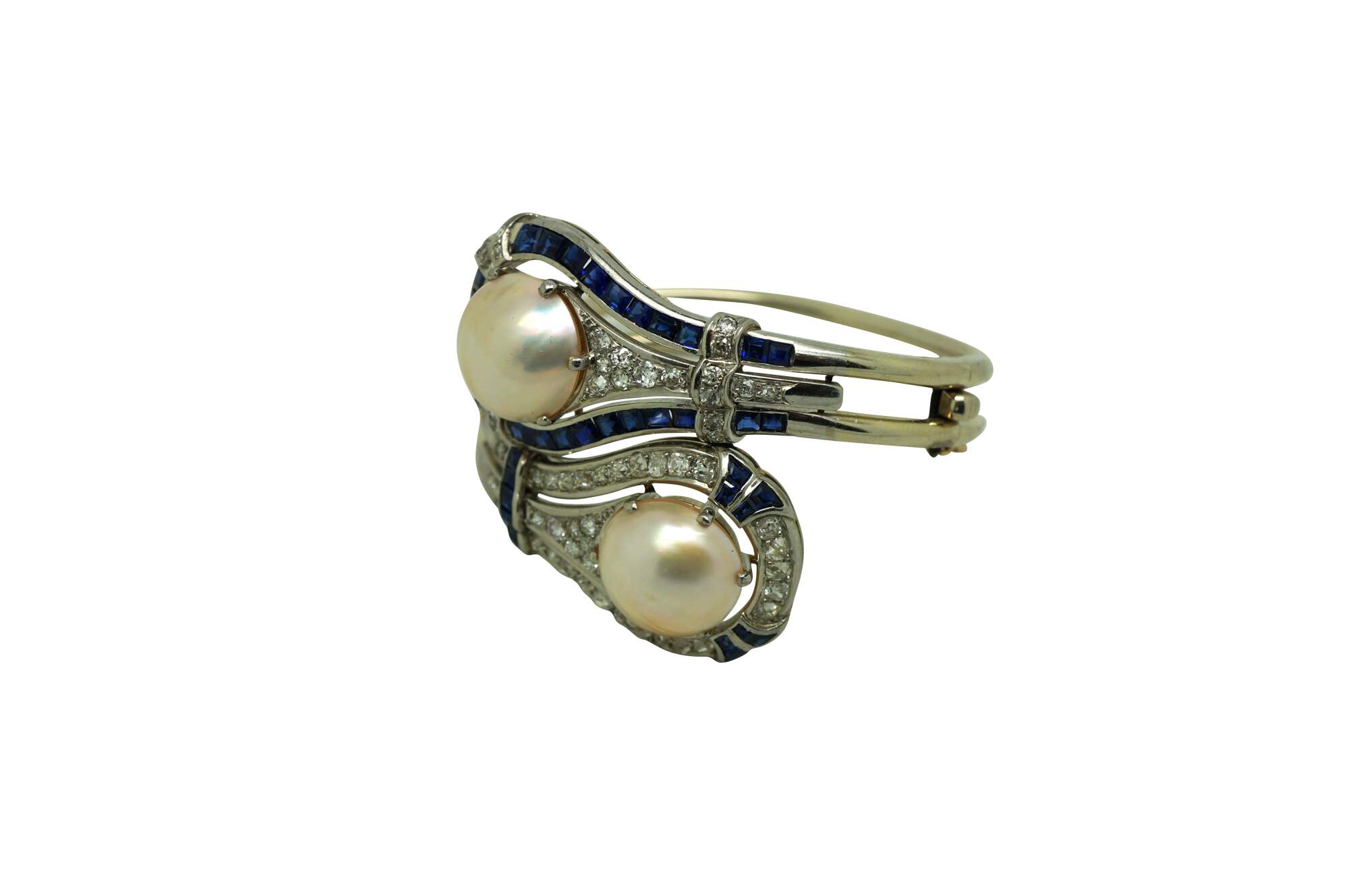 1970s Vintage 14K white gold crossover bracelet. Features two large pearls surrounded by overlapped bands of deep blue sapphires and white diamonds.