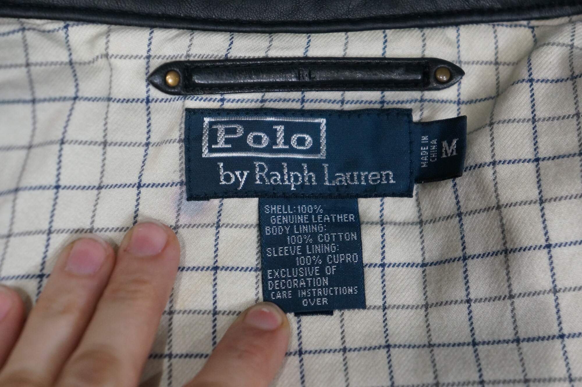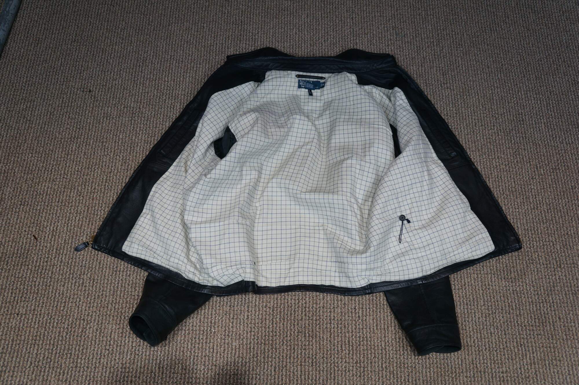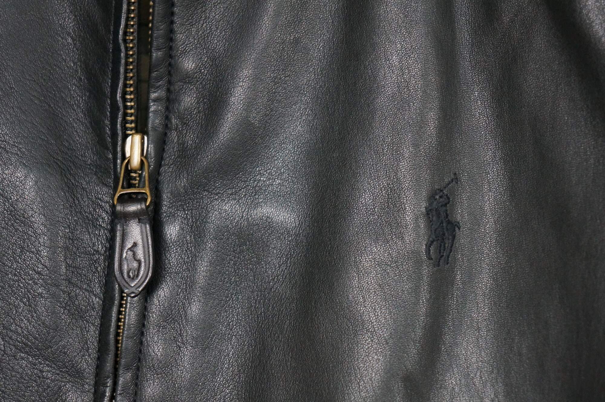 Polo Ralph Lauren black leather windbreaker style jacket. Zipper closure. Adjustable tabs at hem and cuffs. Blue and white checked cotton lining. Two exterior pockets. Polo pony logo at left chest. Made in China