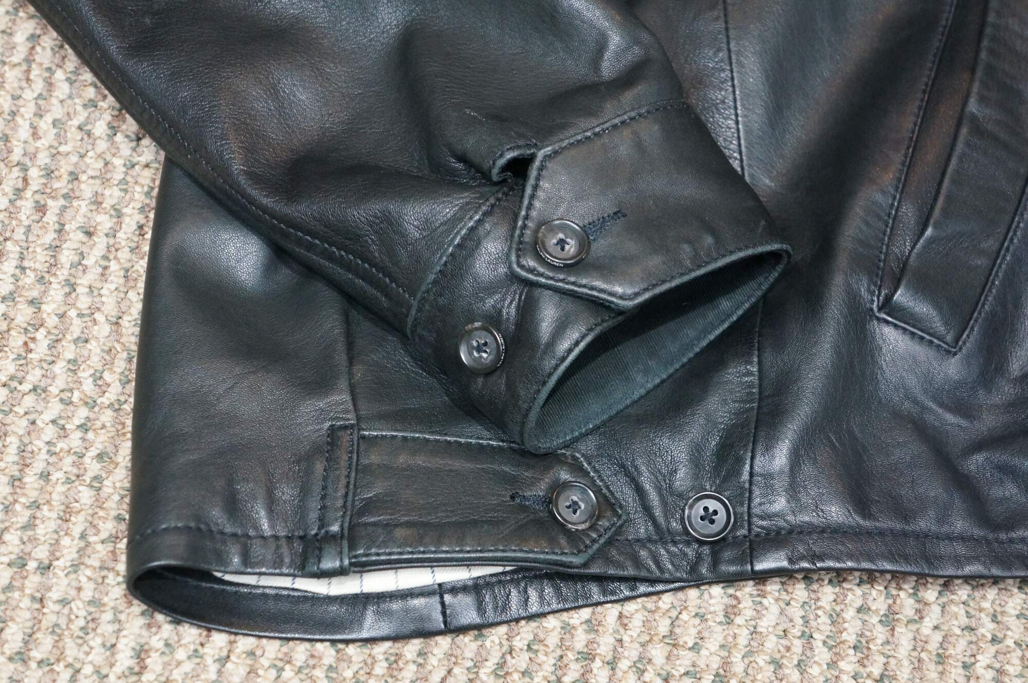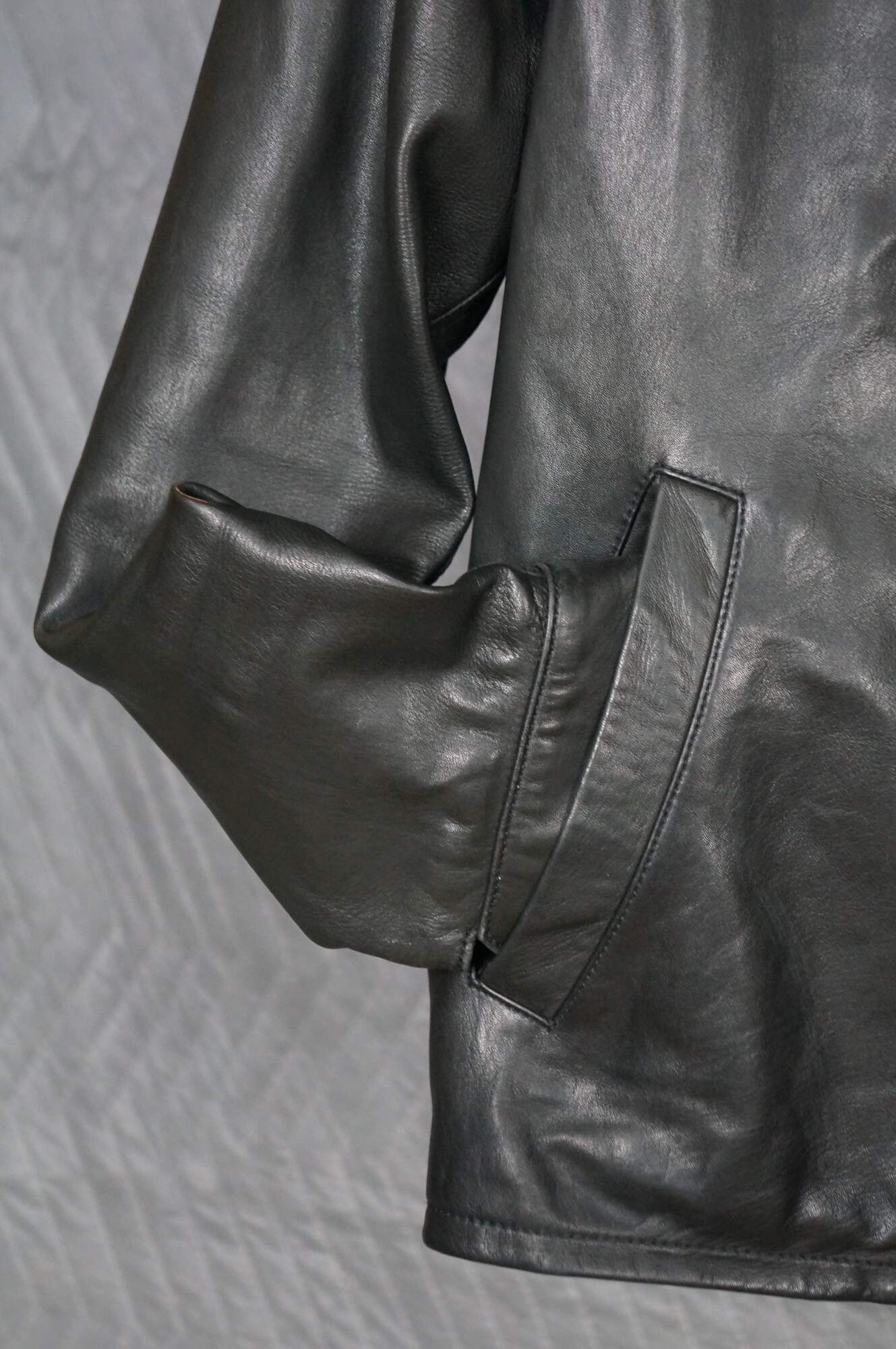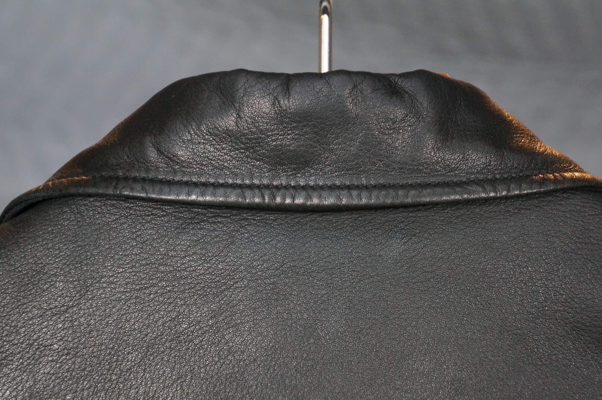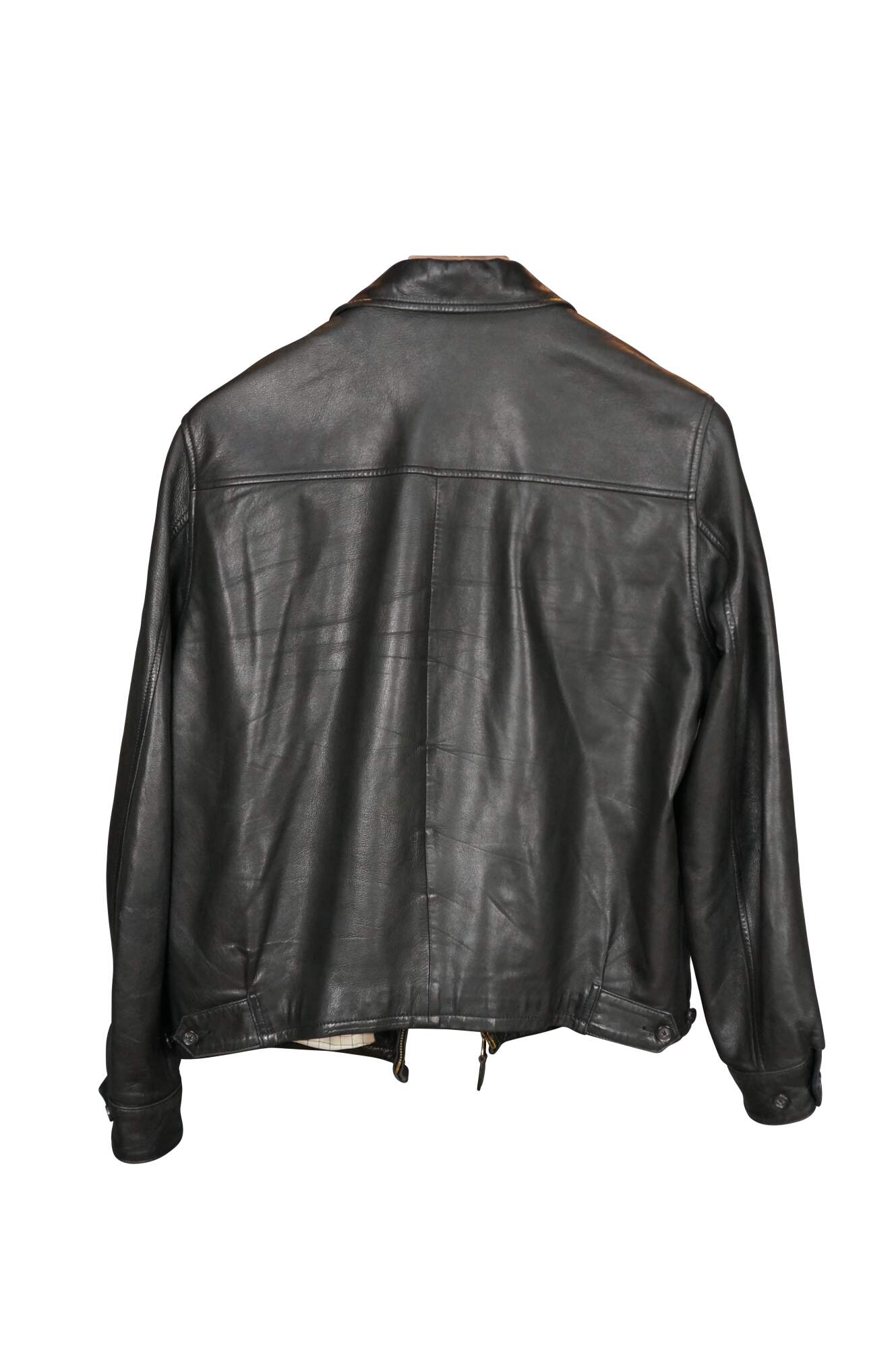 Polo Ralph Lauren black leather windbreaker style jacket. Zipper closure. Adjustable tabs at hem and cuffs. Blue and white checked cotton lining. Two exterior pockets. Polo pony logo at left chest. Made in China