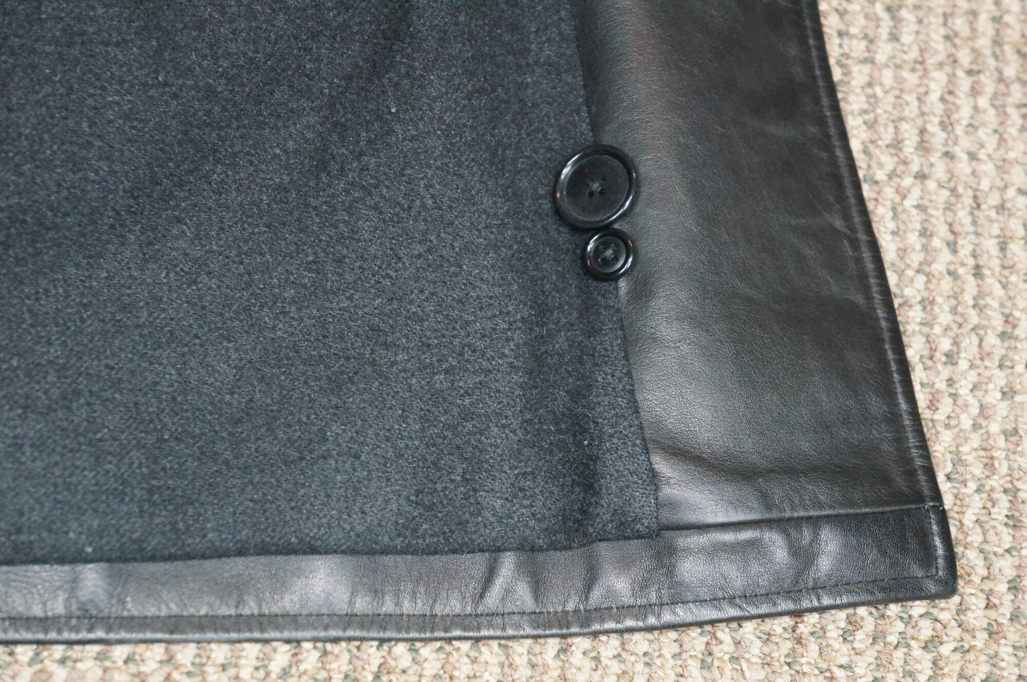 Circa 1990's Polo Ralph Lauren men's black leather winter jacket / car coat with wool / ployester lining. Button front closure. One interior breast pocket, button closure. Two outer pockets with flaps. Made in China.