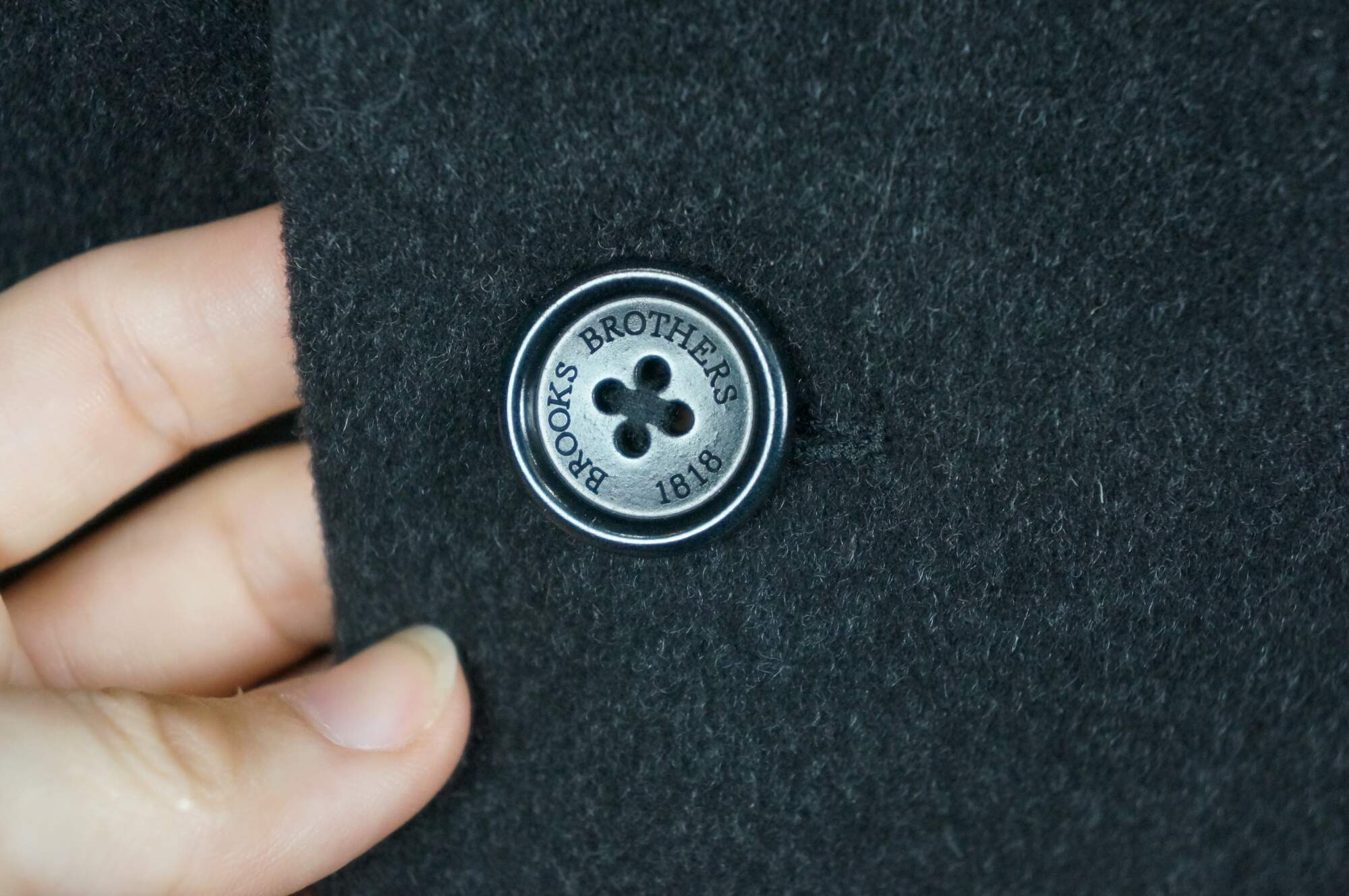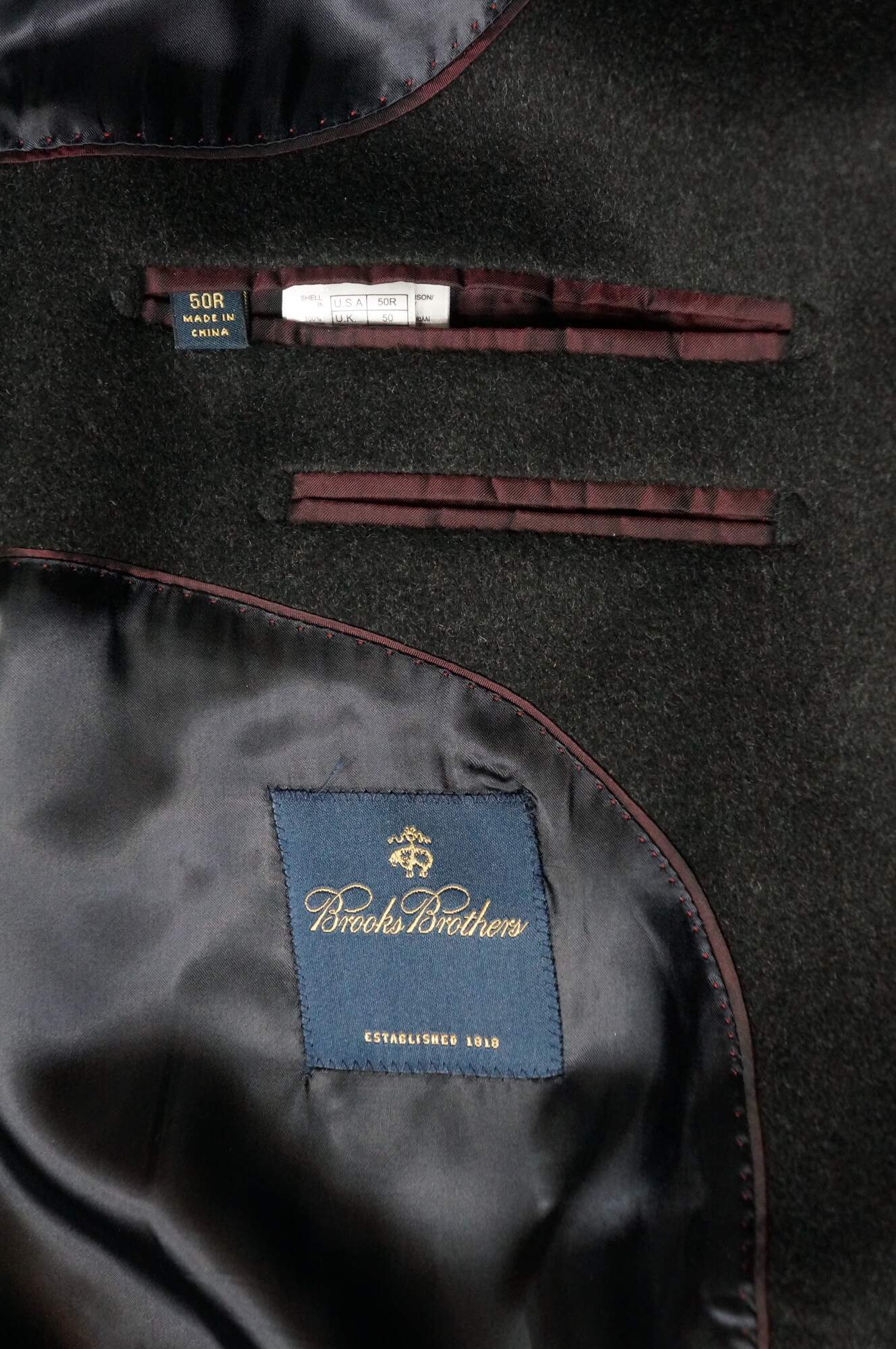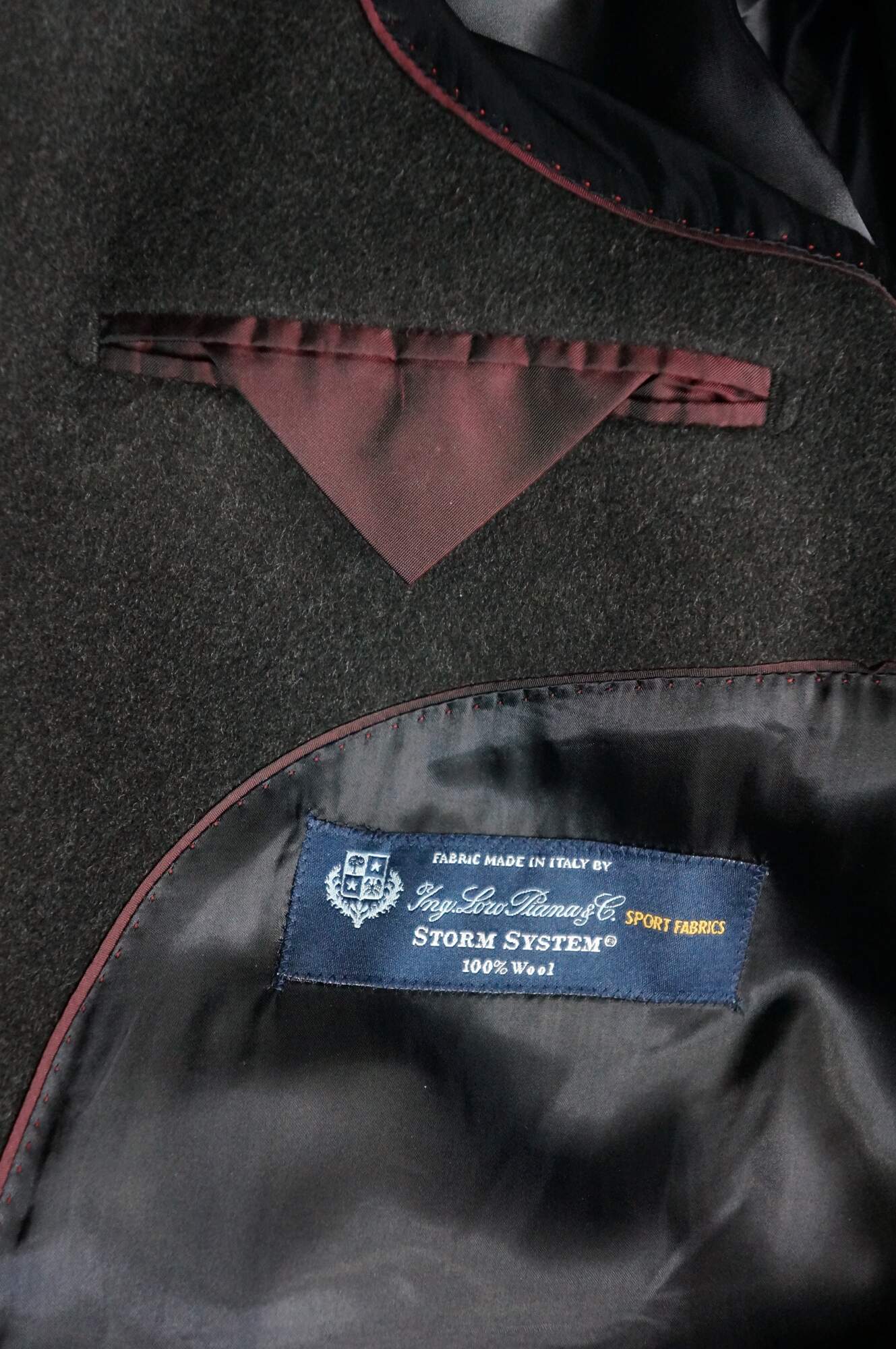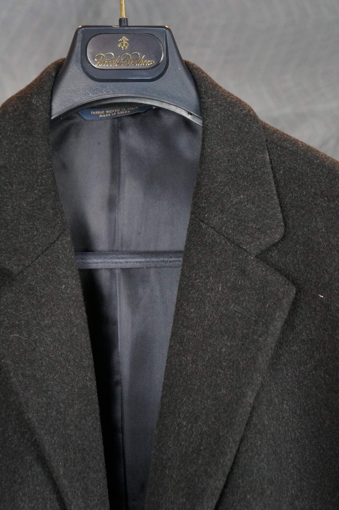 Vintage Brooks Brothers charcoal gray wool men's overcoat/polo coat. Button closure. Two exterior hip pockets. Black lining with burgundy contrast. Three interior breast pockets, and two interior hip pockets. Fabric Woven in Italy by Ing. Loro Piana & Co Sport Fabrics. Storm System 100% Wool.