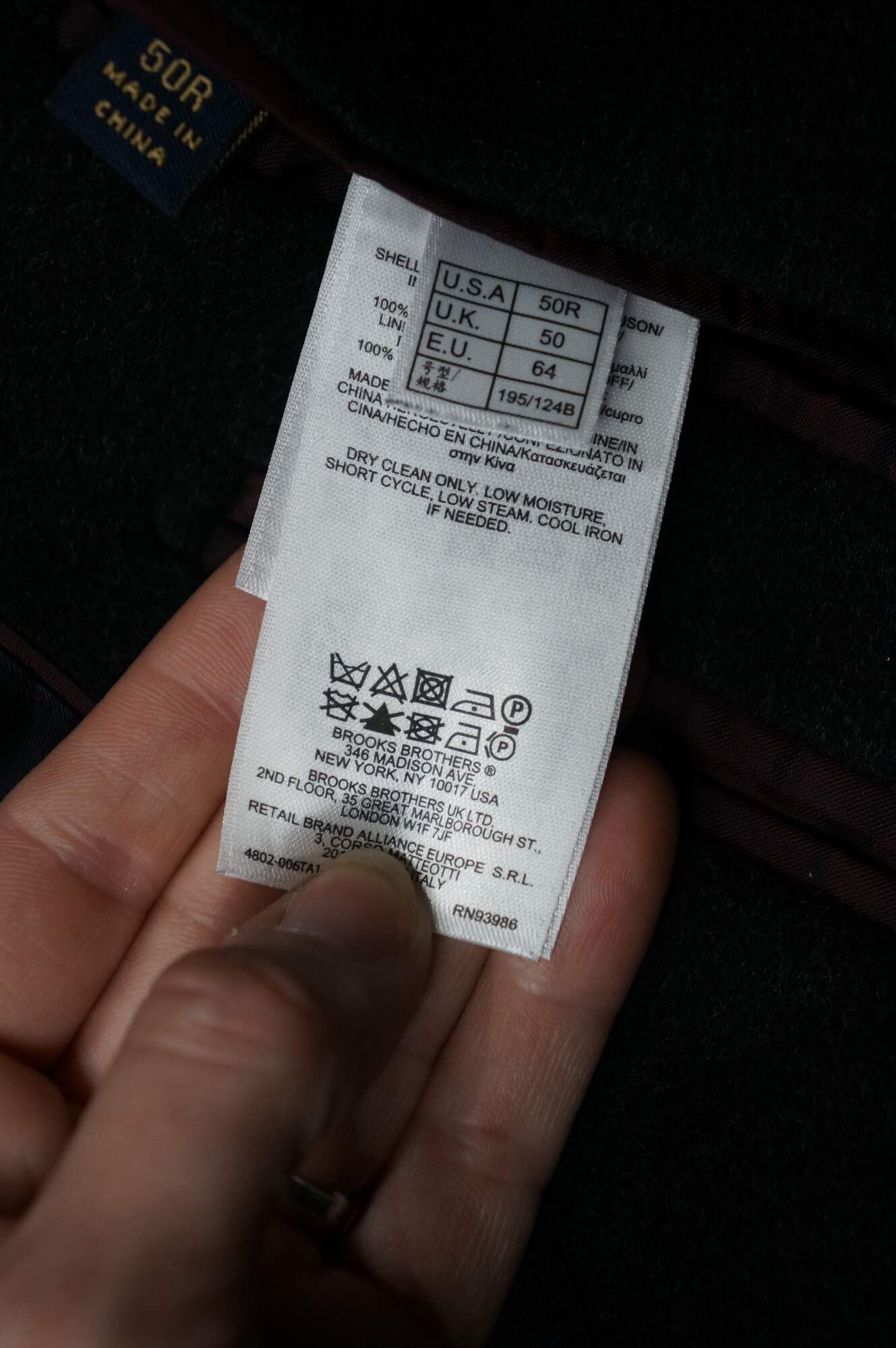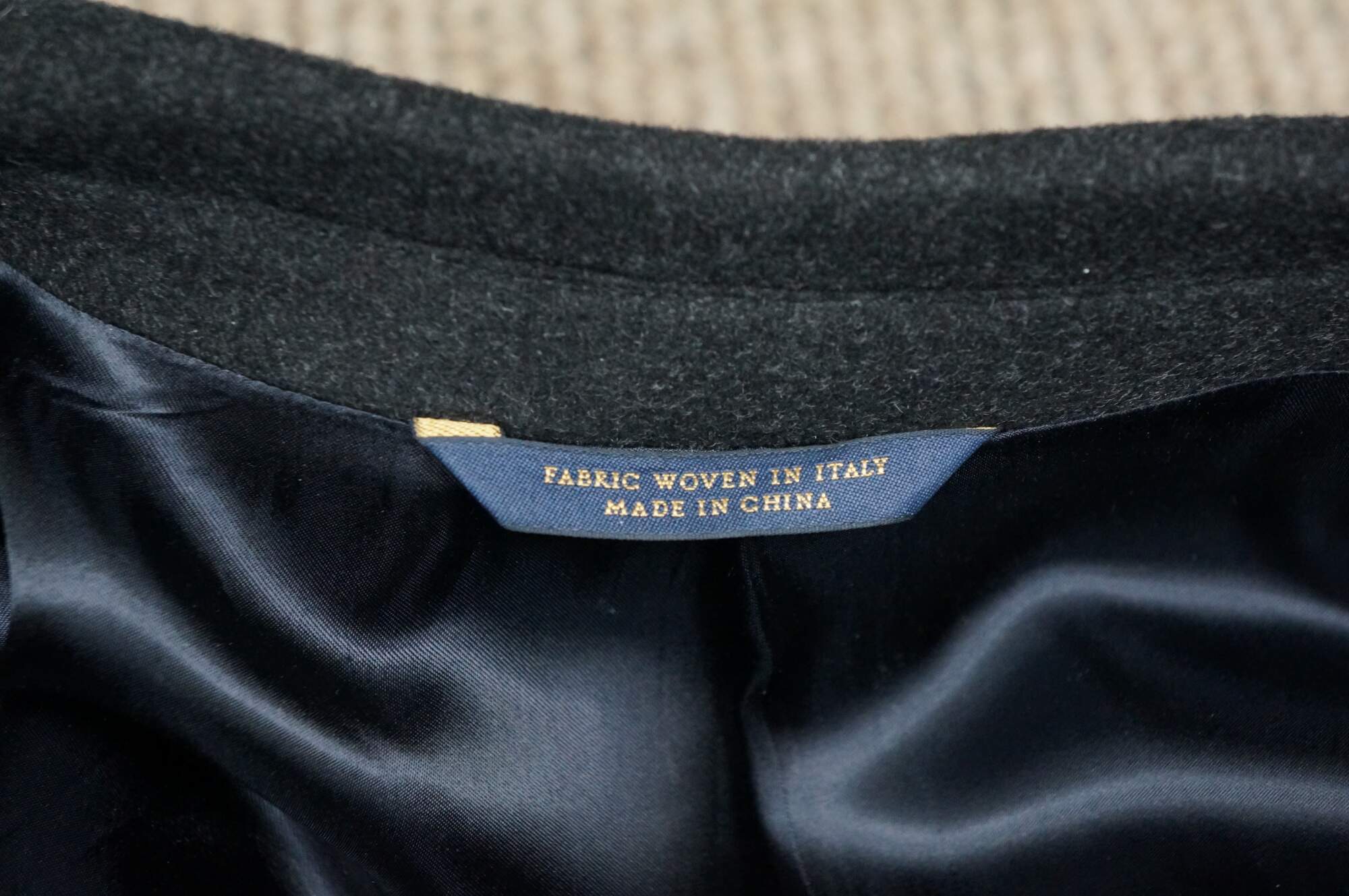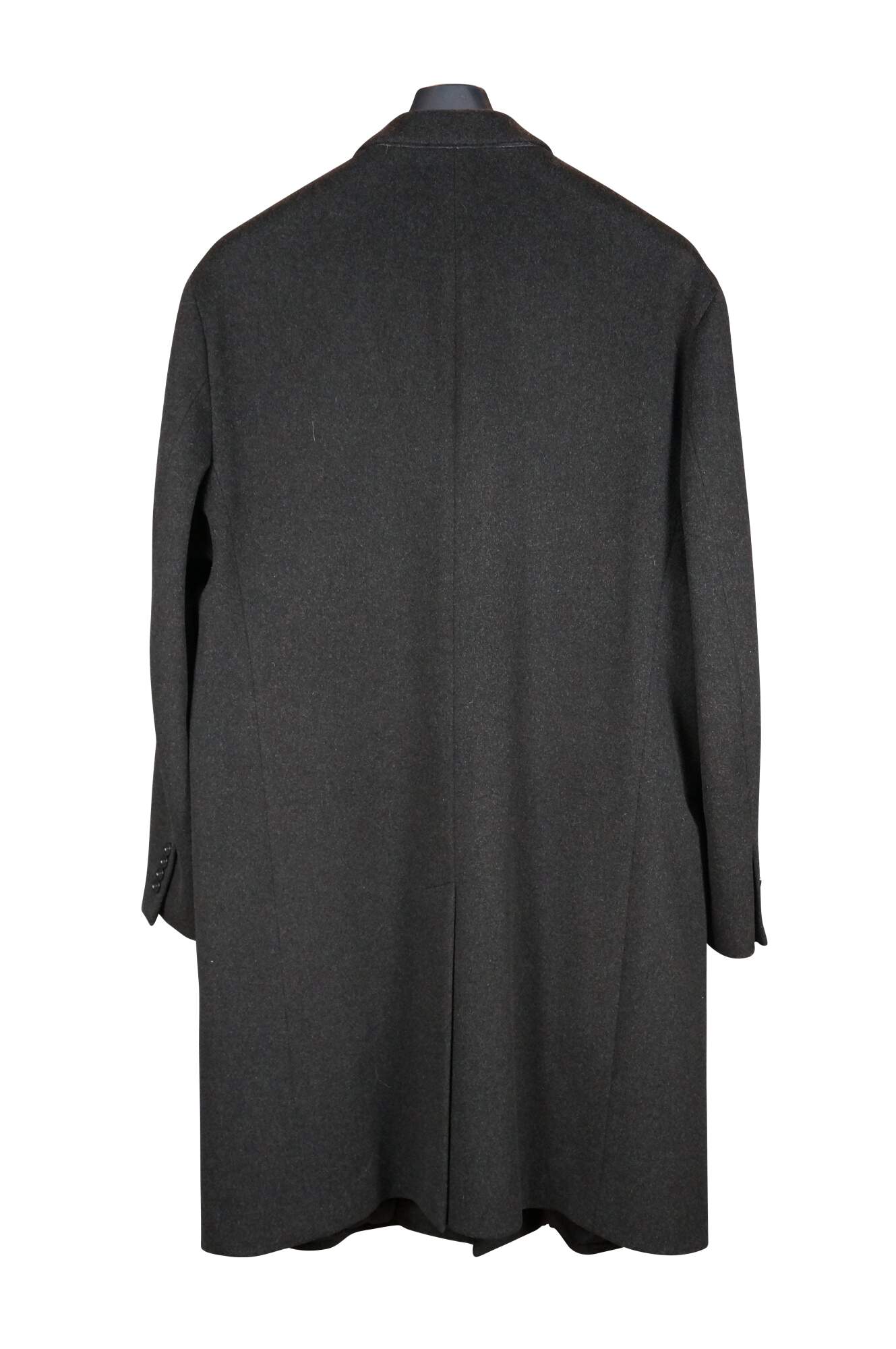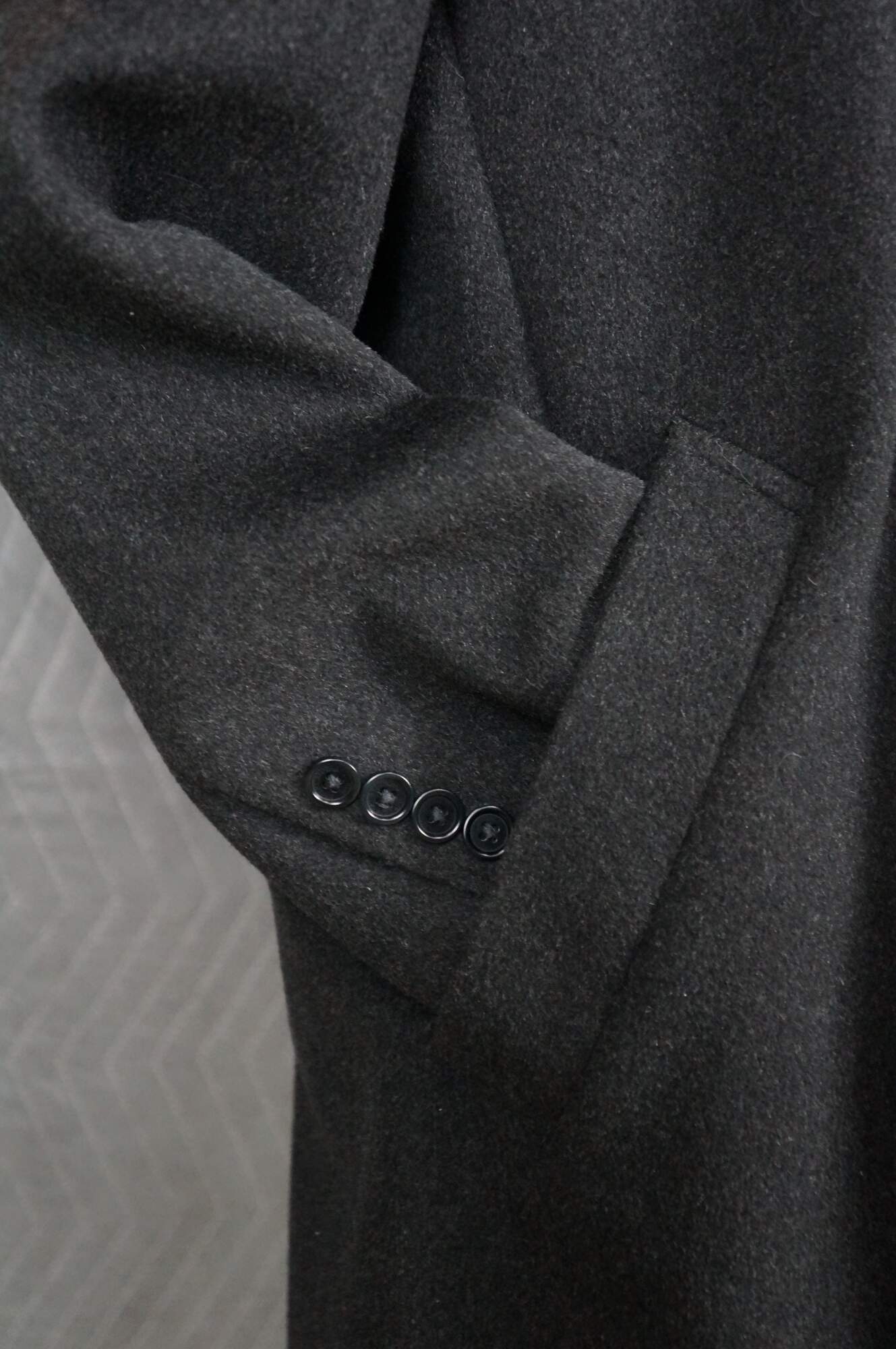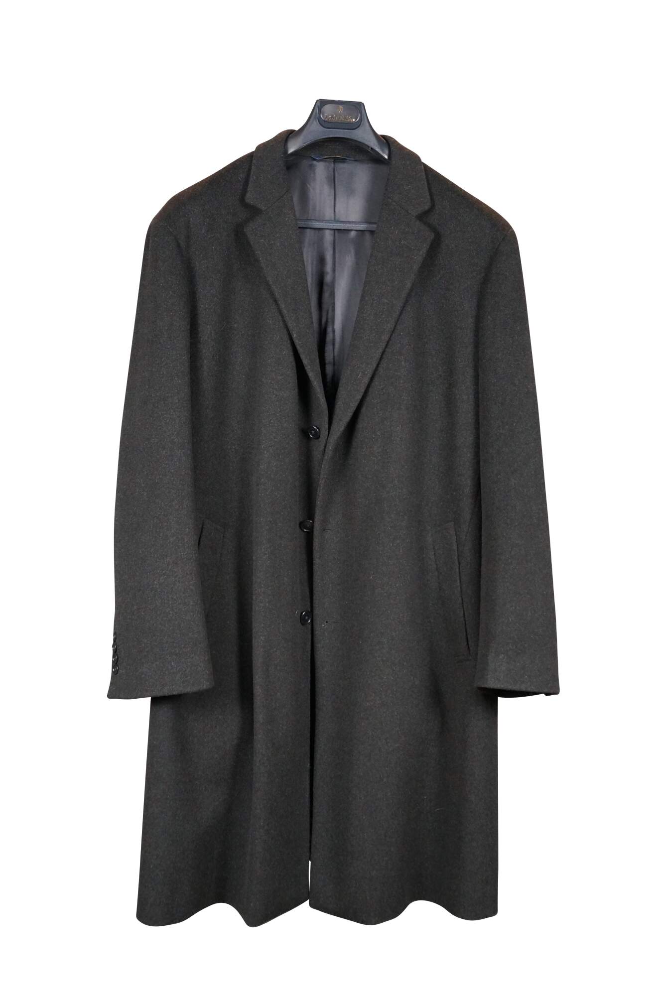 Vintage Brooks Brothers charcoal gray wool men's overcoat/polo coat. Button closure. Two exterior hip pockets. Black lining with burgundy contrast. Three interior breast pockets, and two interior hip pockets. Fabric Woven in Italy by Ing. Loro Piana & Co Sport Fabrics. Storm System 100% Wool.