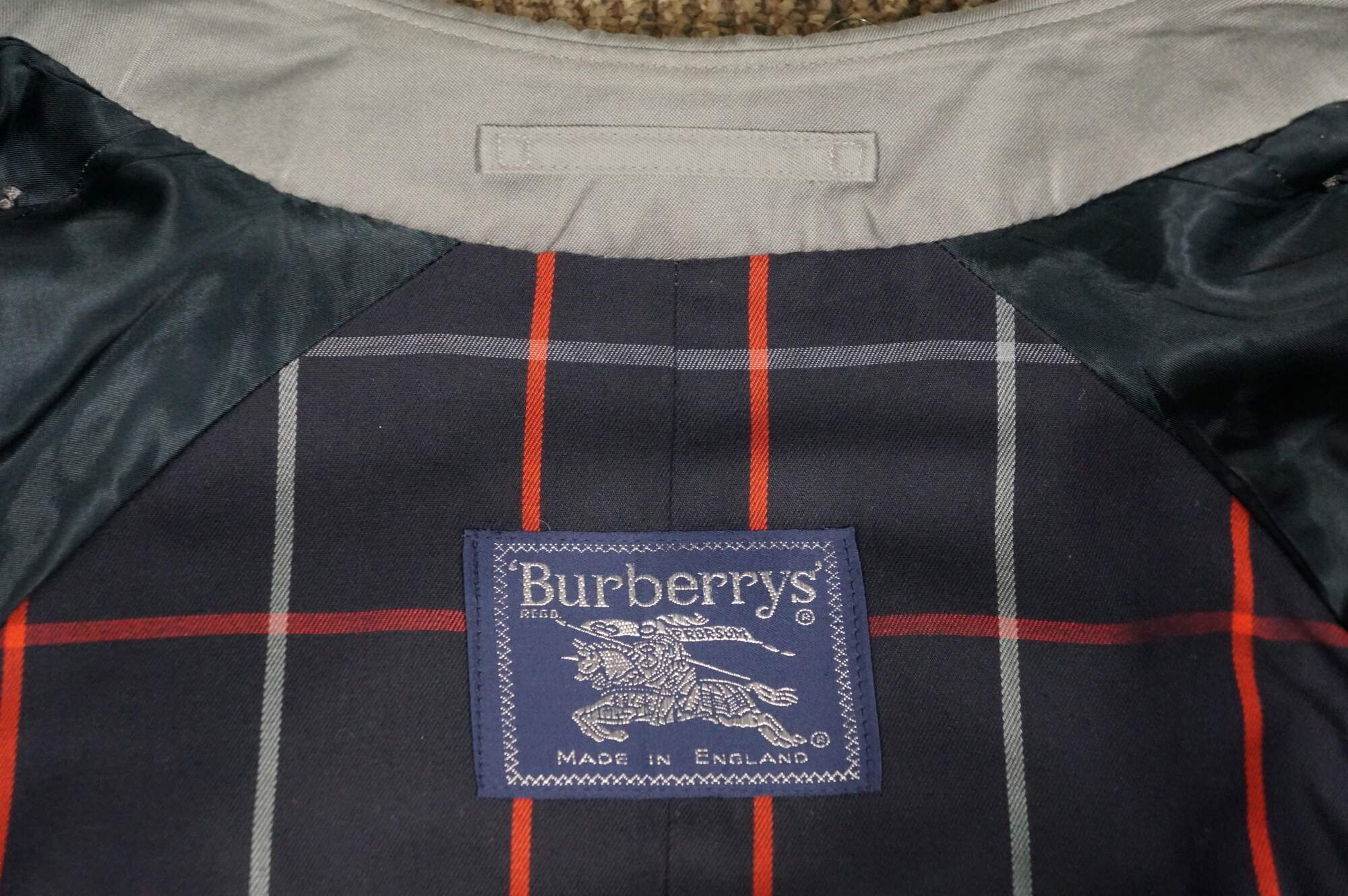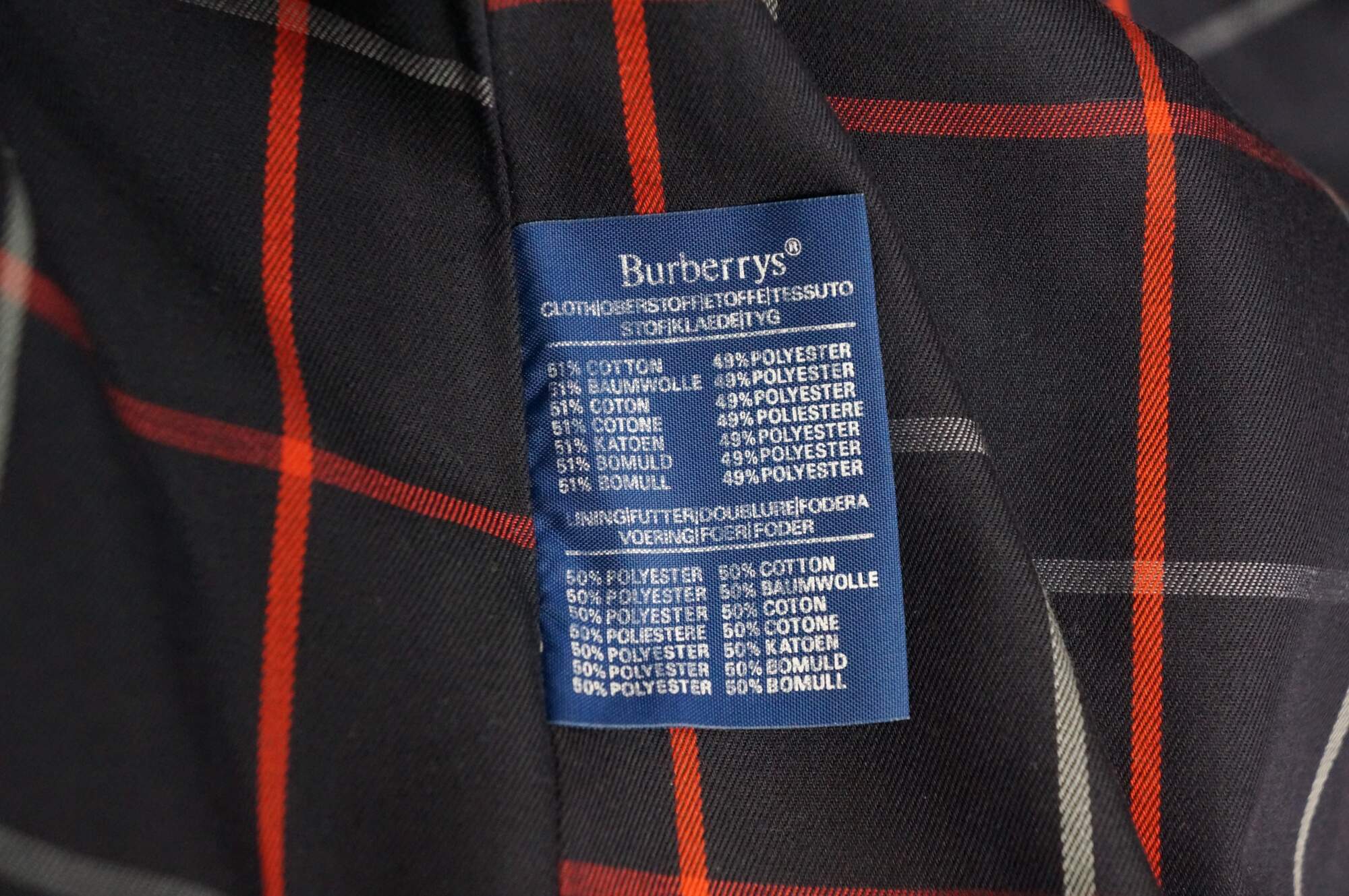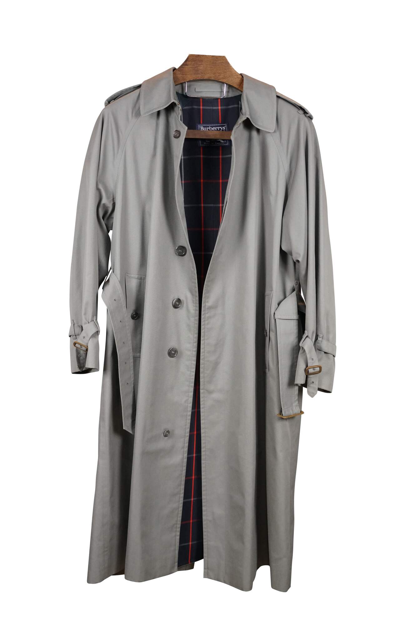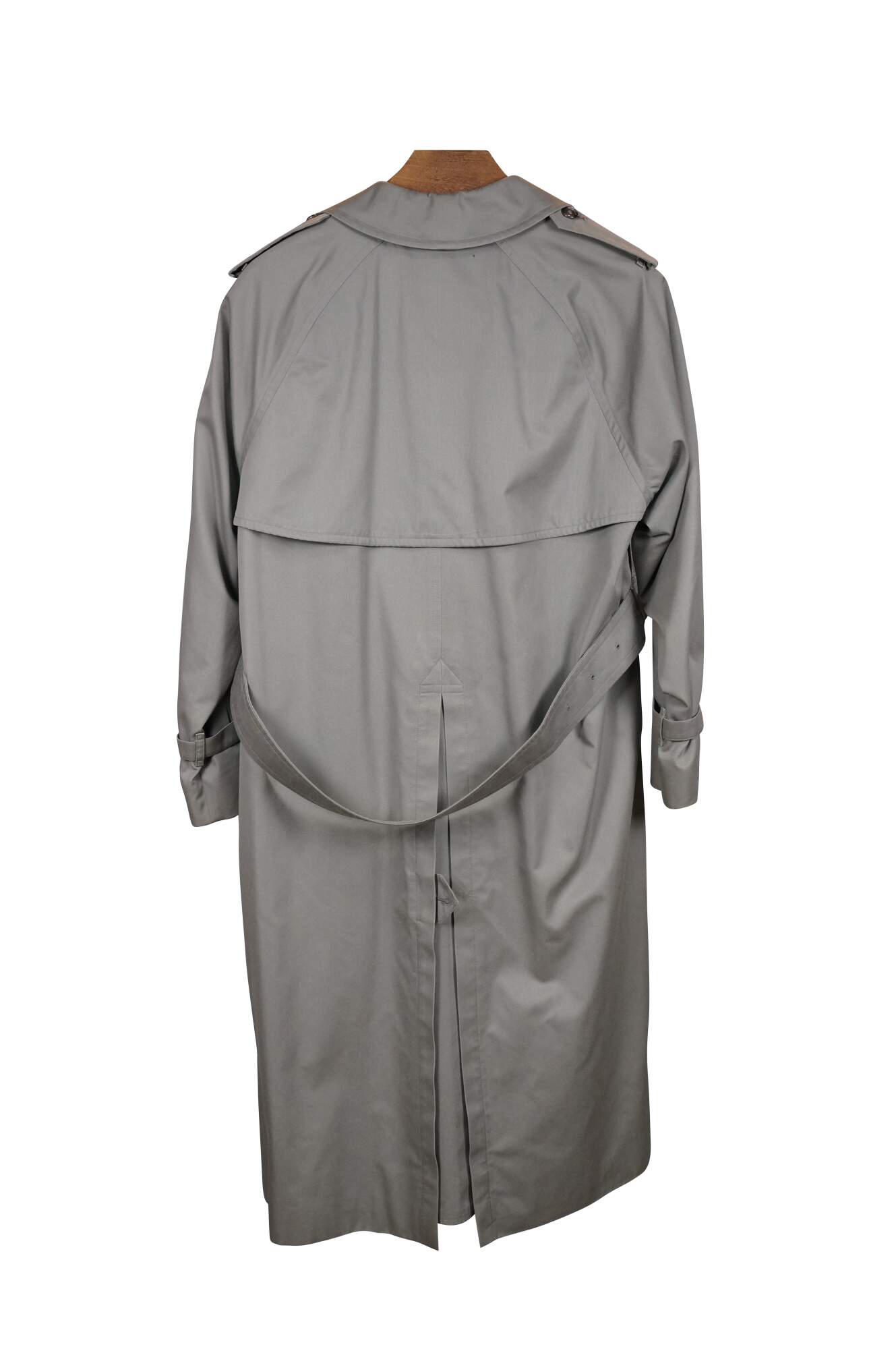 Vintage Burberry's London men's light gray double-breasted trench coat/ rain jacket. Concealed button closure. Two exterior hip pockets, button closure. 51% Cotton / 49% Polyester Shell. Black and red plaid cotton/poly blend lining. Wrist adjustable, buckle. Removable belt.