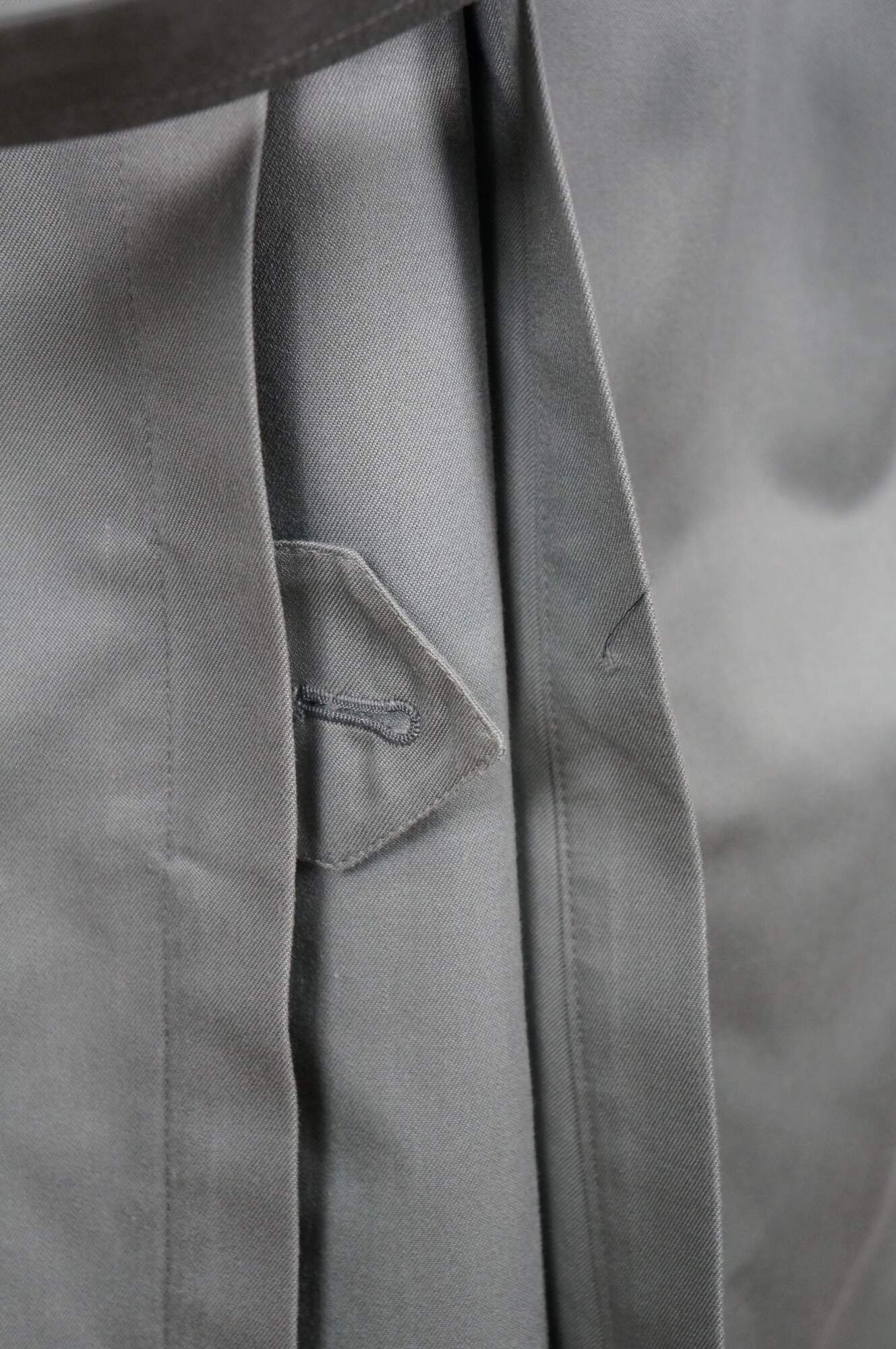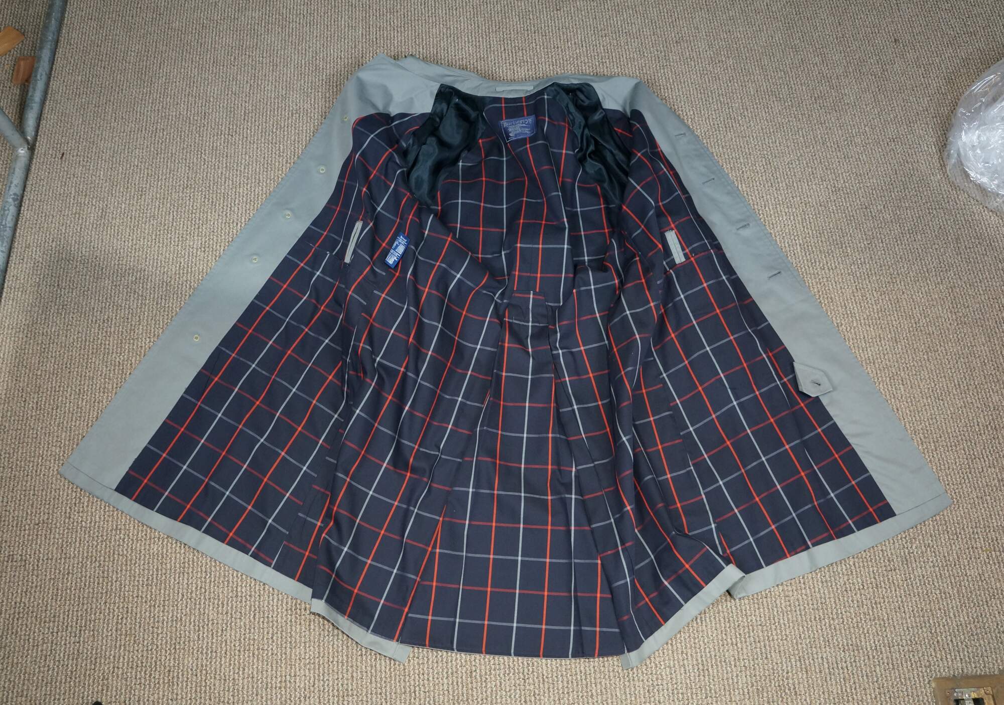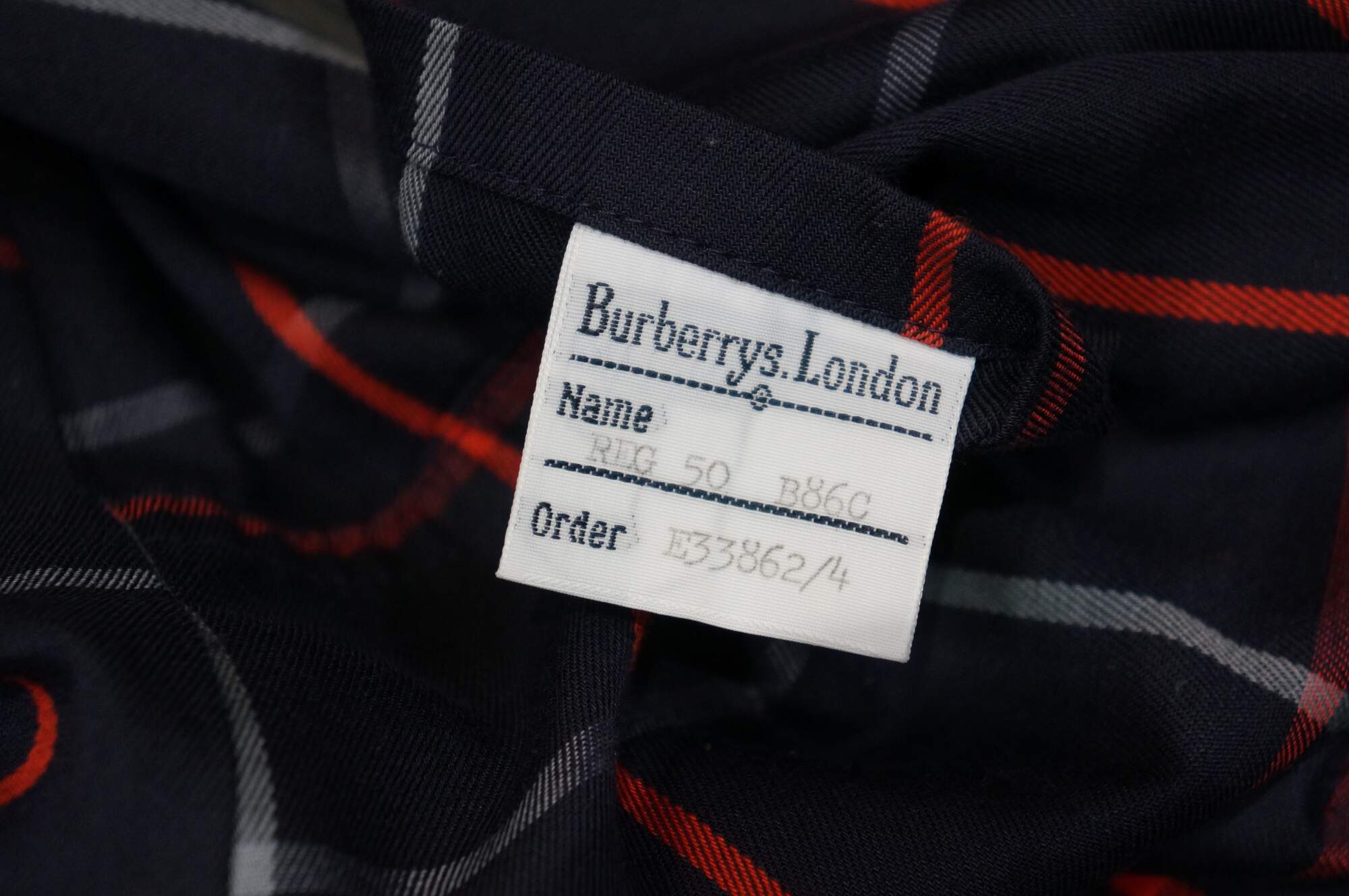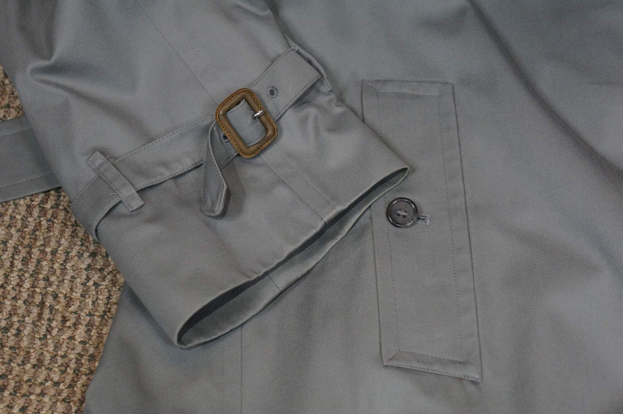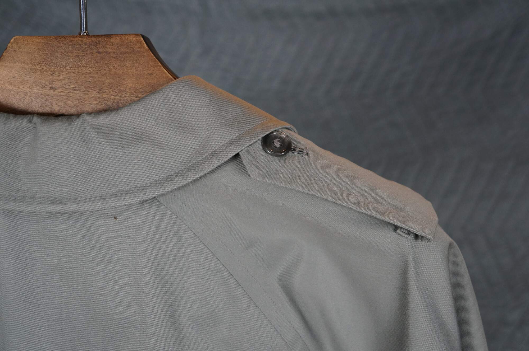 Vintage Burberry's London men's light gray double-breasted trench coat/ rain jacket. Concealed button closure. Two exterior hip pockets, button closure. 51% Cotton / 49% Polyester Shell. Black and red plaid cotton/poly blend lining. Wrist adjustable, buckle. Removable belt.