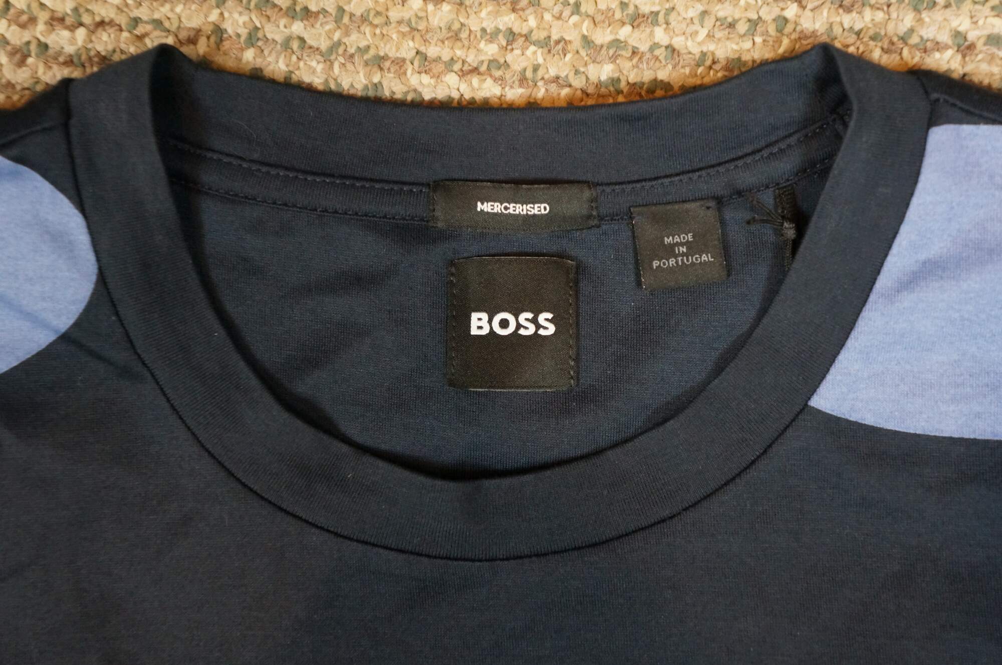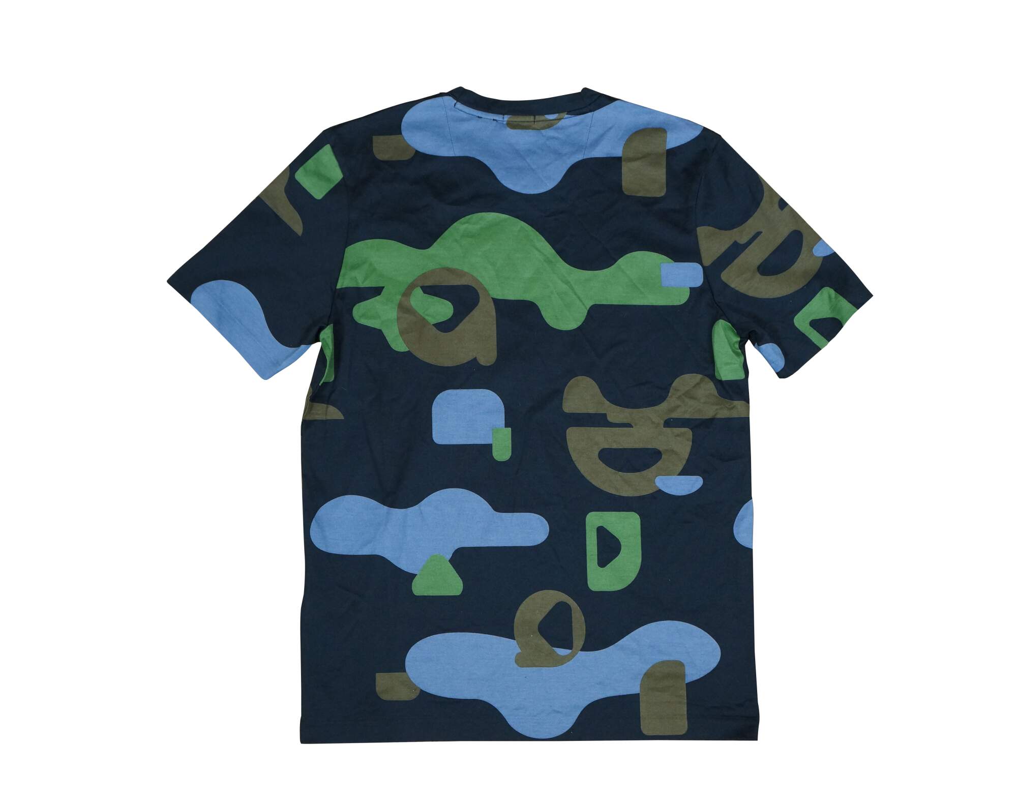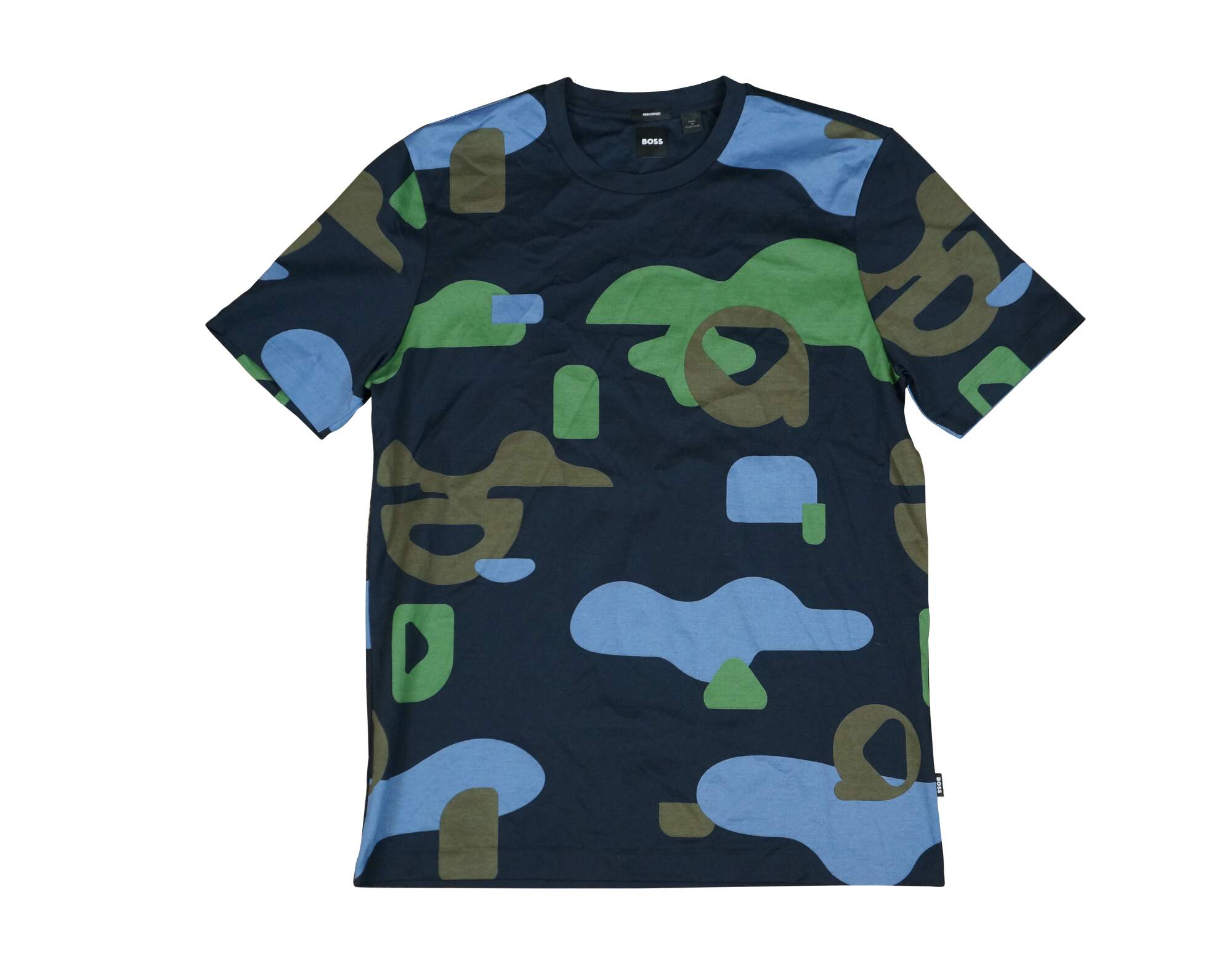 Vintage Hugo Boss men's mercerized cotton t-shirt; short sleeve, crew neck. Navy blue with light blue, brown, and green abstract camoflage design. BMB-013 Jersey 404 Dark Blue. Made in Portugal.