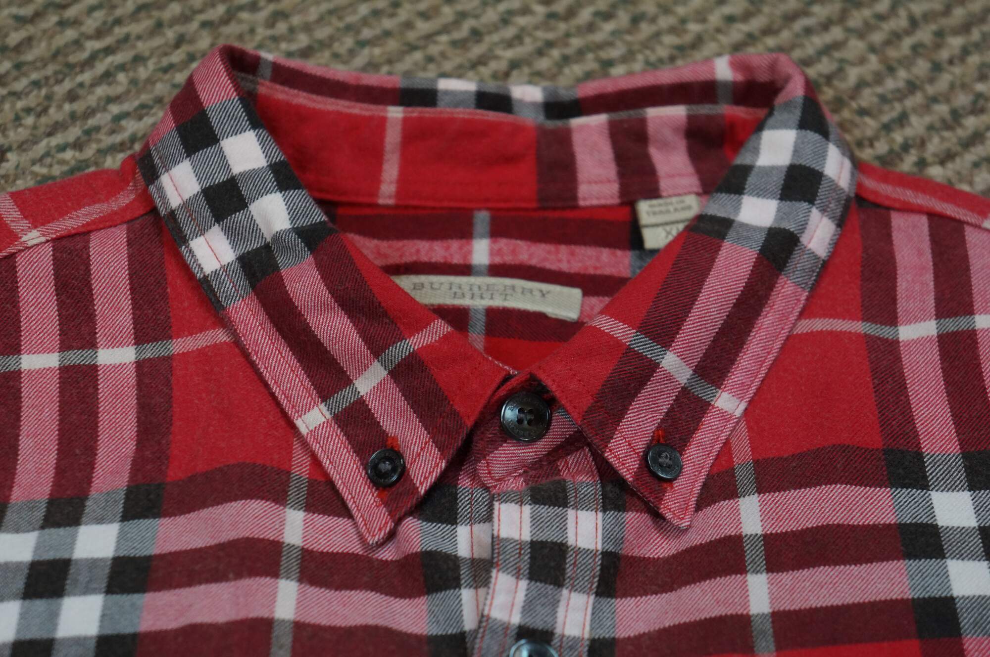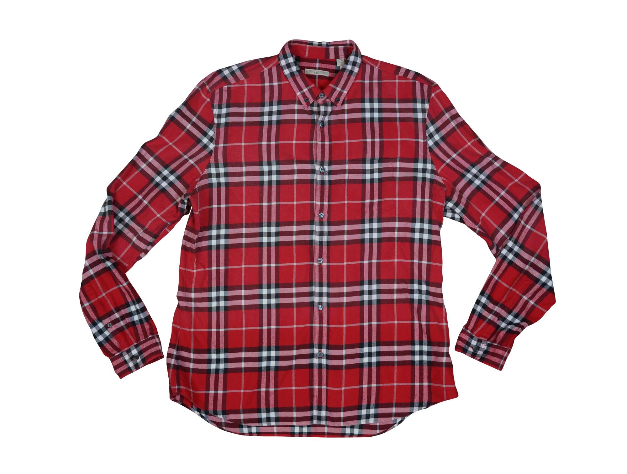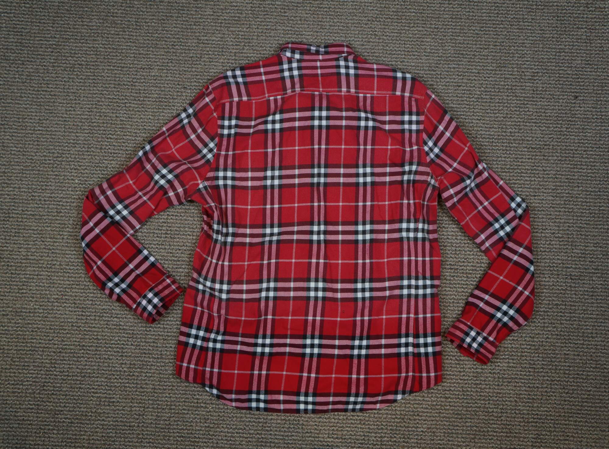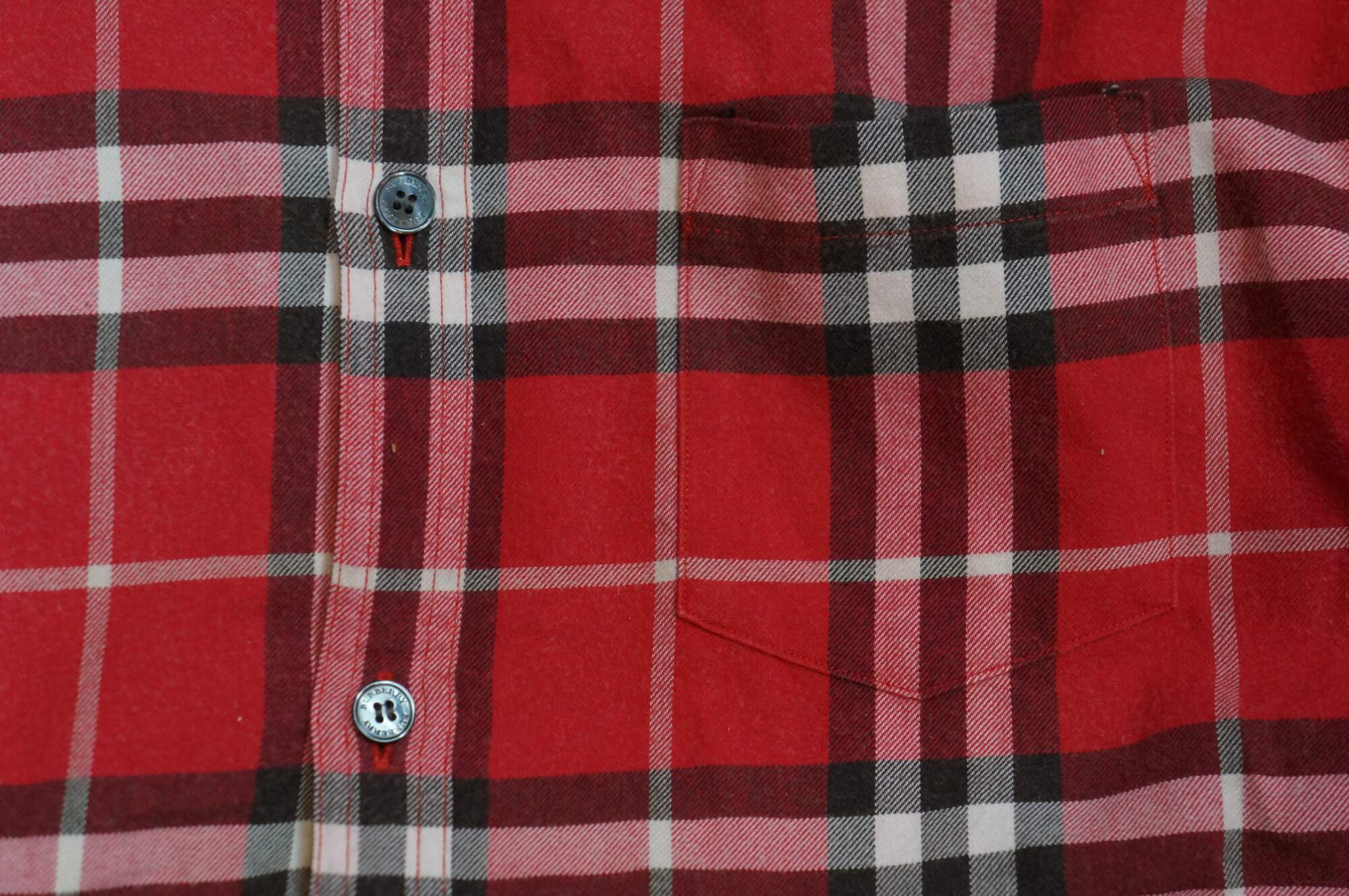 Vintage pair of Burberry Brit men's long sleeve, button up, 100% Cotton flannel shirts. Siganture Nova Check and Dark Pink / Red Plaid with button down collar. Made in Thailand.
