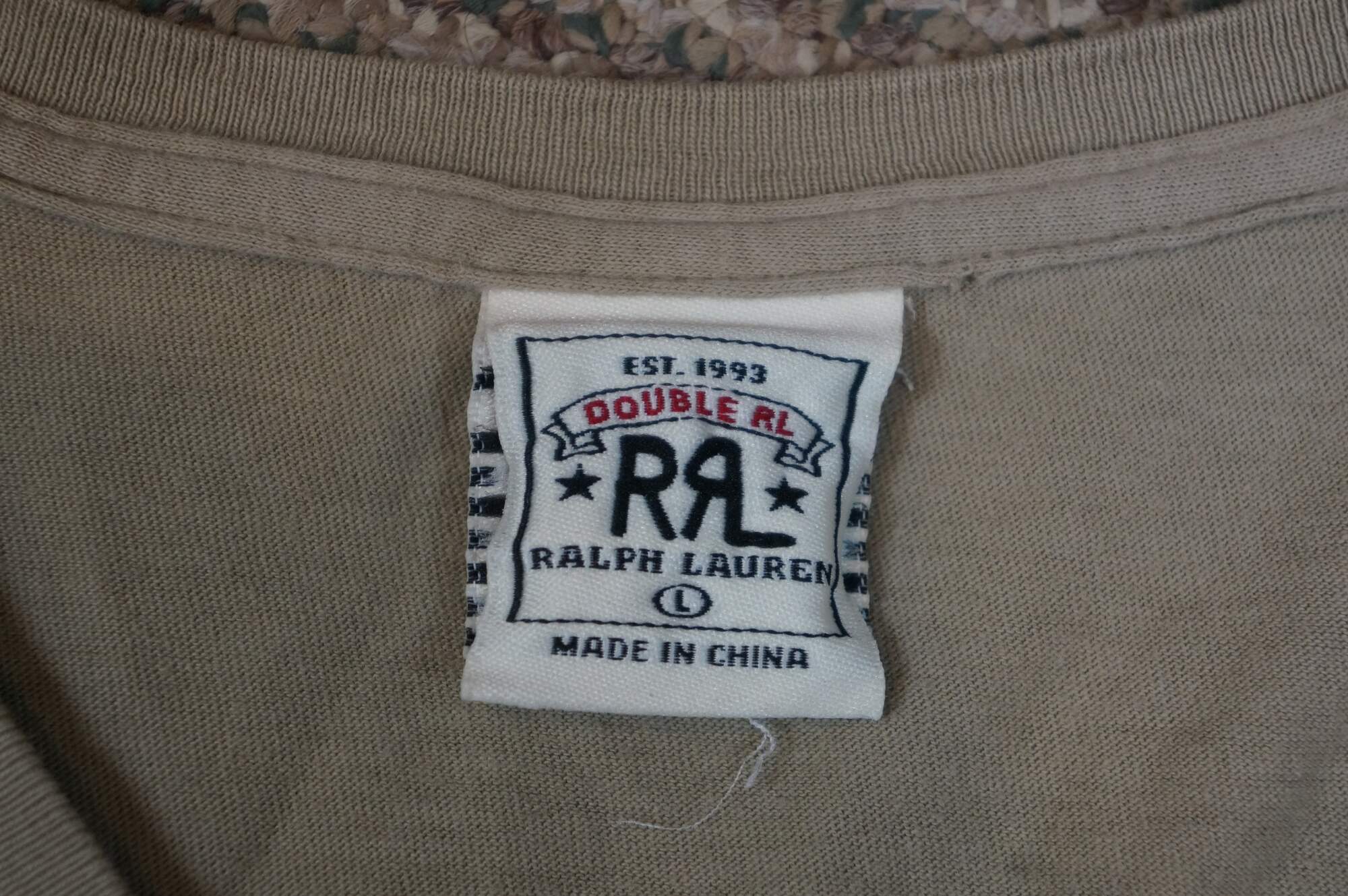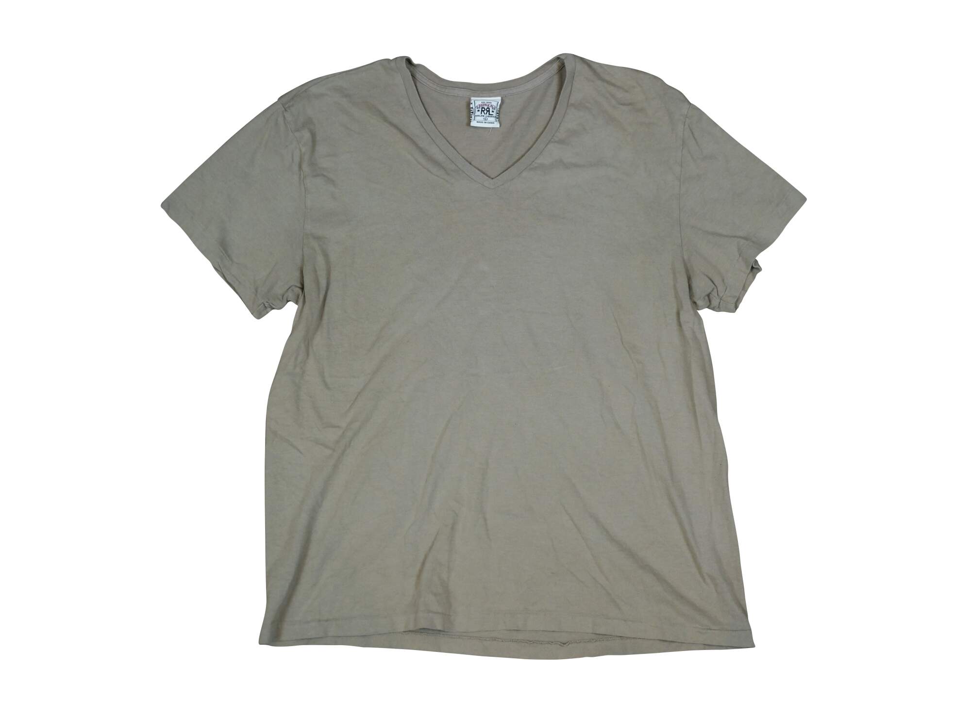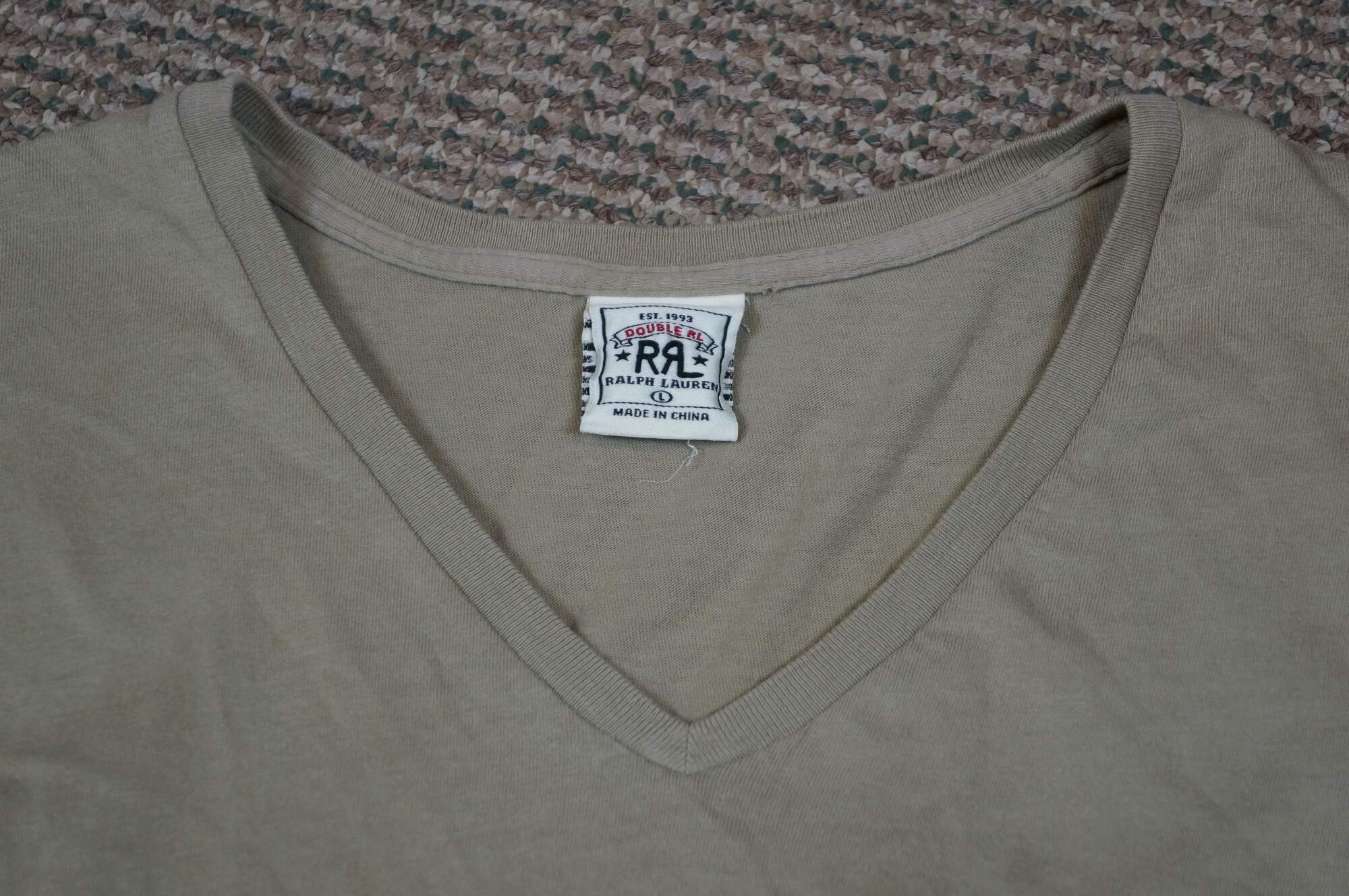Vintage Double RL Ralph Lauren men's v neck, short sleeved t-shirt in khaki beige. Made in China.