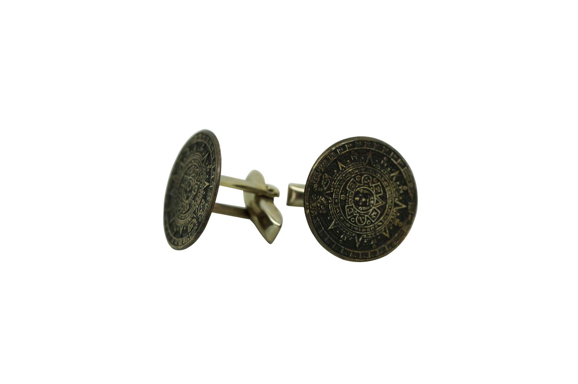 Vintage mid to late 20th century sterling silver cufflinks by Horacio de la Parra, depicting the Mayan Calendar. Reverse marked with eagle city mark (used circa 1955-1979), Mexico, 925, and Parra makers mark.