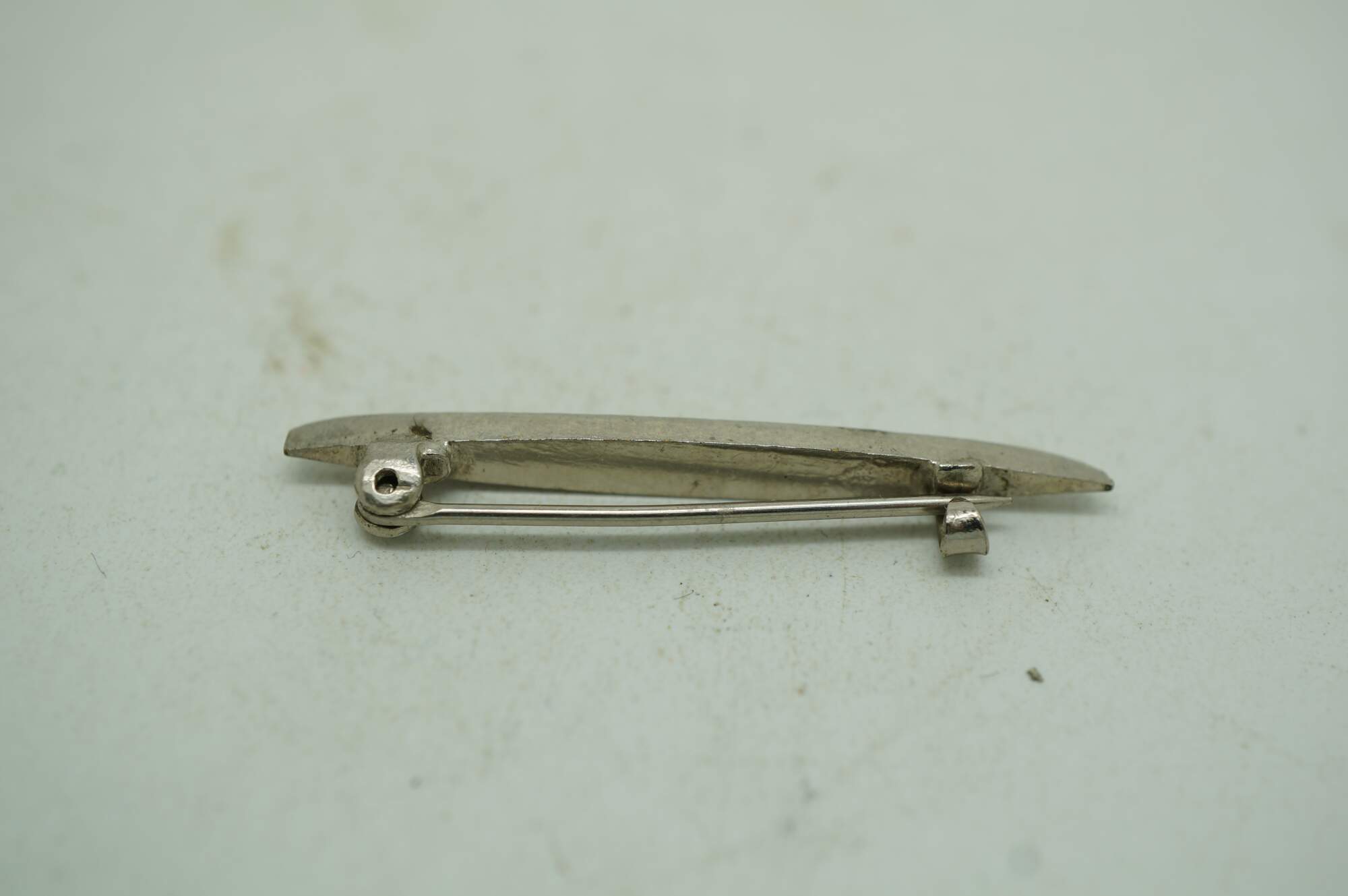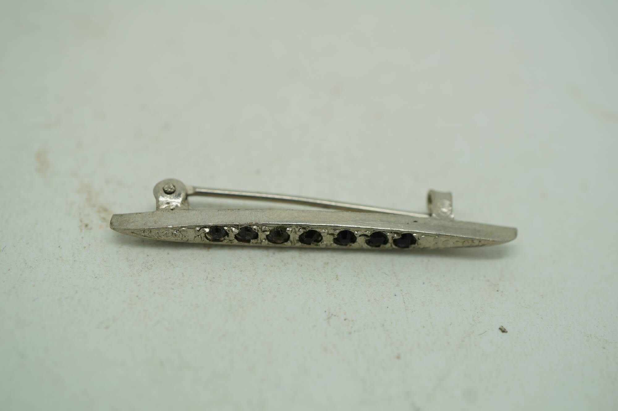 Early 20th century art deco style pin / brooch featuring a bright chrome, narrow almond shape set with seven dark, smoky rhinestones.