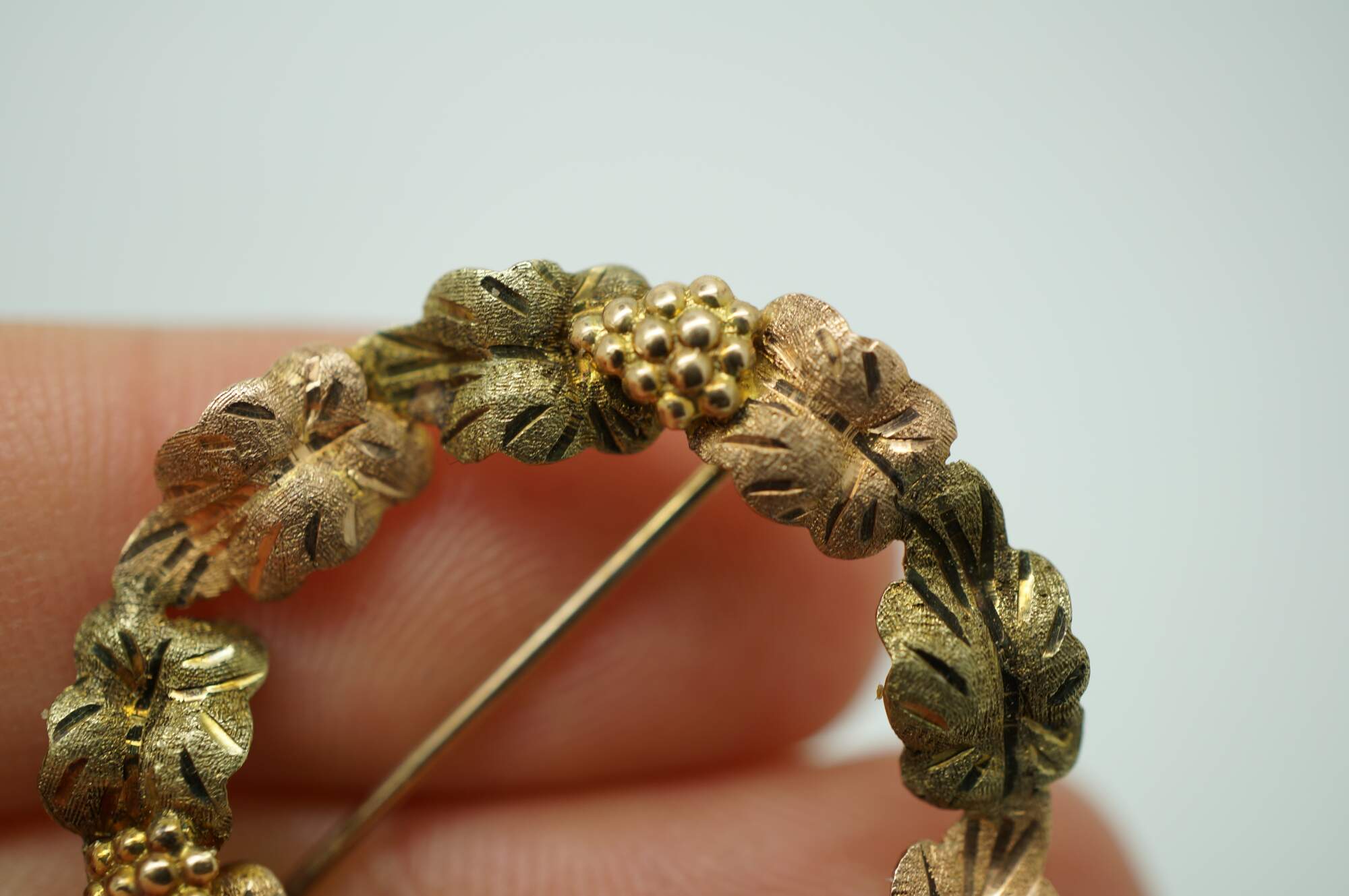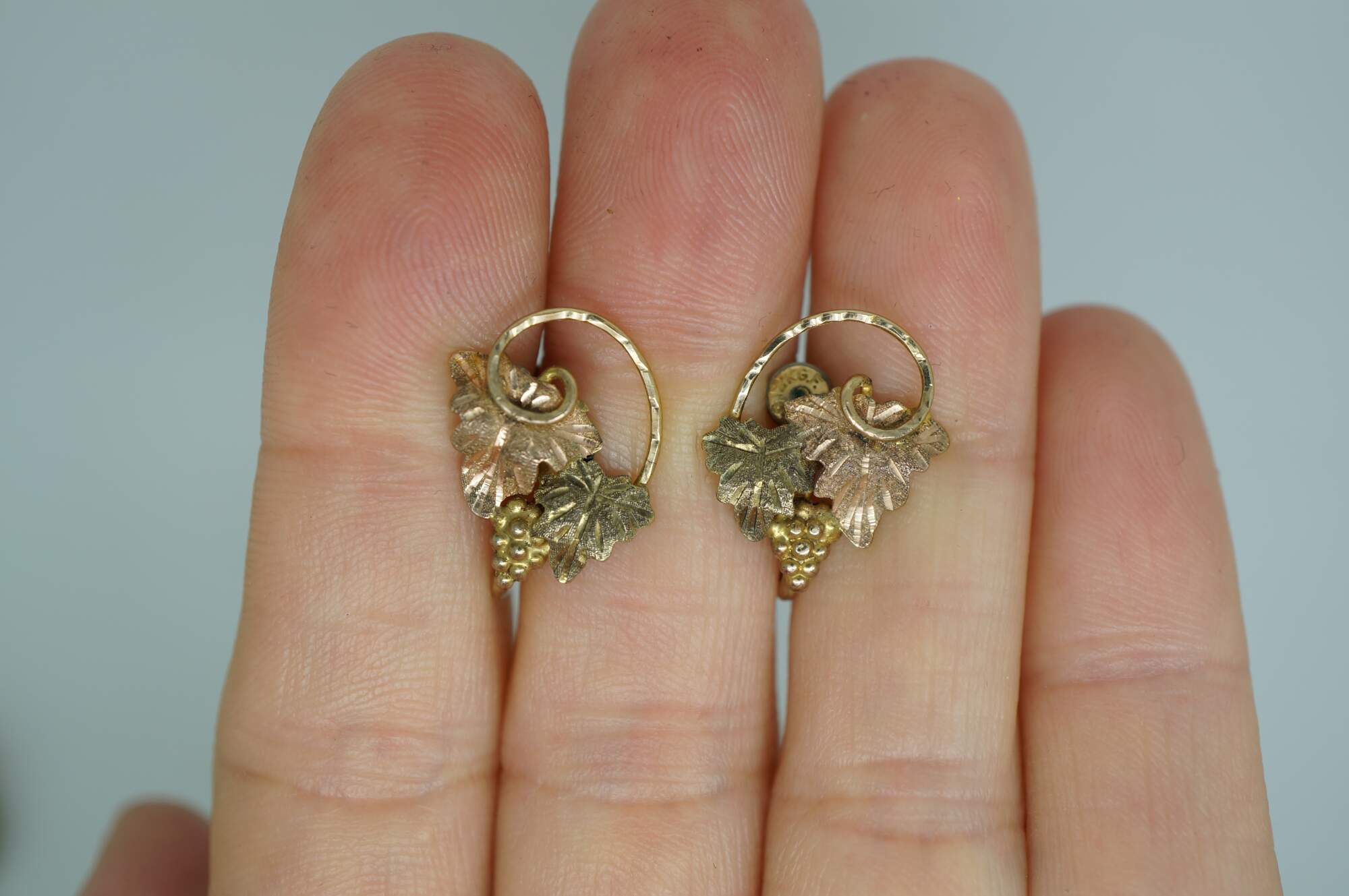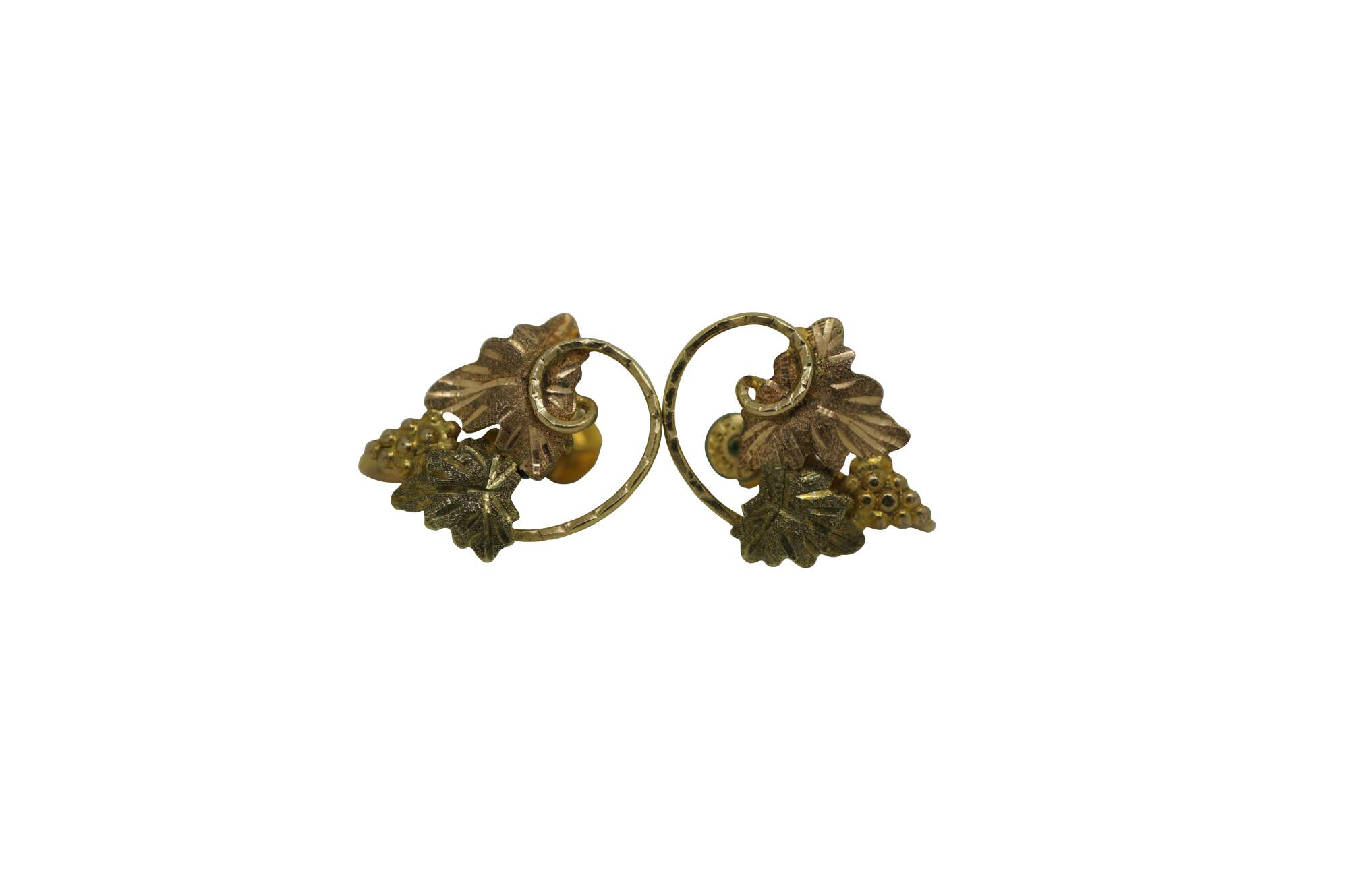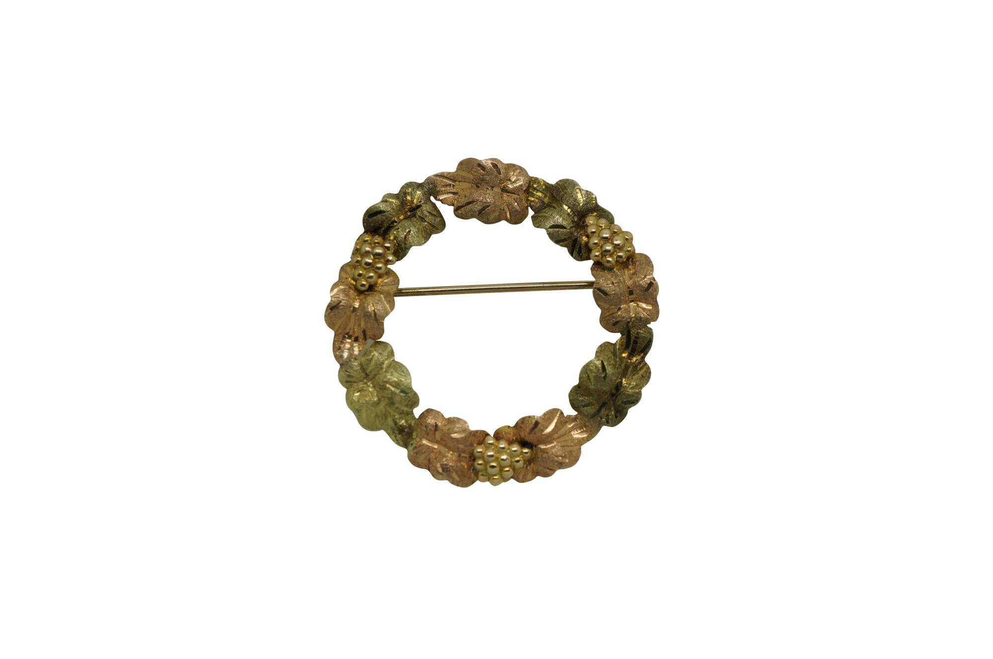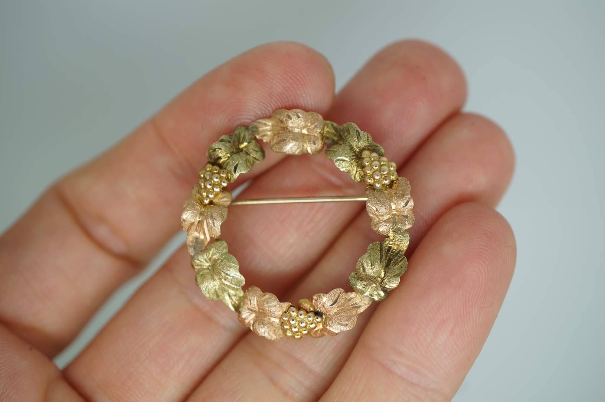 Vintage Cripple Creek 14 K Gold screw back earrings and pin / brooch featuring a delicately tinted green and rose gold grapevine / Black Hills Wreath design. Screw backs are 14k with 1/20 12K GF stems.