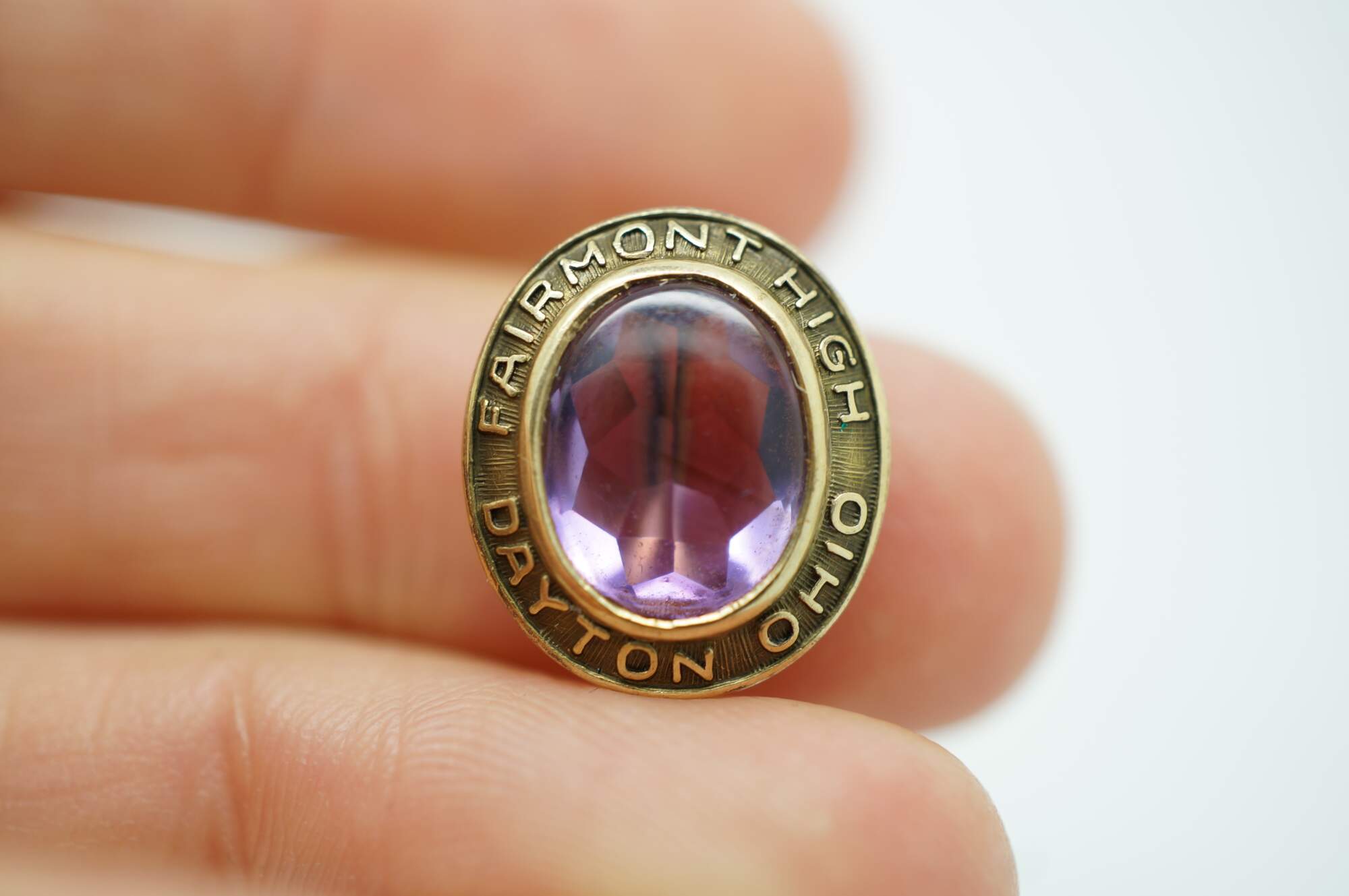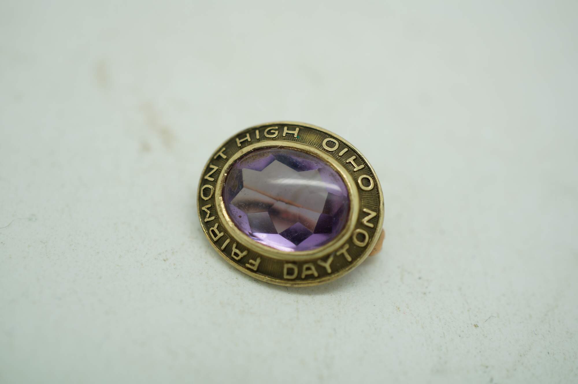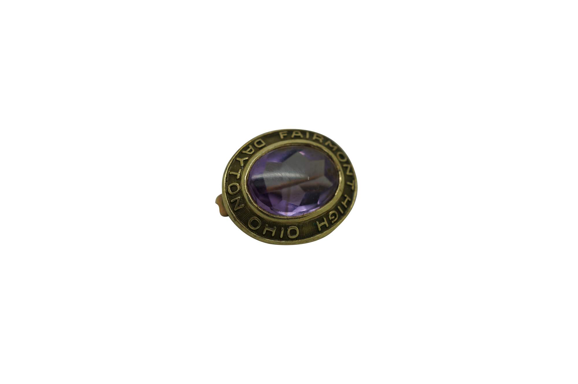 Circa mid 20th century Peters Co high school class lapel pin. 10K yellow gold oval frame marked Fairmont High Dayton Ohio, surrounding a light purple amethyst stone. Monogrammed RJR on reverse. No date / year.