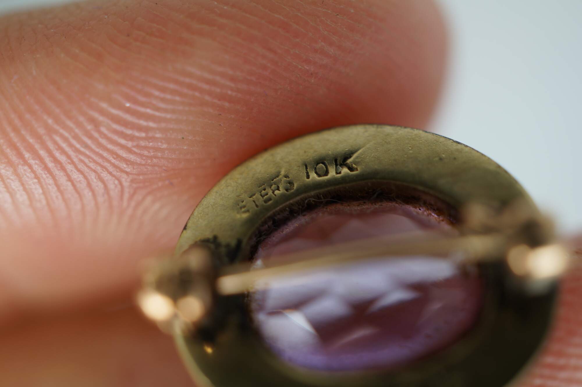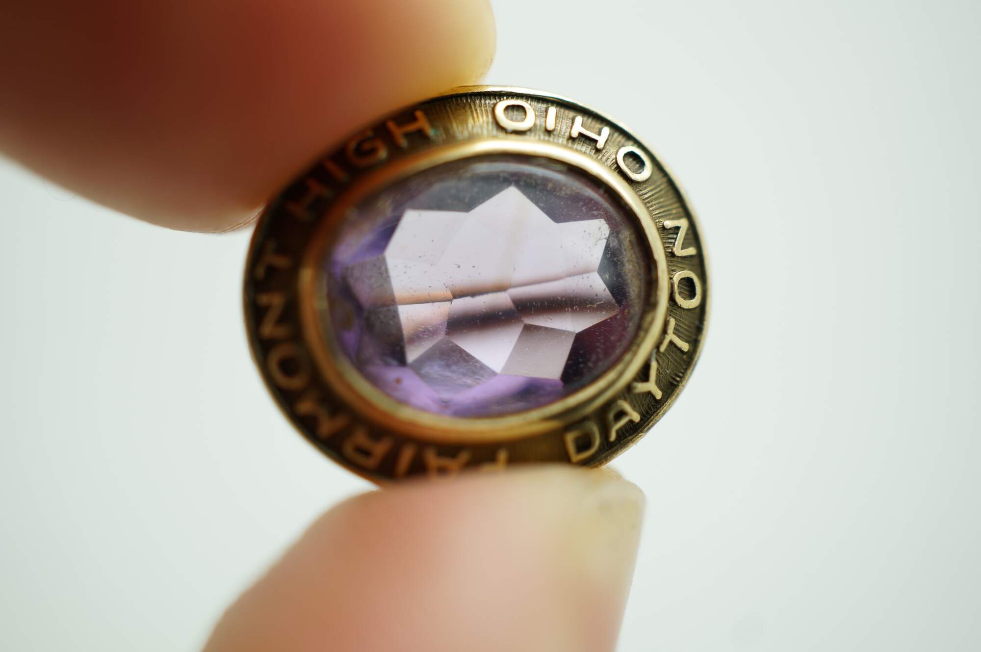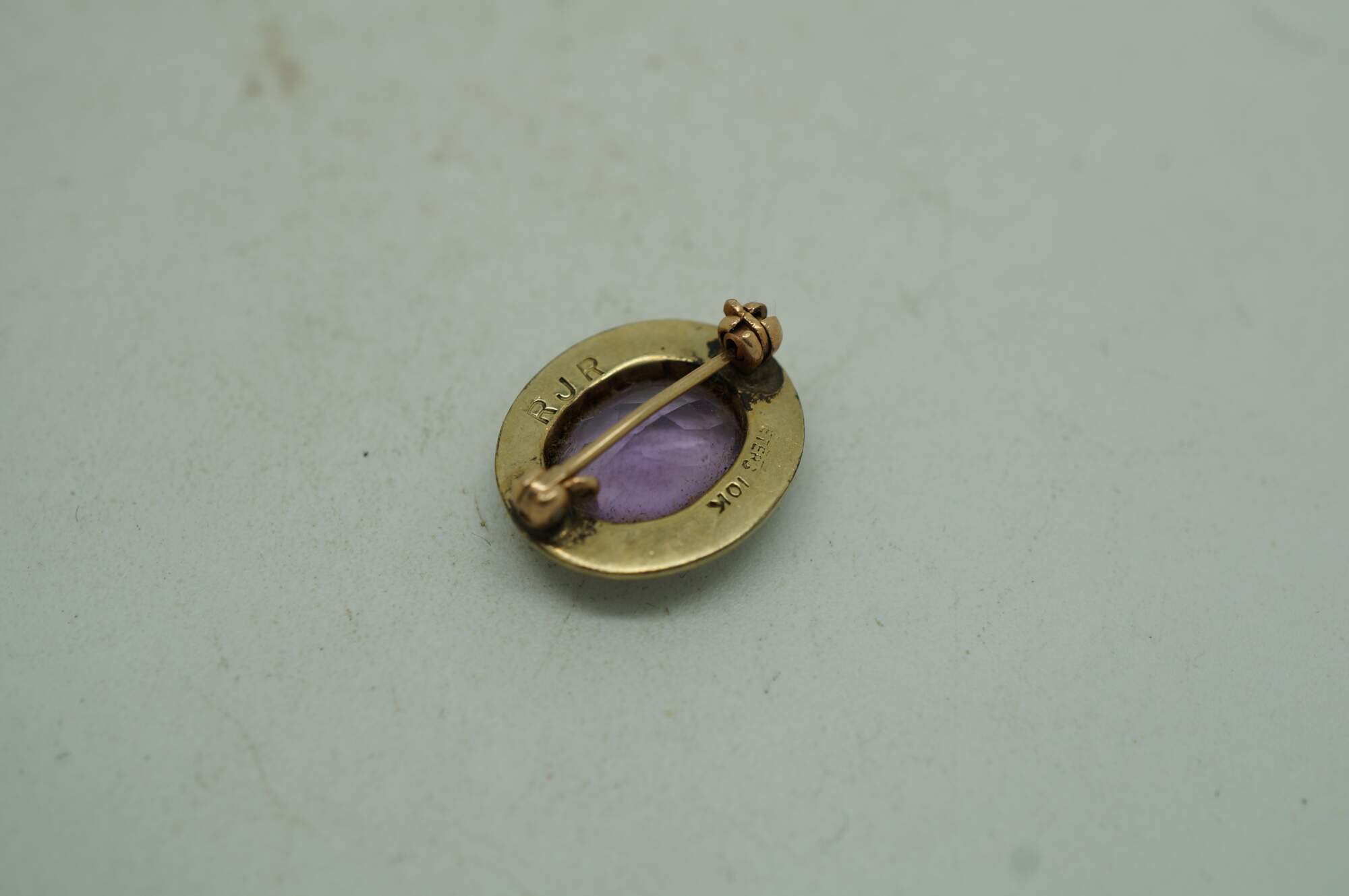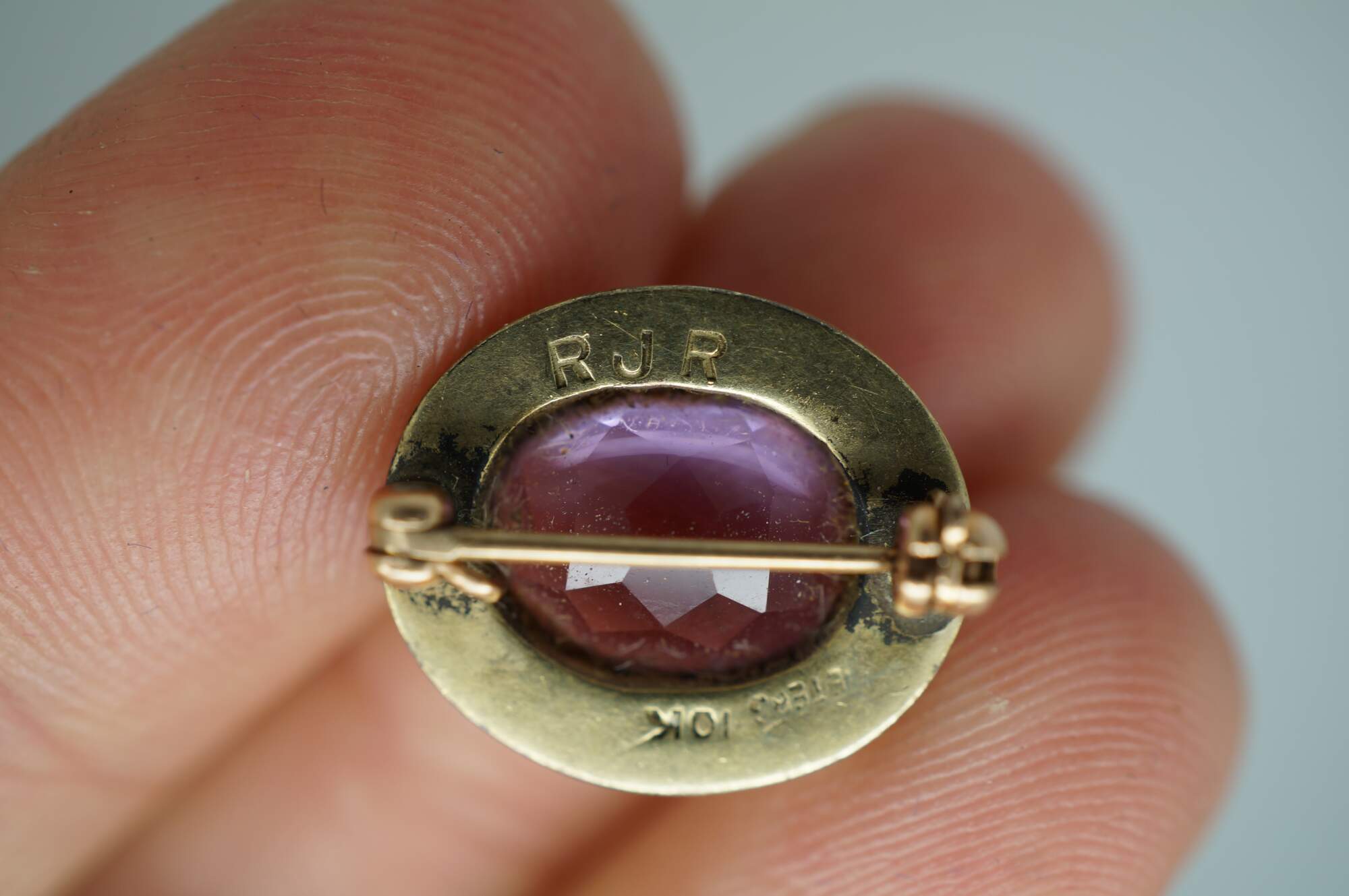 Circa mid 20th century Peters Co high school class lapel pin. 10K yellow gold oval frame marked Fairmont High Dayton Ohio, surrounding a light purple amethyst stone. Monogrammed RJR on reverse. No date / year.