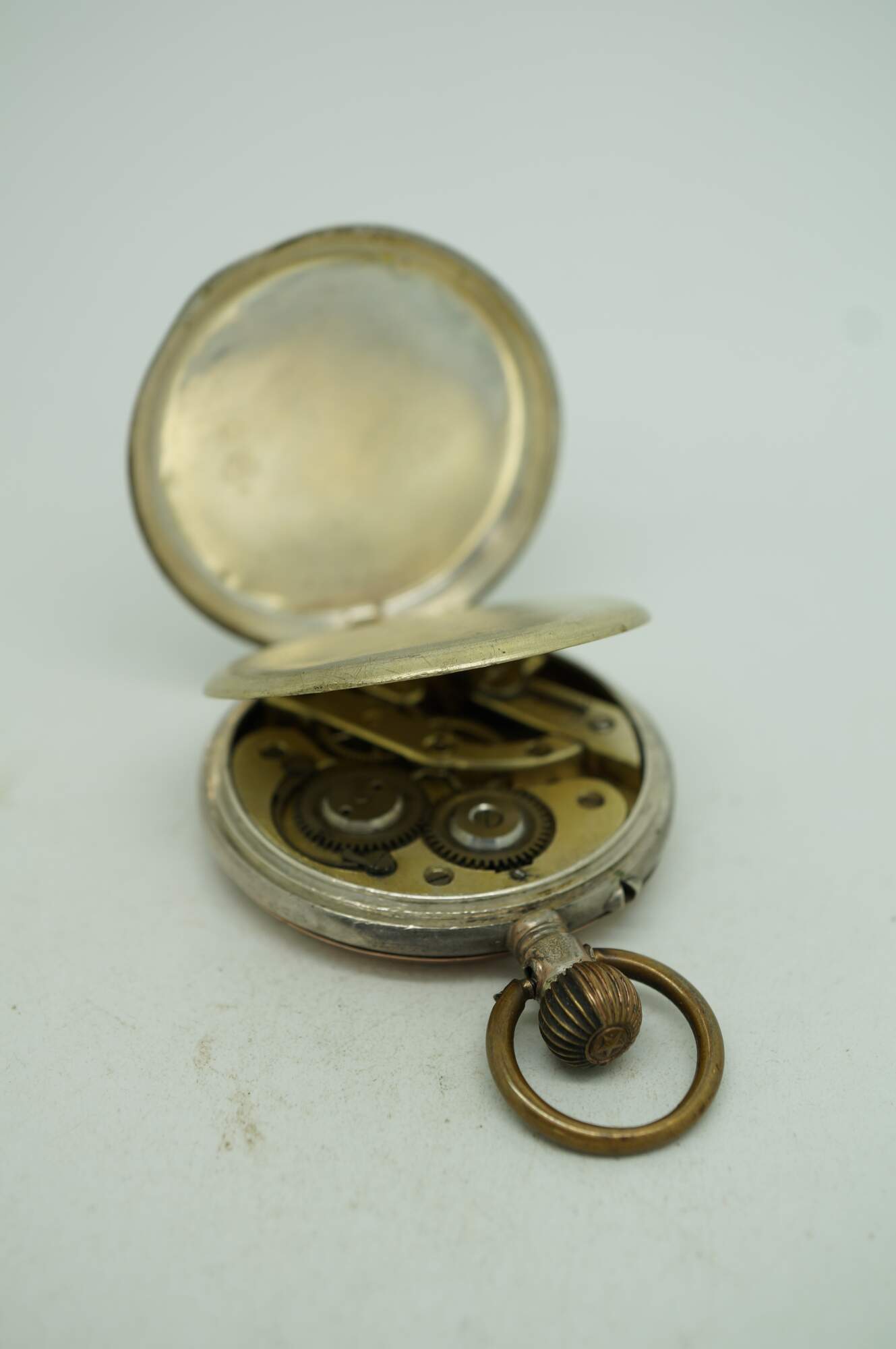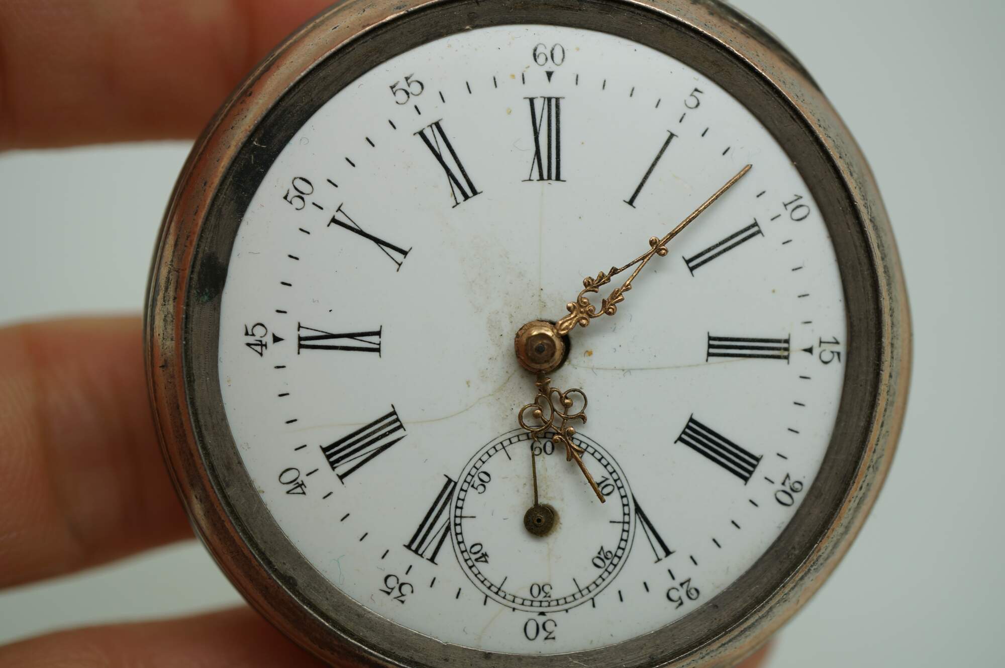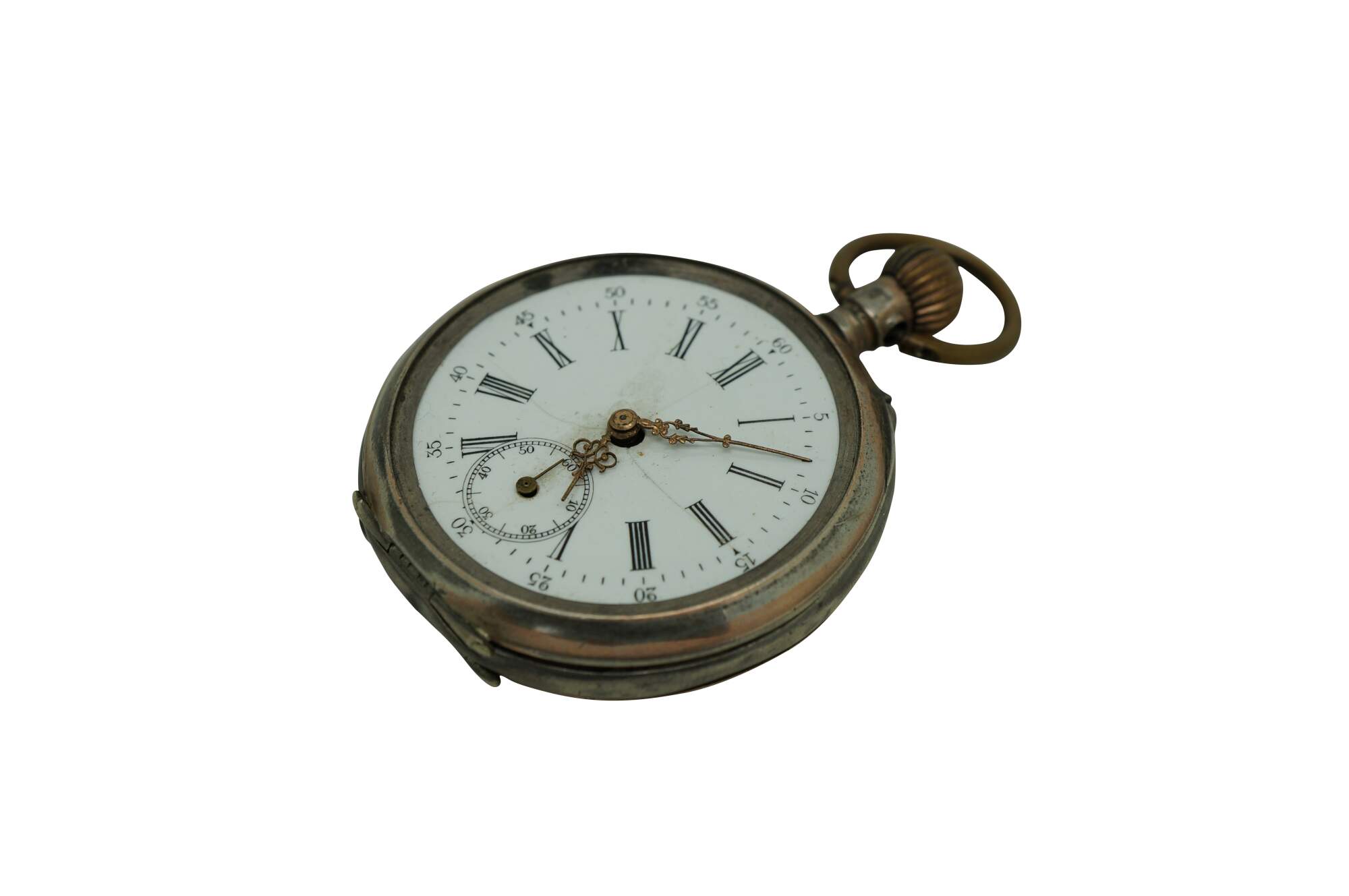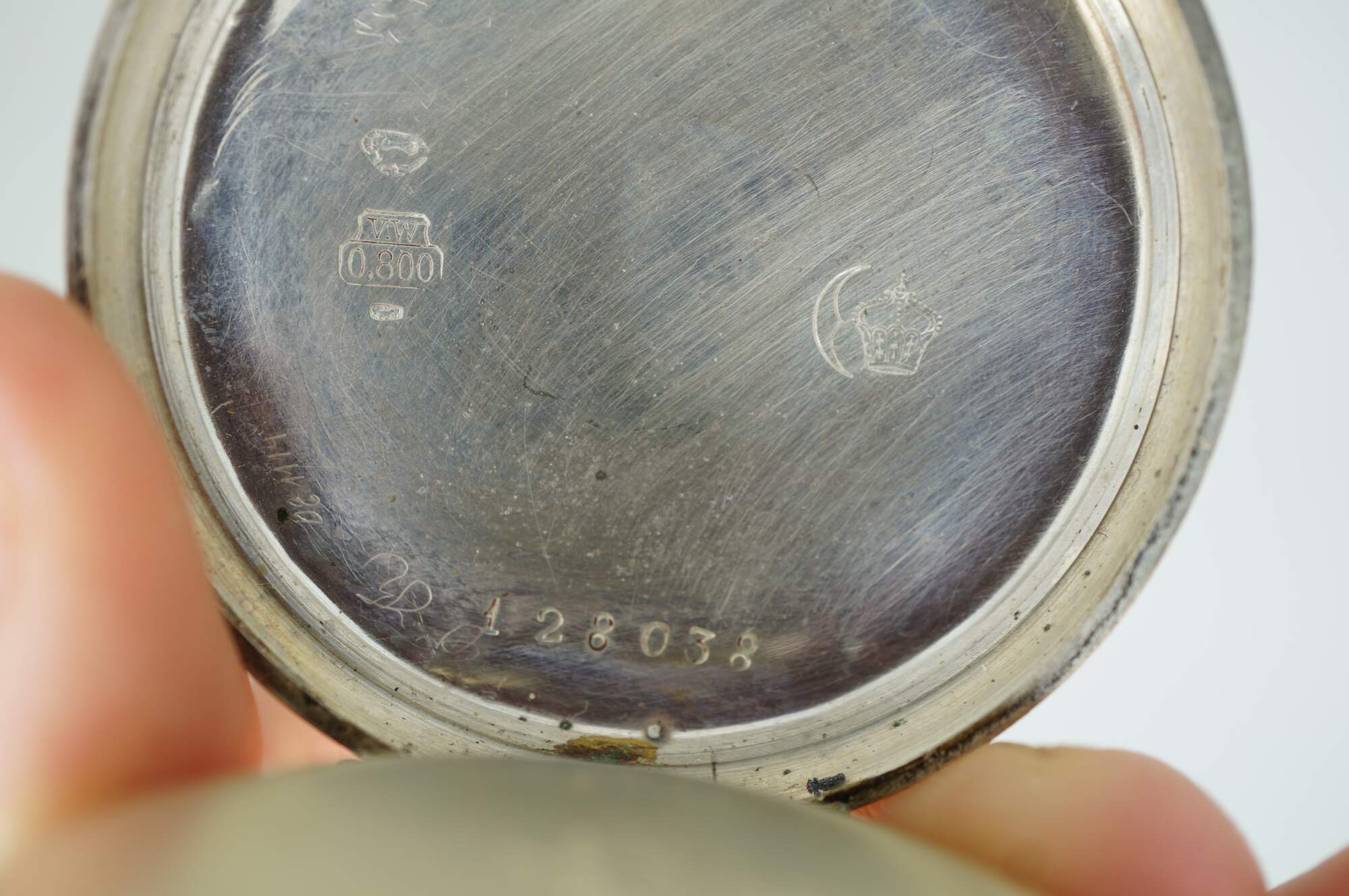 Antique 800 German silver Remontoir pocket watch. White face with black Roman numerals for the hours and Arabic numerals for the seconds and auxiliary dial; ornate gilt brass hands; missing glass. Remontoir Cylindre 6 Rubis. Three part butterfly case marked with the German national purity mark of the moon and crown (Halbmond & Krone), Swiss grouse purity mark (used circa 1882-1934), 0,800, unidentified V.W maker's mark, Cuivre, and numbered 128038. Back etched with a simple shield framed with striped rings and leaves.