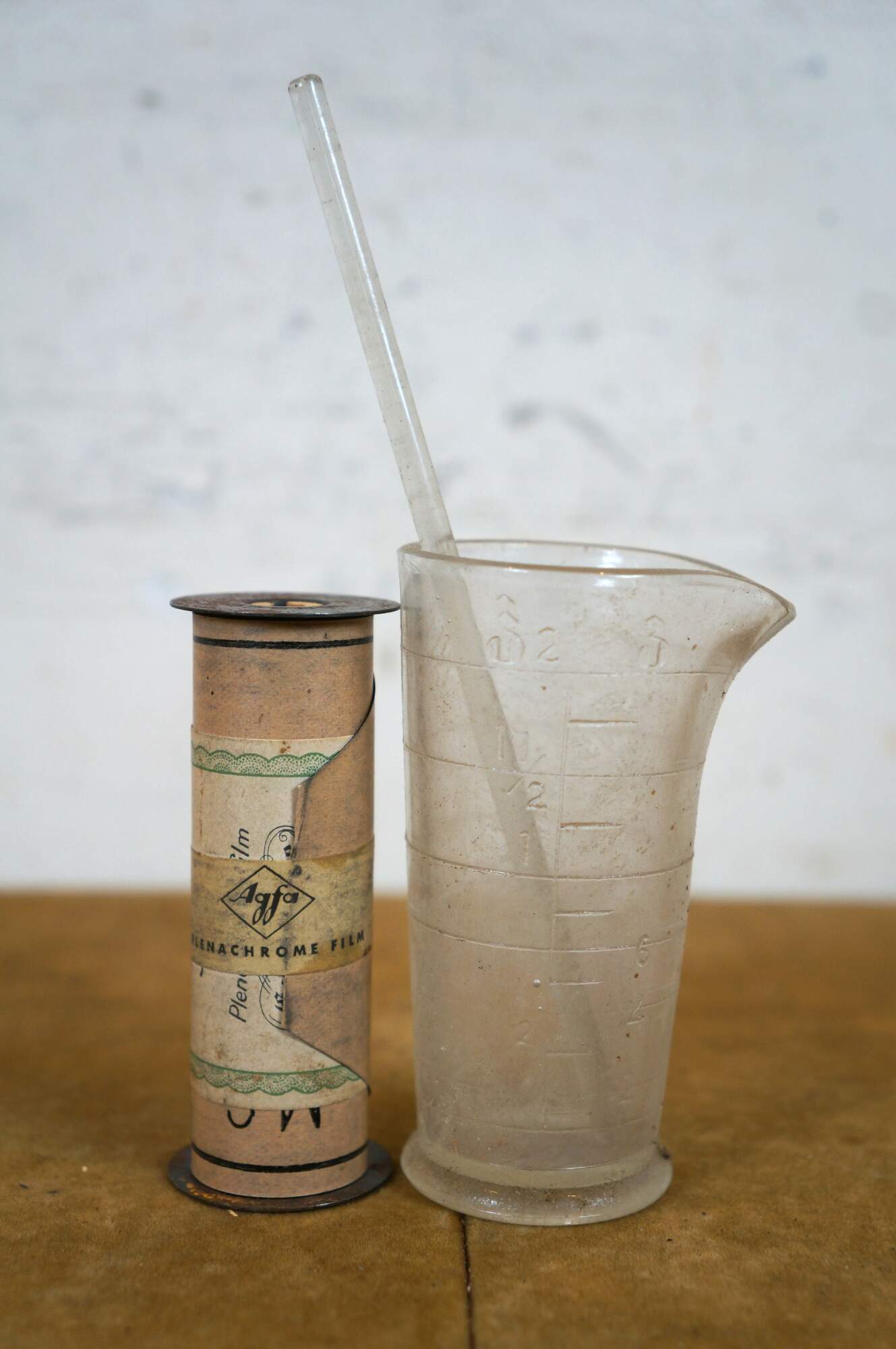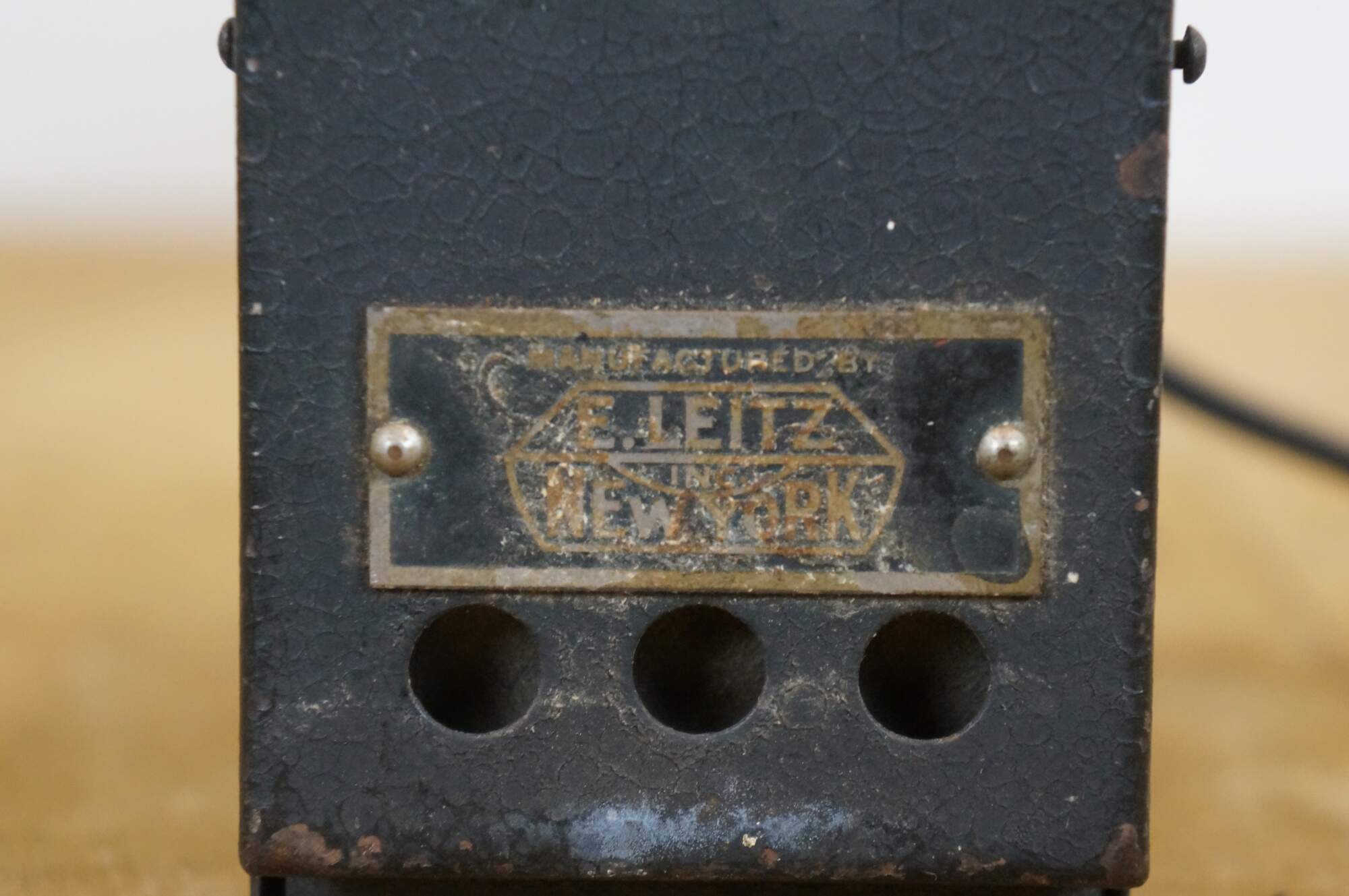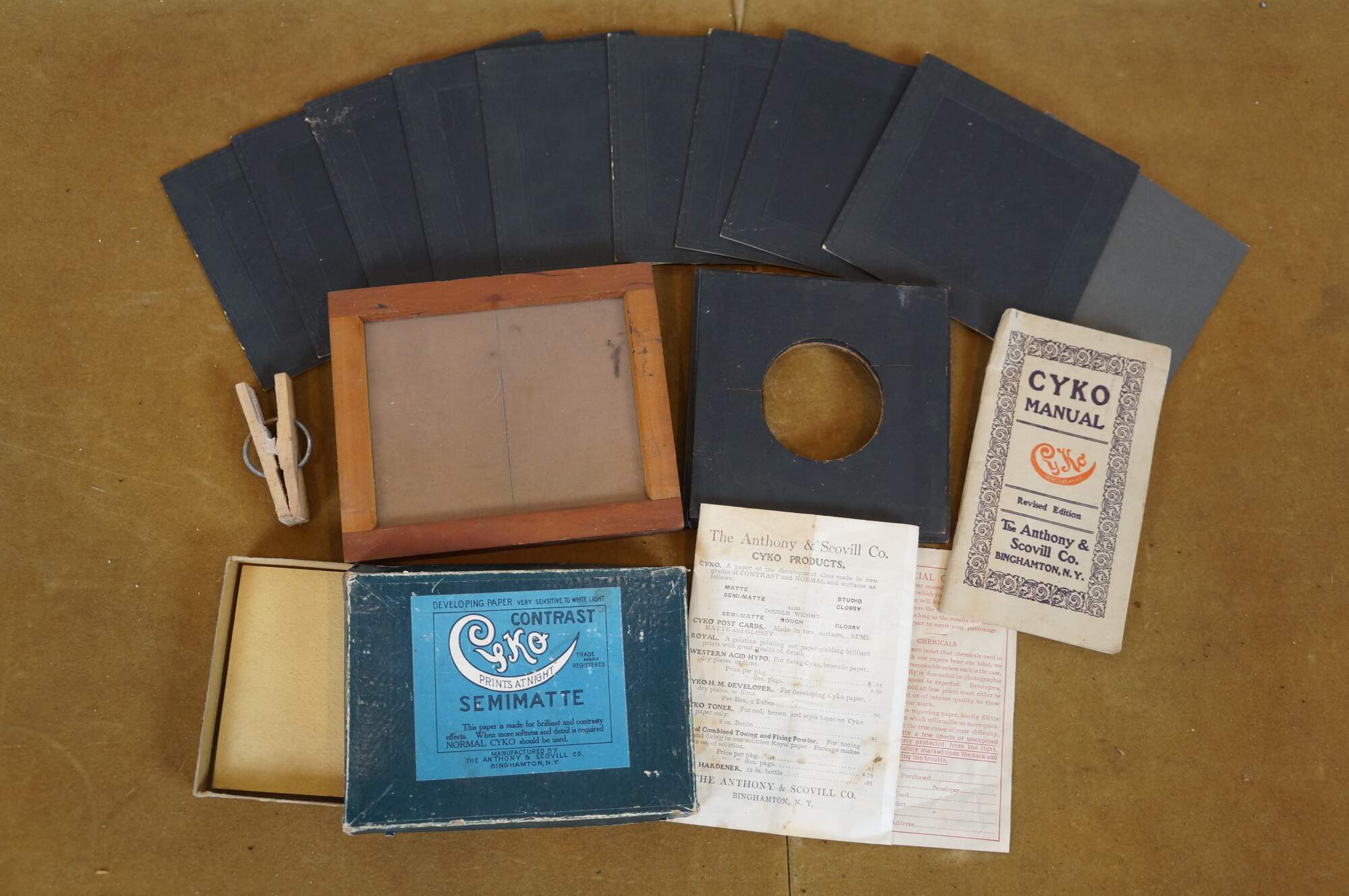 Lot of early 20th century contact print / photographic developing equipment. Lot includes: wooden carrying case (lid loose / missing latches), pair of black sleeve guards, 3 Compressed Fiber Co developing trays, 10 square cardboard backing panels for pictures, one clothespin, wood frame for contact printing, wooden block with cut out circle, empty box for Cyko Developing Paper by Anthony & Scovill Co plus manual and product insert (circa 1902-1907), one unused roll of Agfa Plenachrome Film (circa 1930s), small glass mixing beaker and swizzle stick, hand held candle lantern with red glass front, and one small E. Leitz Inc electric lamp (parts of cord covering crumbling - not tested).
