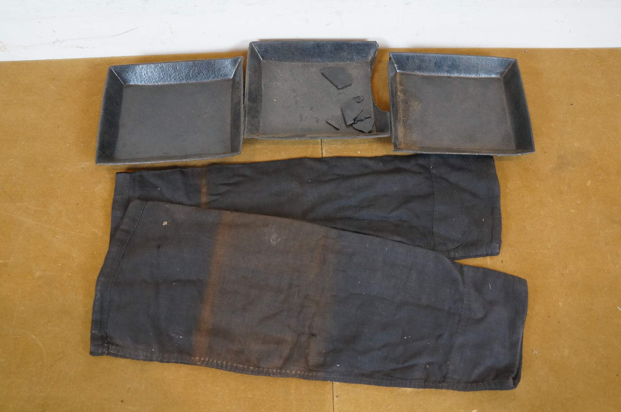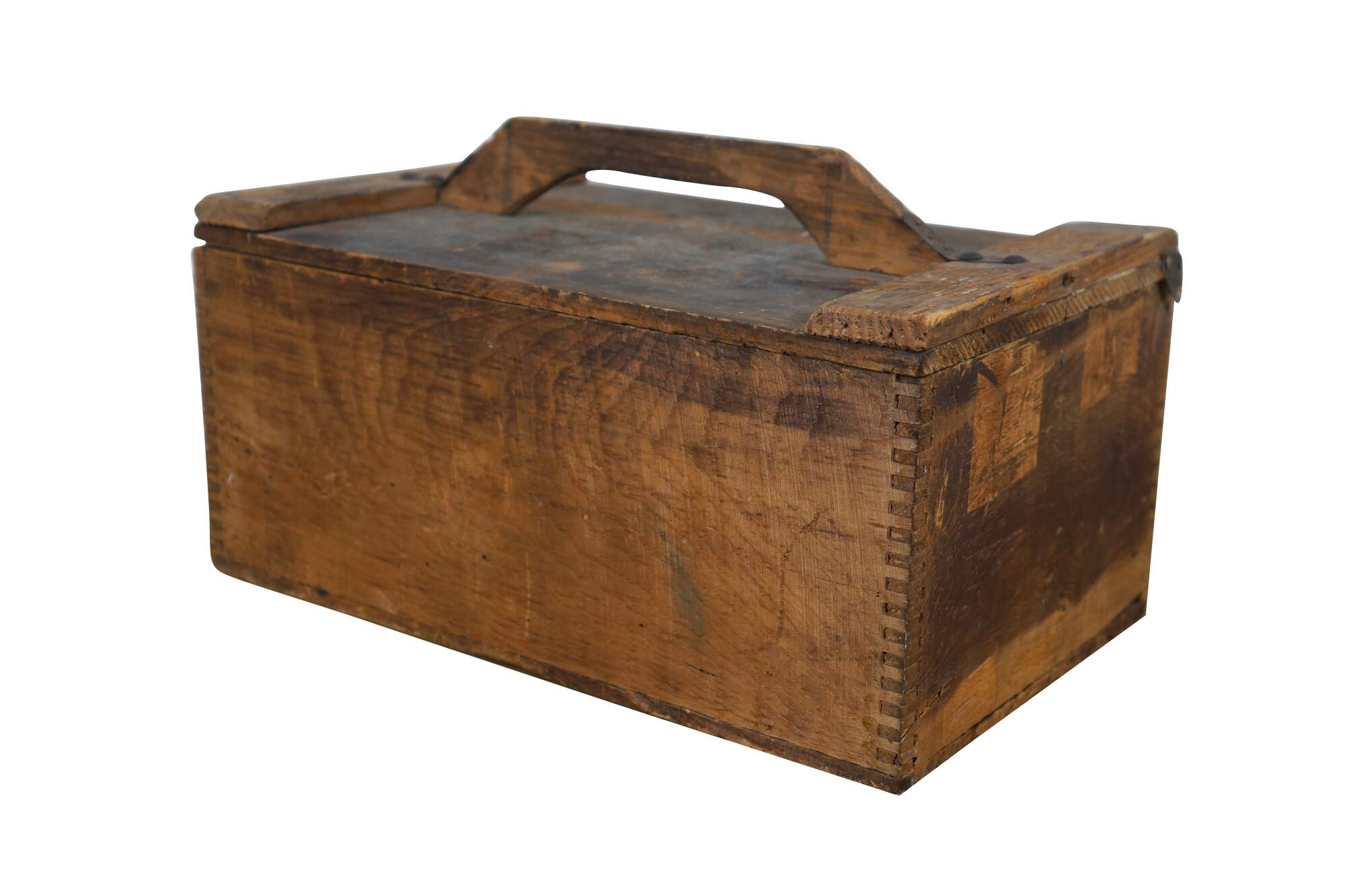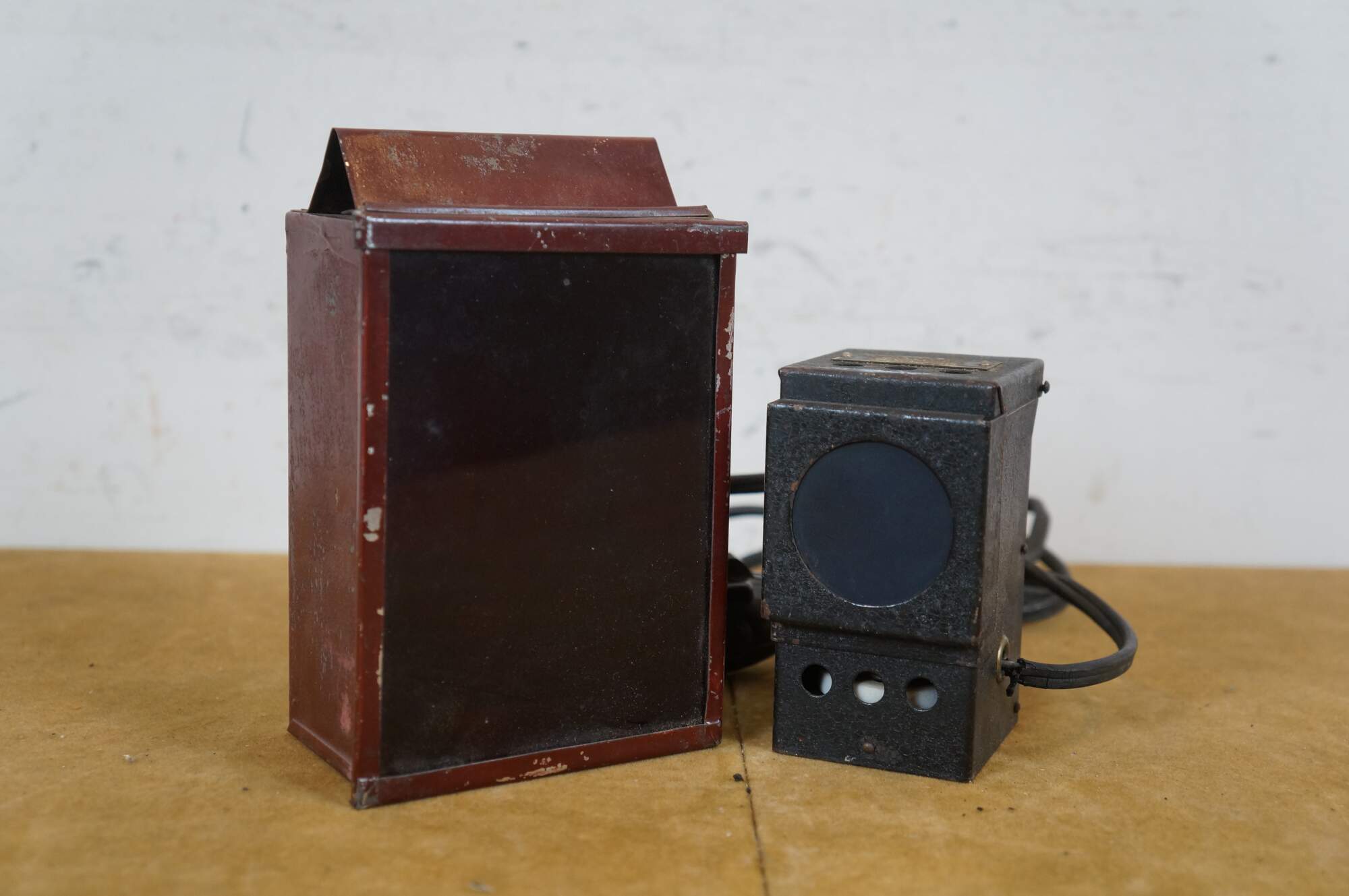 Lot of early 20th century contact print / photographic developing equipment. Lot includes: wooden carrying case (lid loose / missing latches), pair of black sleeve guards, 3 Compressed Fiber Co developing trays, 10 square cardboard backing panels for pictures, one clothespin, wood frame for contact printing, wooden block with cut out circle, empty box for Cyko Developing Paper by Anthony & Scovill Co plus manual and product insert (circa 1902-1907), one unused roll of Agfa Plenachrome Film (circa 1930s), small glass mixing beaker and swizzle stick, hand held candle lantern with red glass front, and one small E. Leitz Inc electric lamp (parts of cord covering crumbling - not tested).