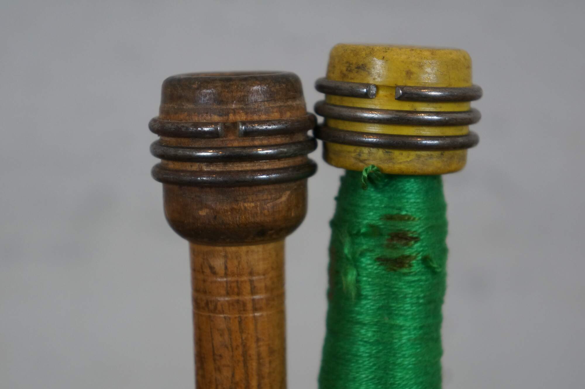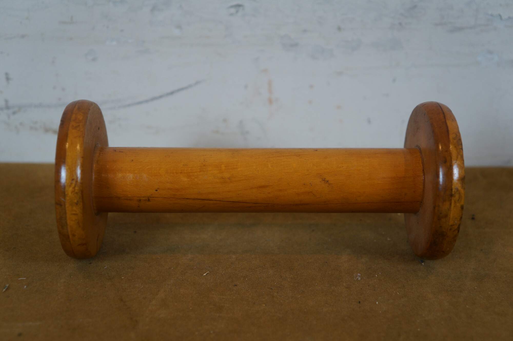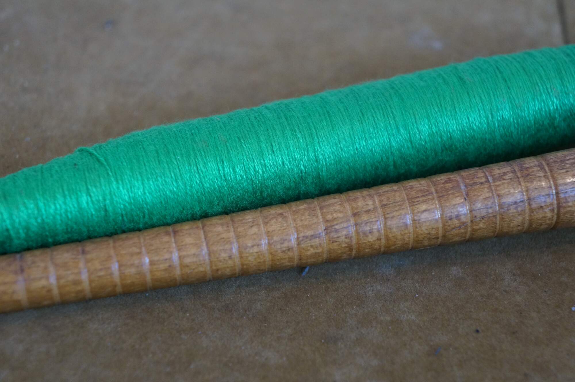 Antique indutrial textile manufacturing spool and p[air of spindles, one wrapped with green thread. Hardwood with metal pieces.