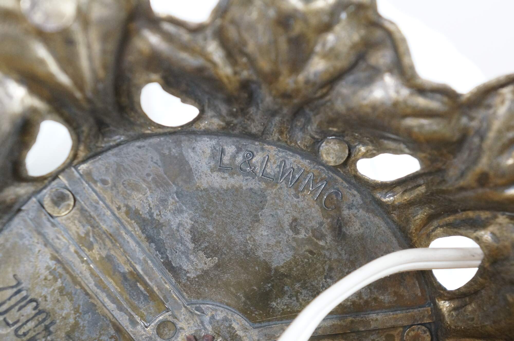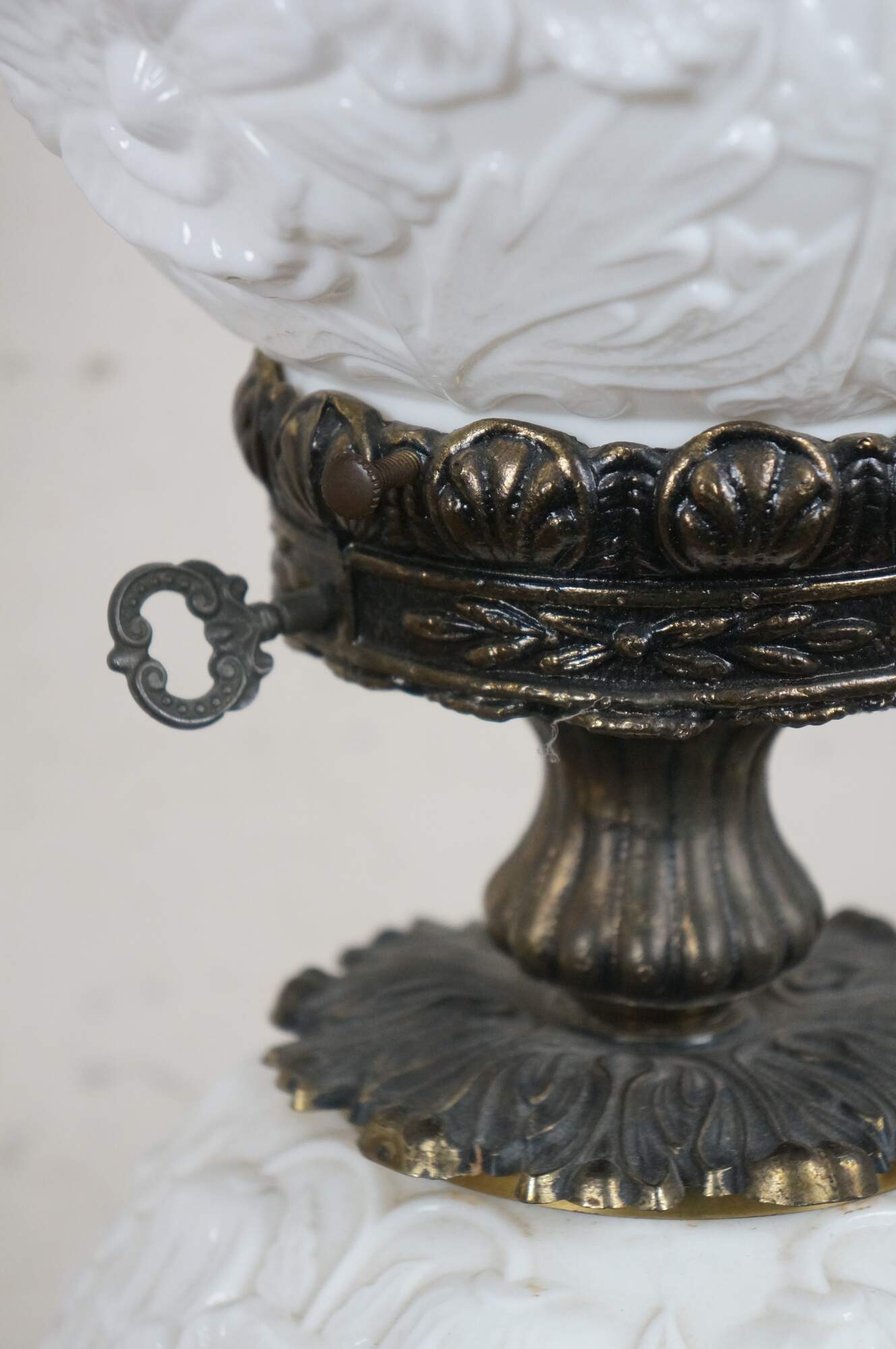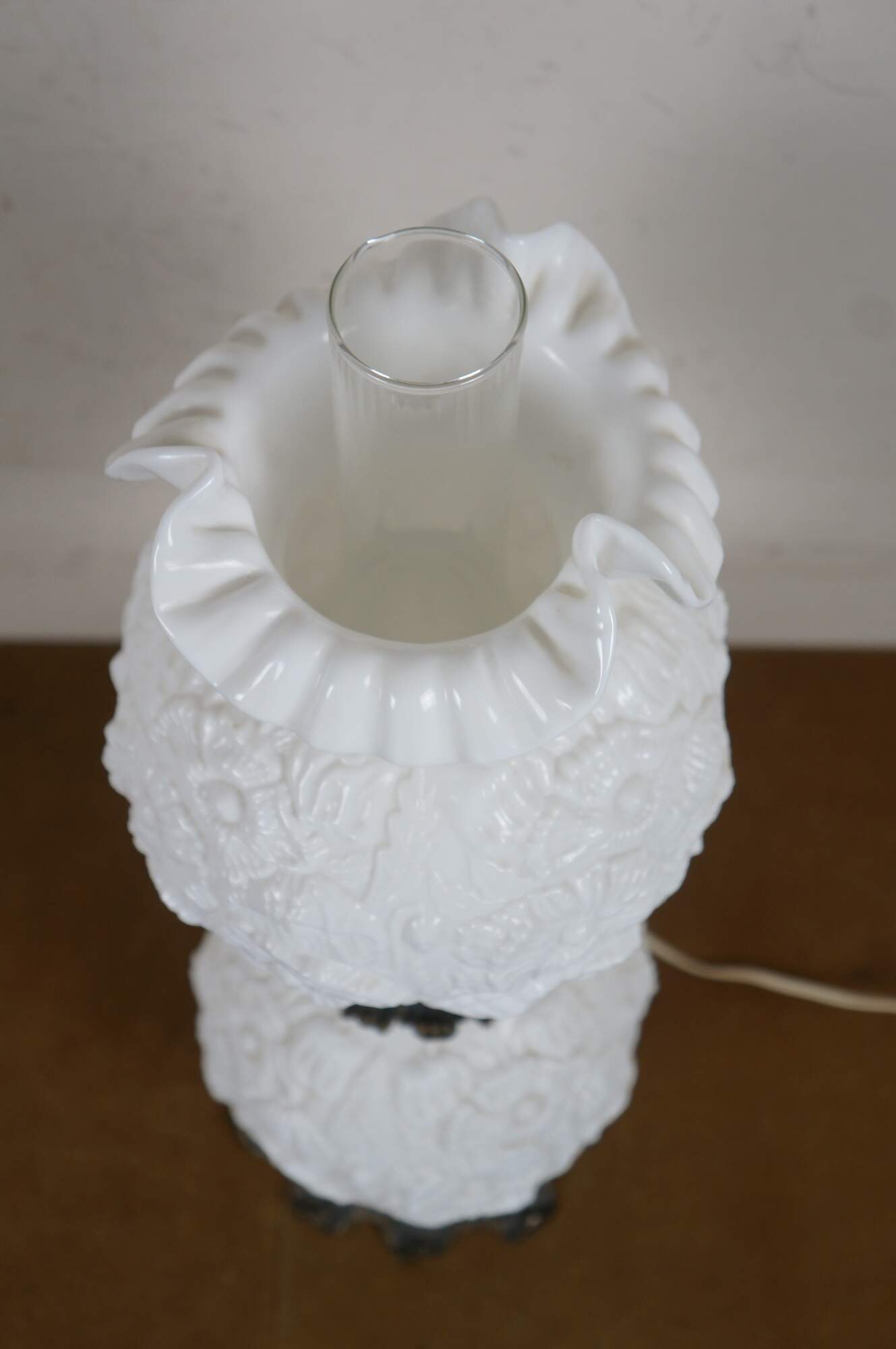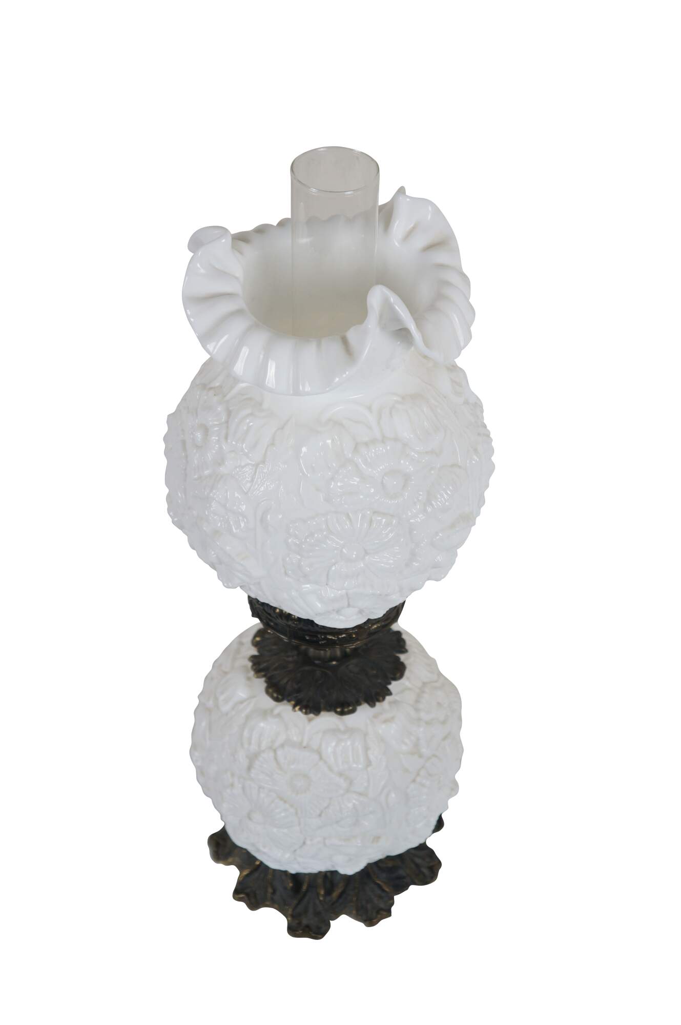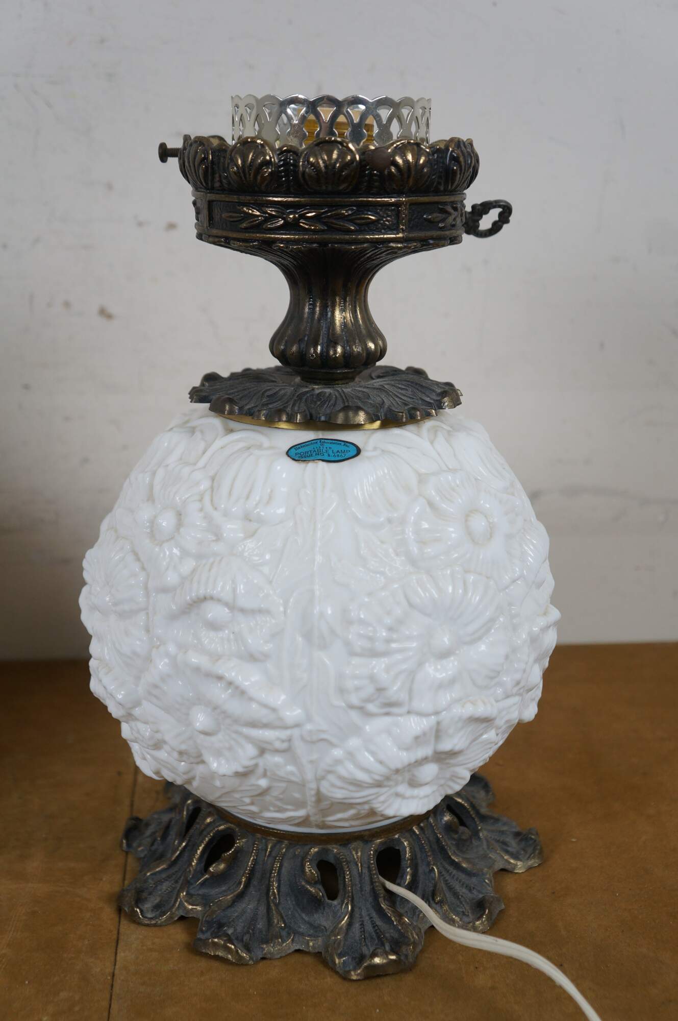 Vintage Fenton art glass Gone with the Wind style table lamp. Imitating the look of a converted oil lamp, with two milk glass globes molded with poppies, hurricane, and a bronze colored white metal base by Loevsky & Loevsky White Metal Castings (in business in Carlstadt, N.J., from about 1937 until the 1970s). Three way switch illuminates the lights in each globe independently or together. E40502.
