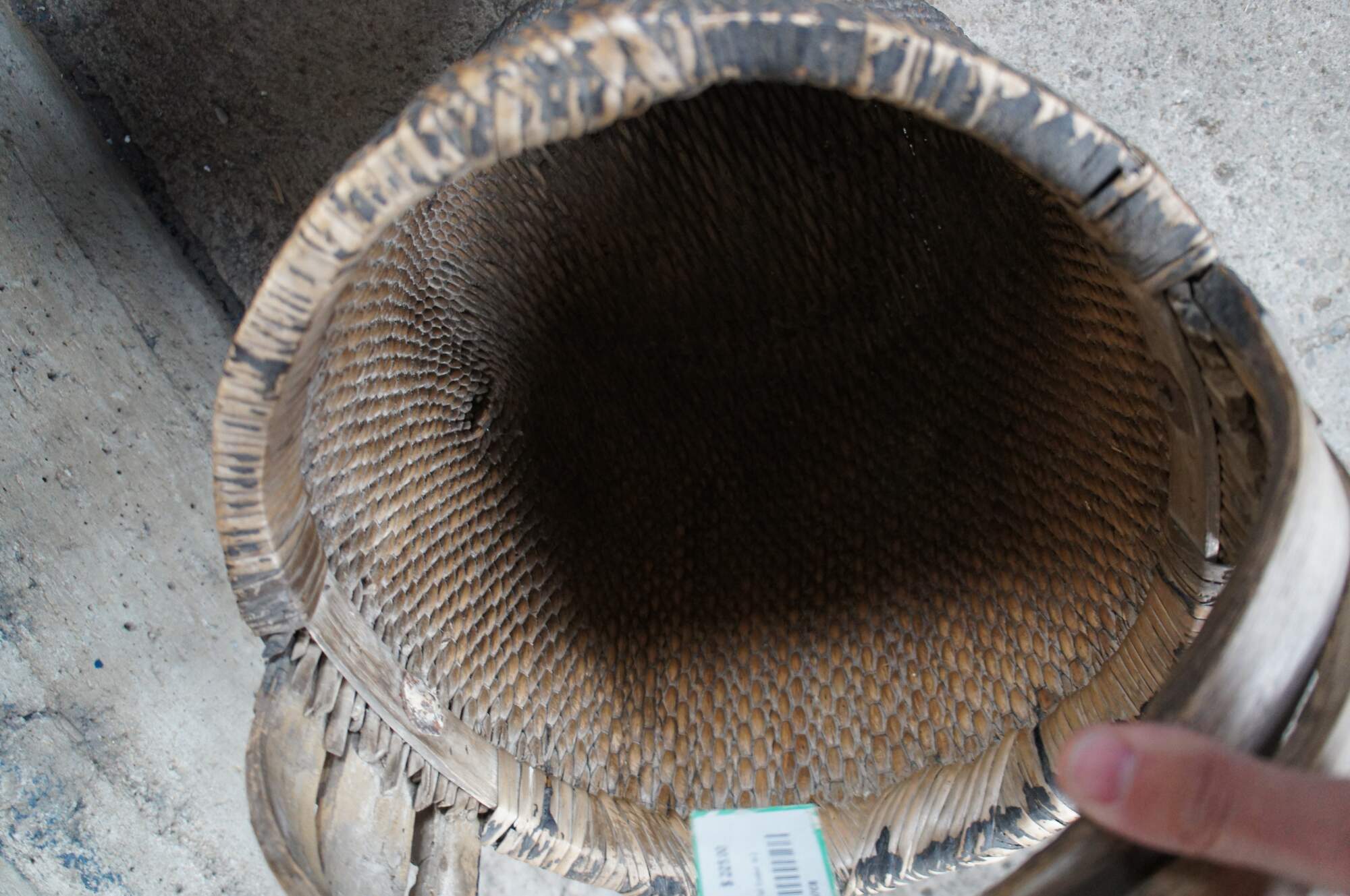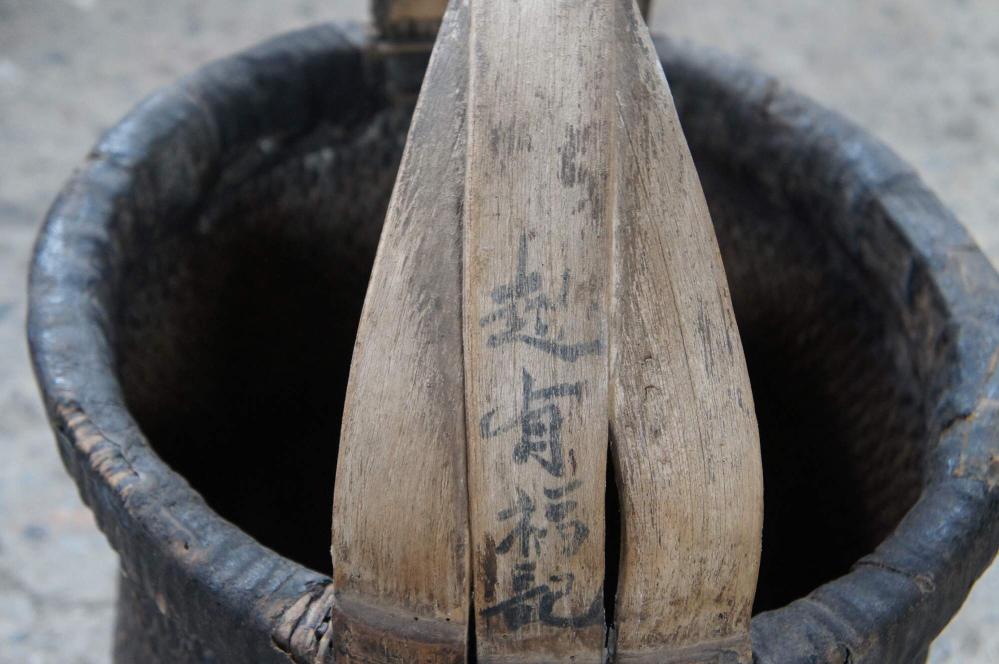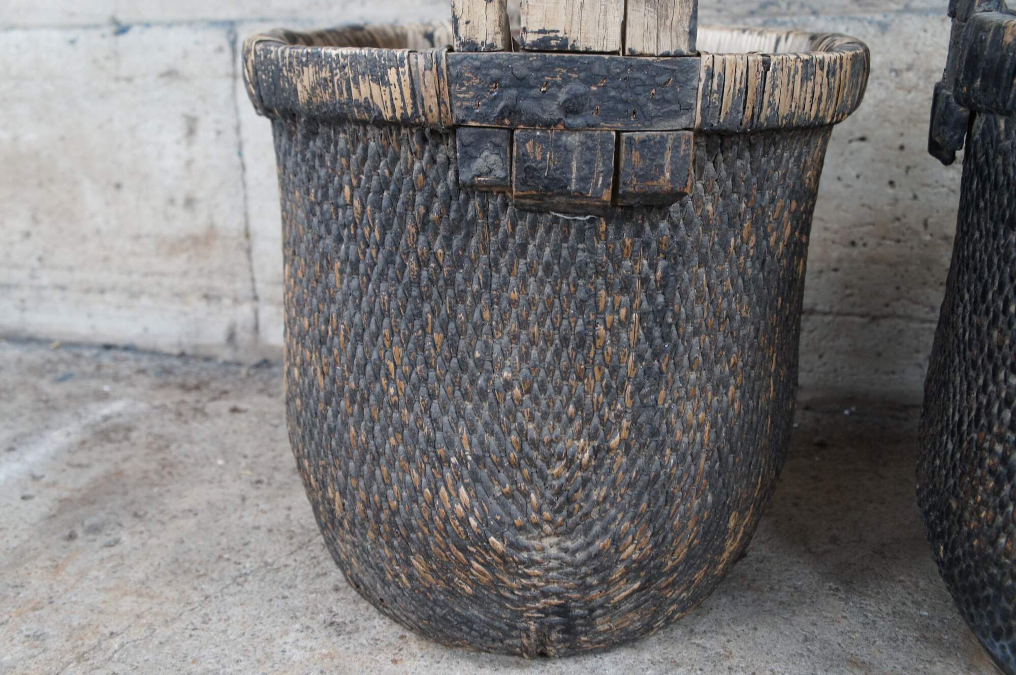 Antique Chinese rice basket featuring woven reed and willow with bentwood handle. Each basket differs slightly in characteristics and measurements - some have calligraphy, some richer / darker / lighter in color etc.