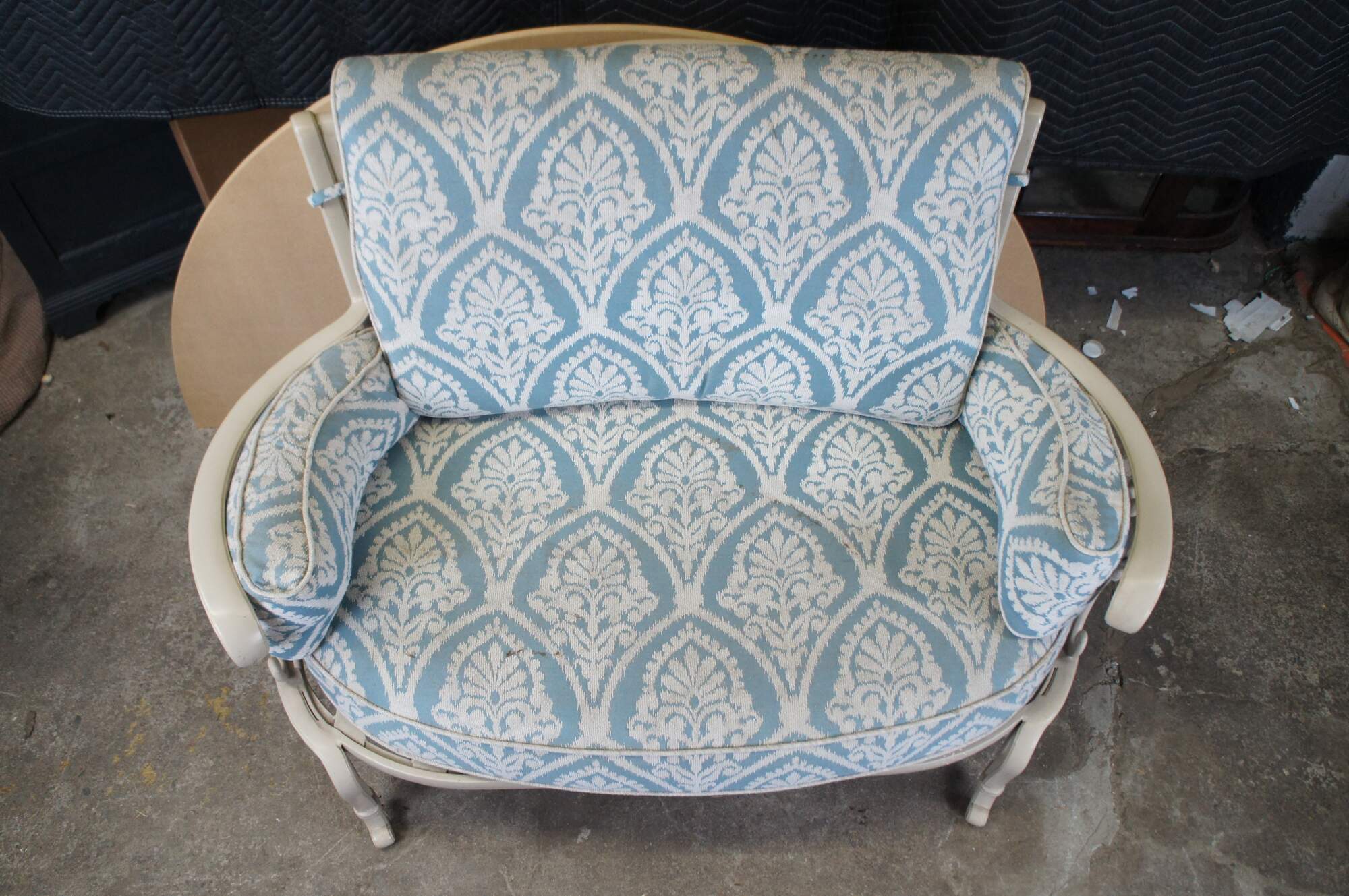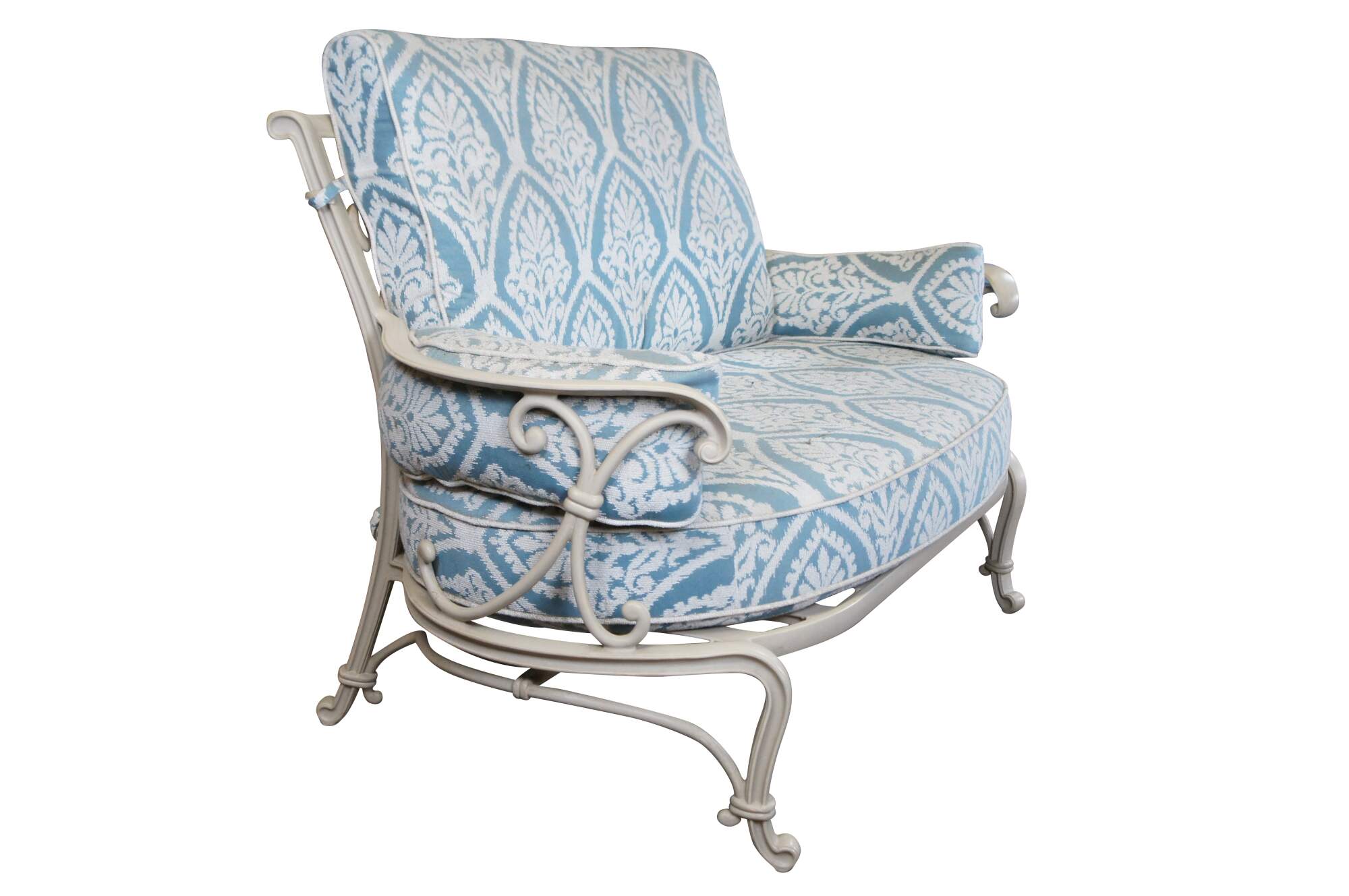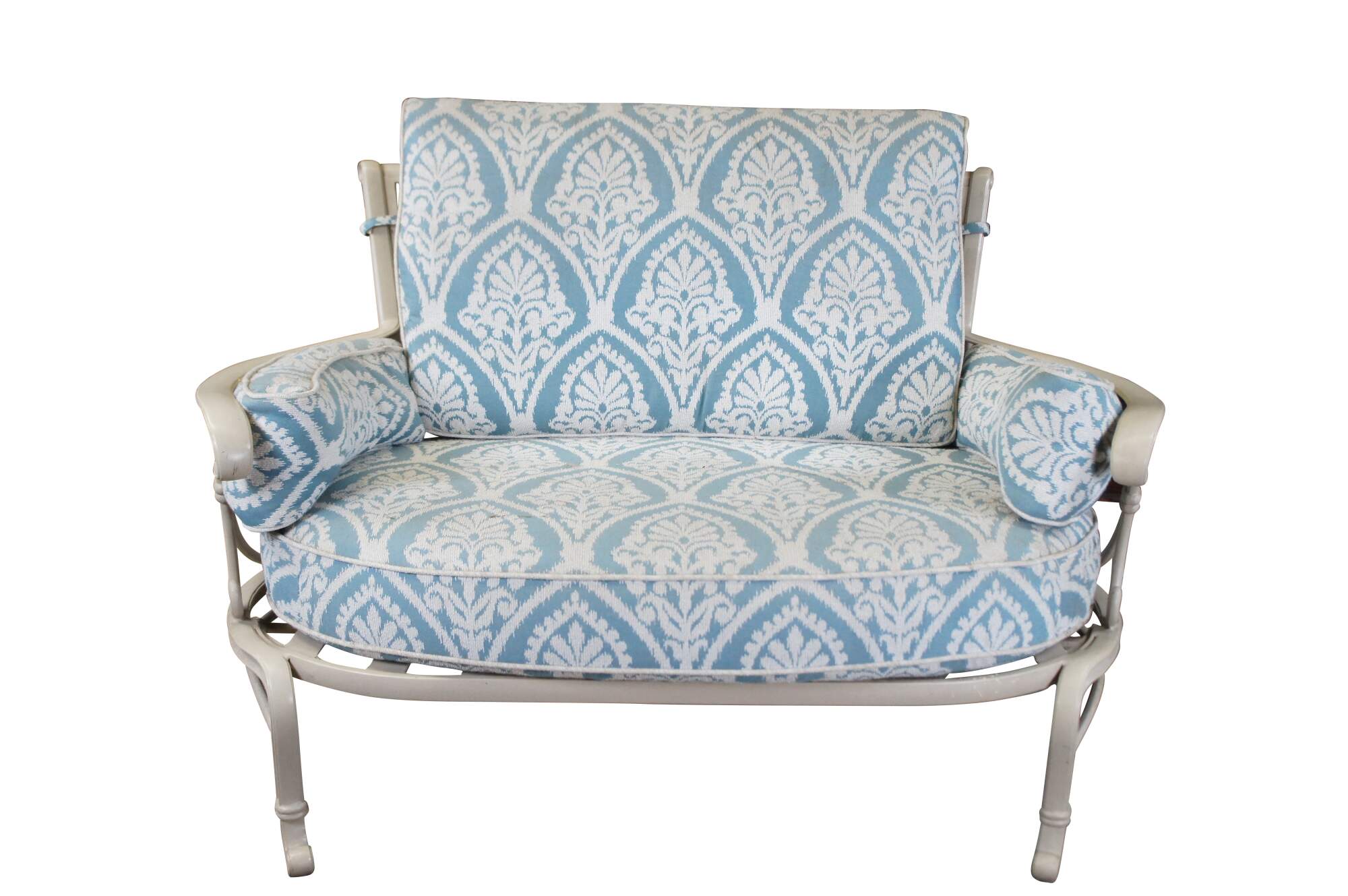 Vintage Frontgate outdoor patio chair / bench / loveseat. Made of cast aluminum featuring serpentine and scrolled form with lattice acanthus style back.
