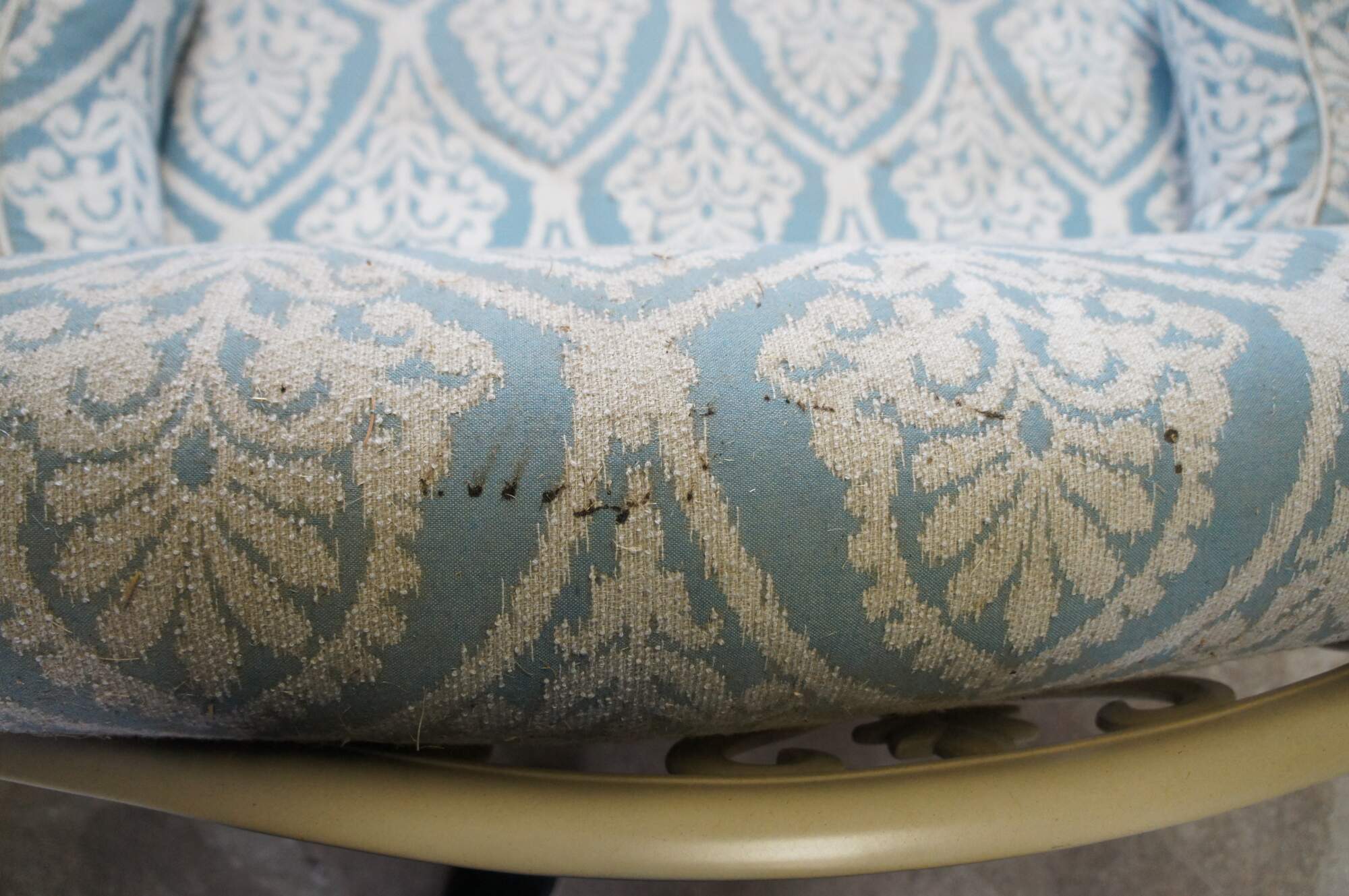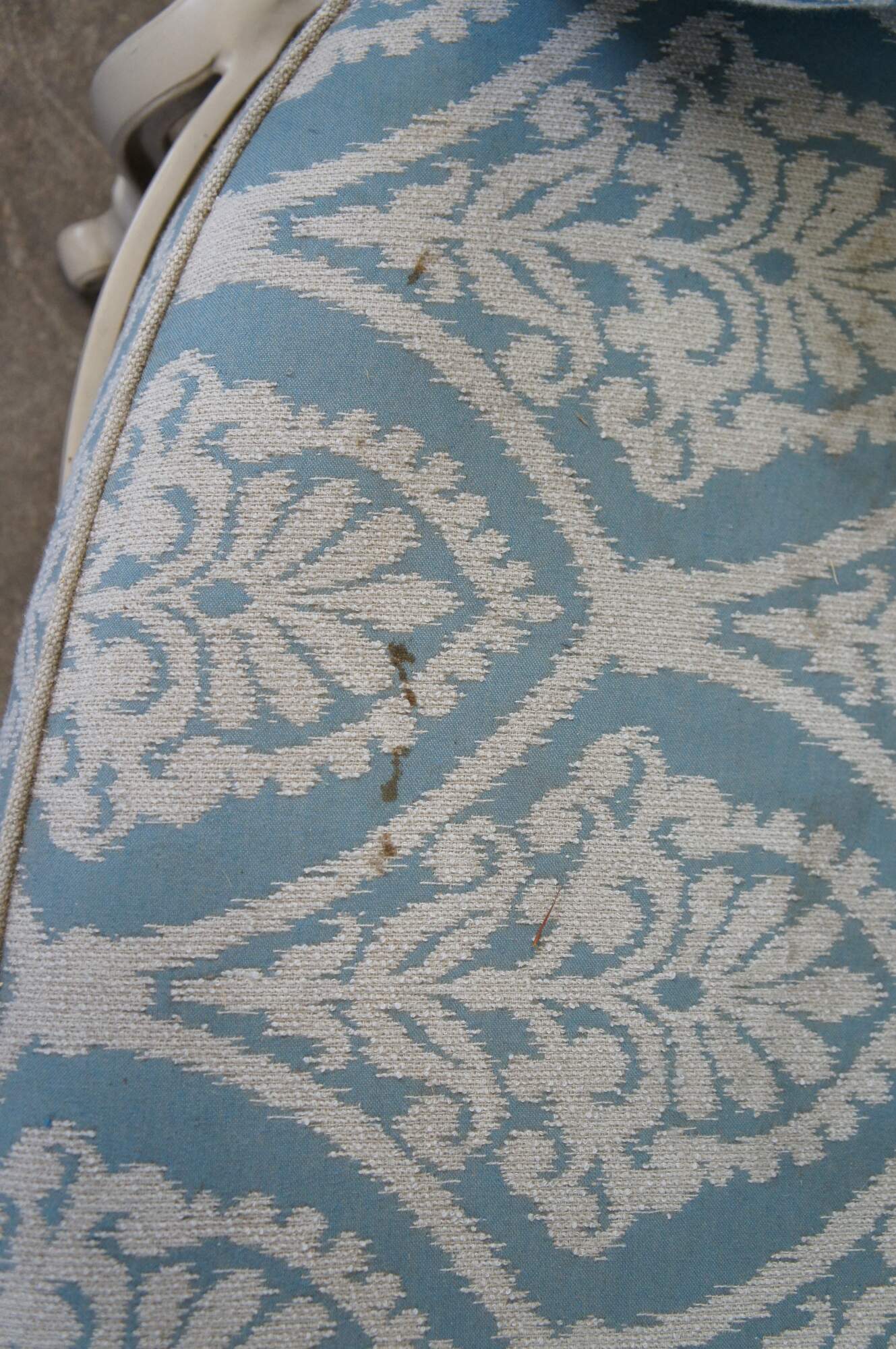 Fair condition, wear and distressing from age and use, some pitting, staining / fading to upholstery. Heavy.