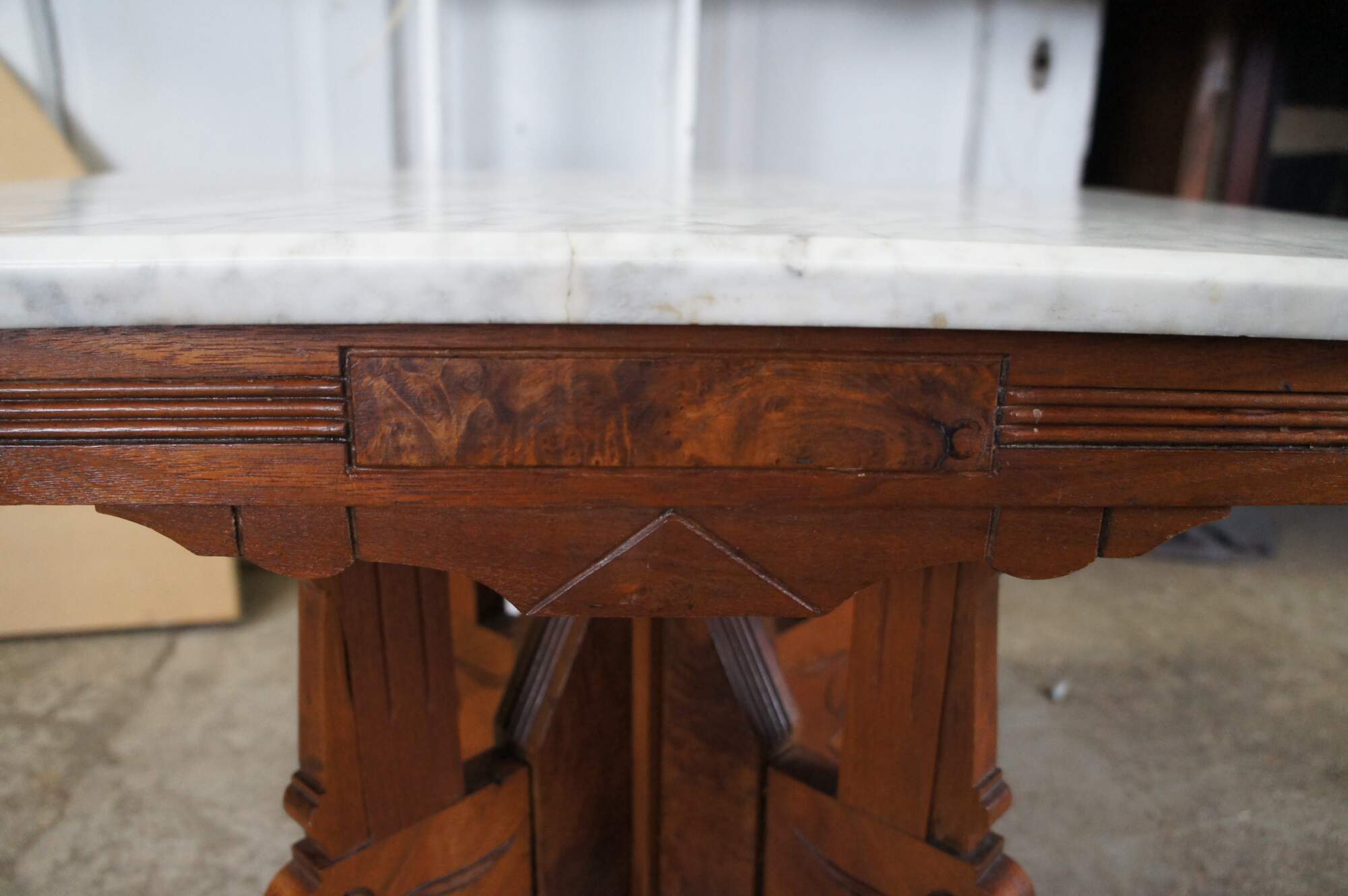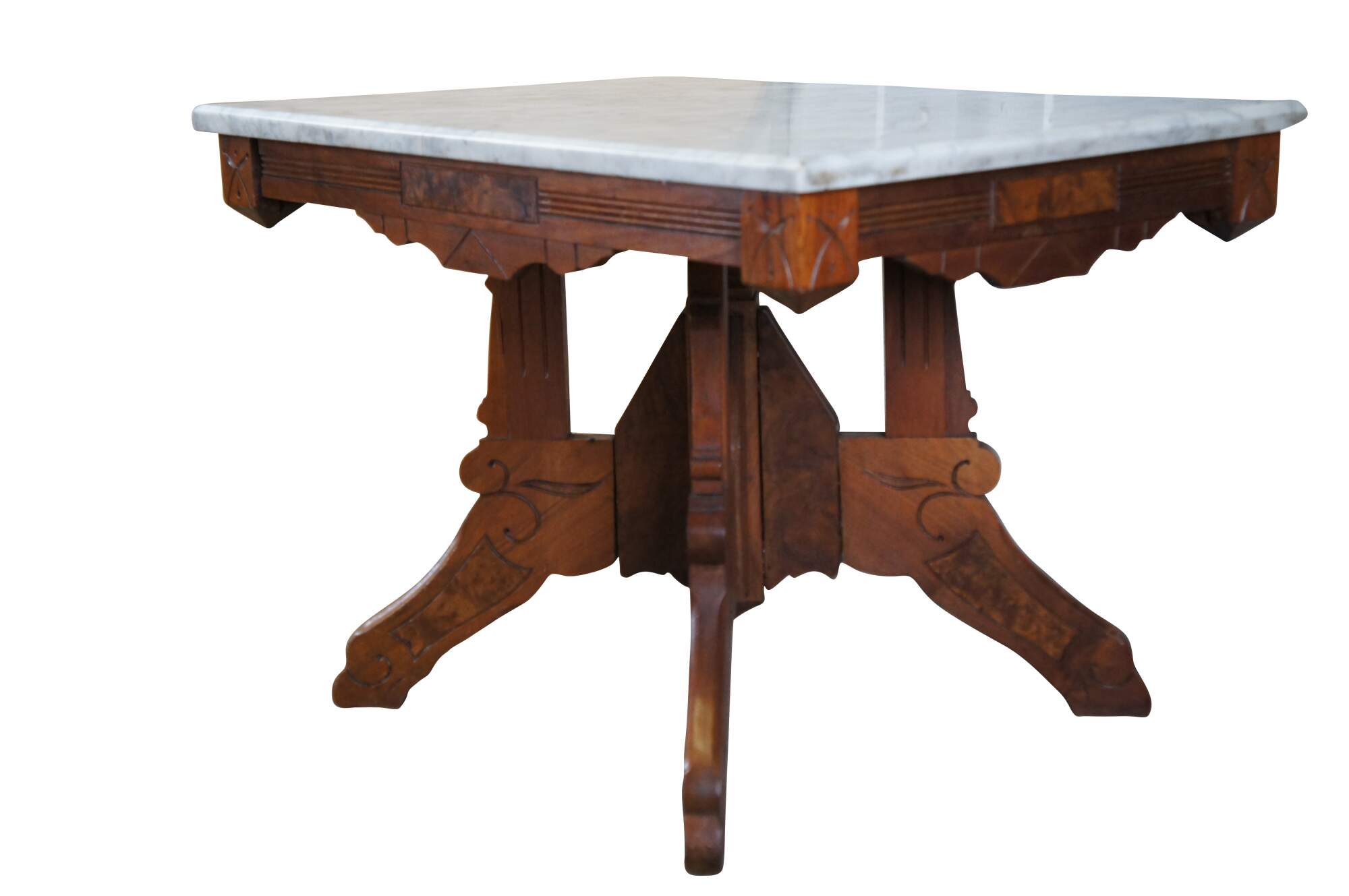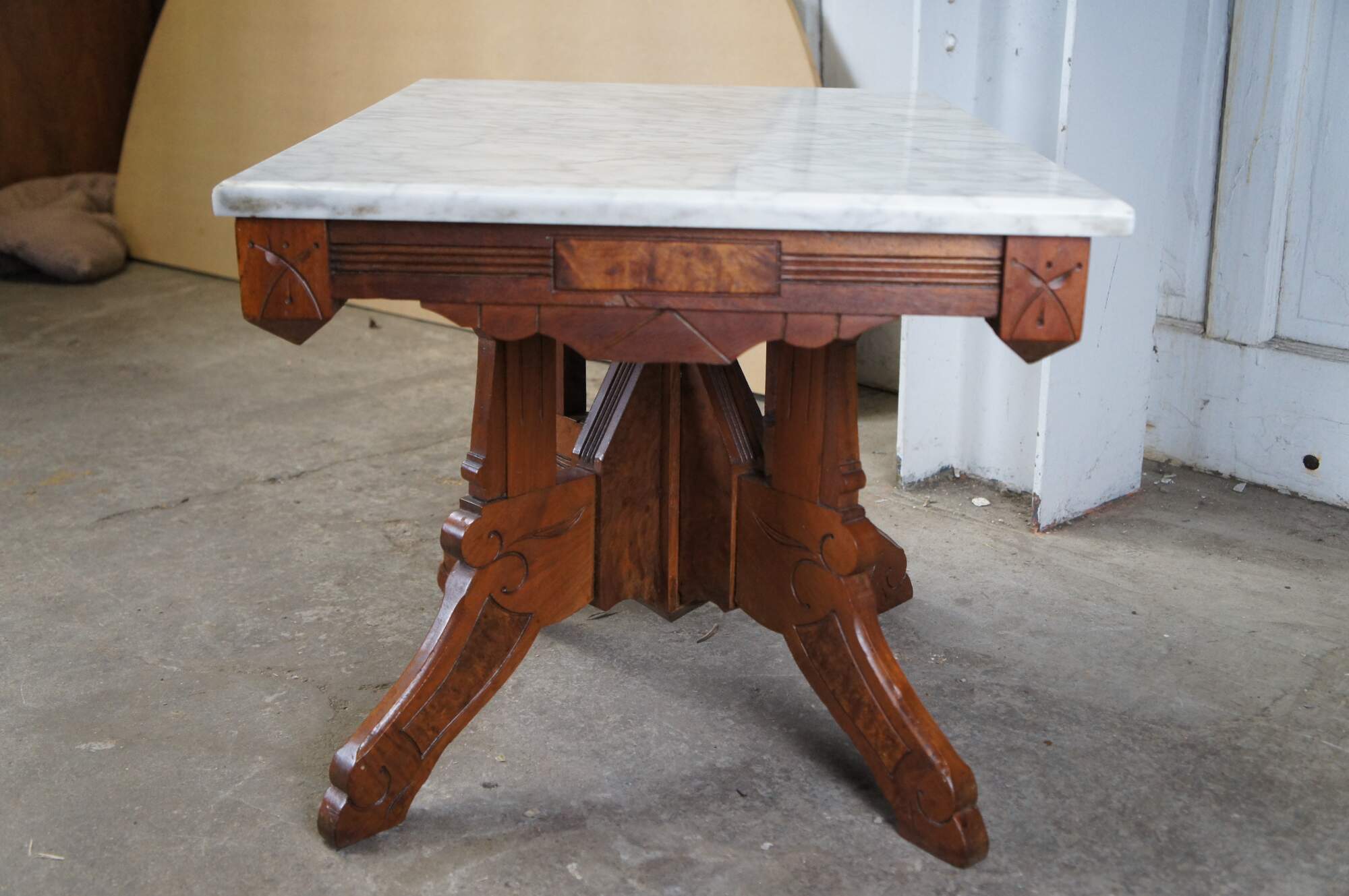 An antique Victorian Eastlake marble top coffee table. Features a rectangular form made from walnut with burled panels and carved accents. The table is supported by four flared legs.