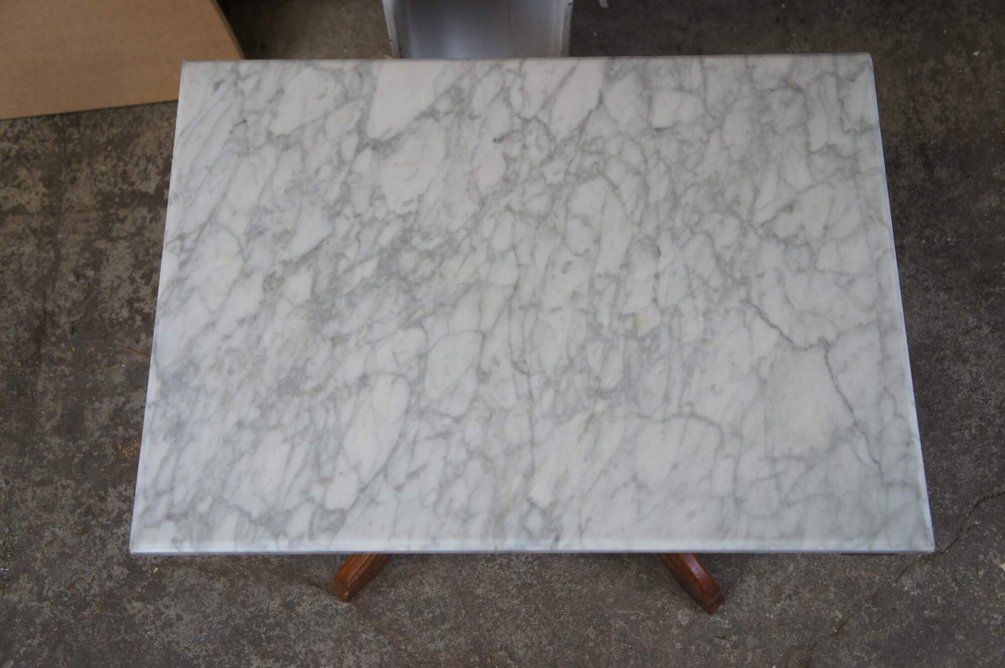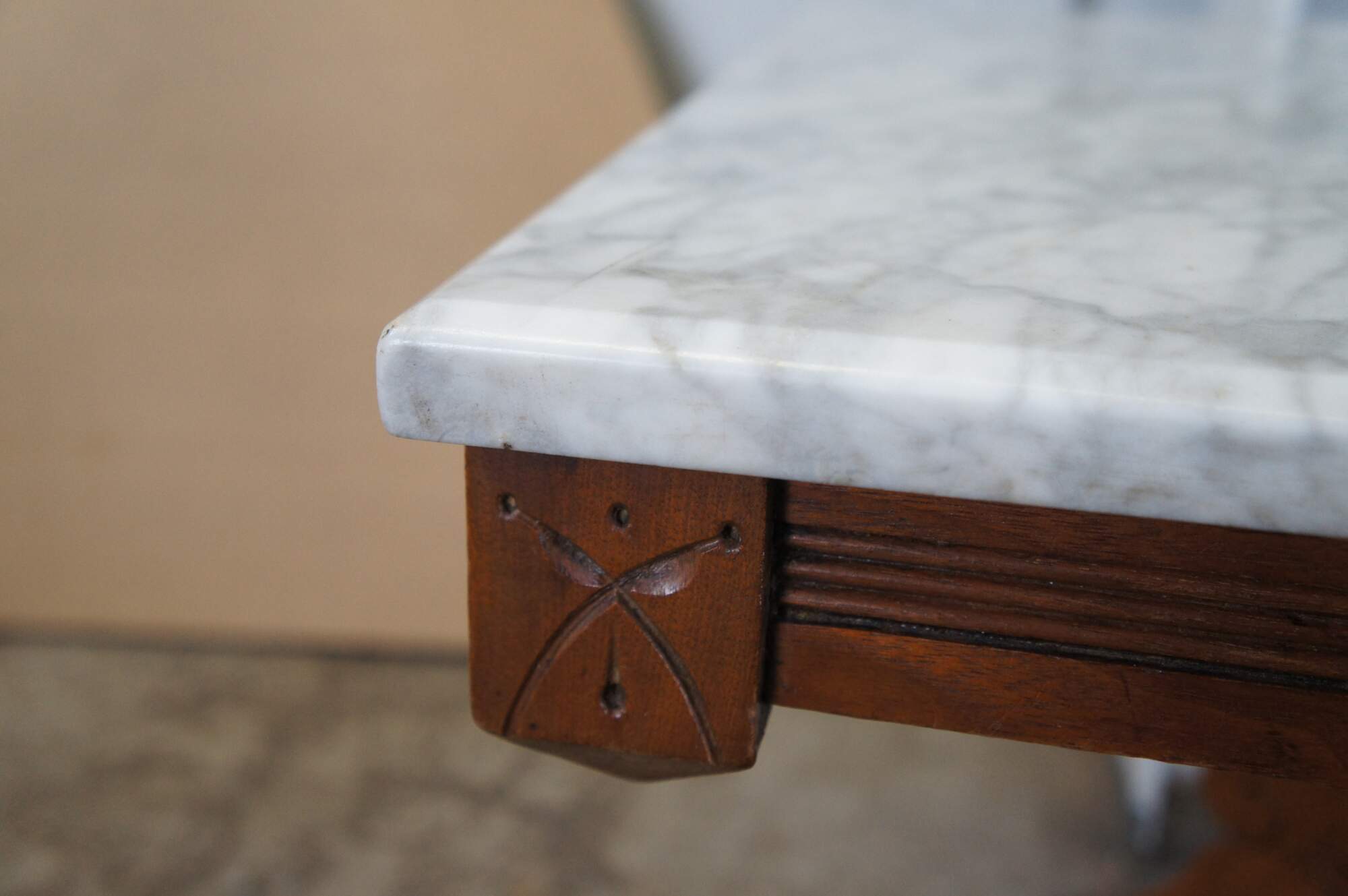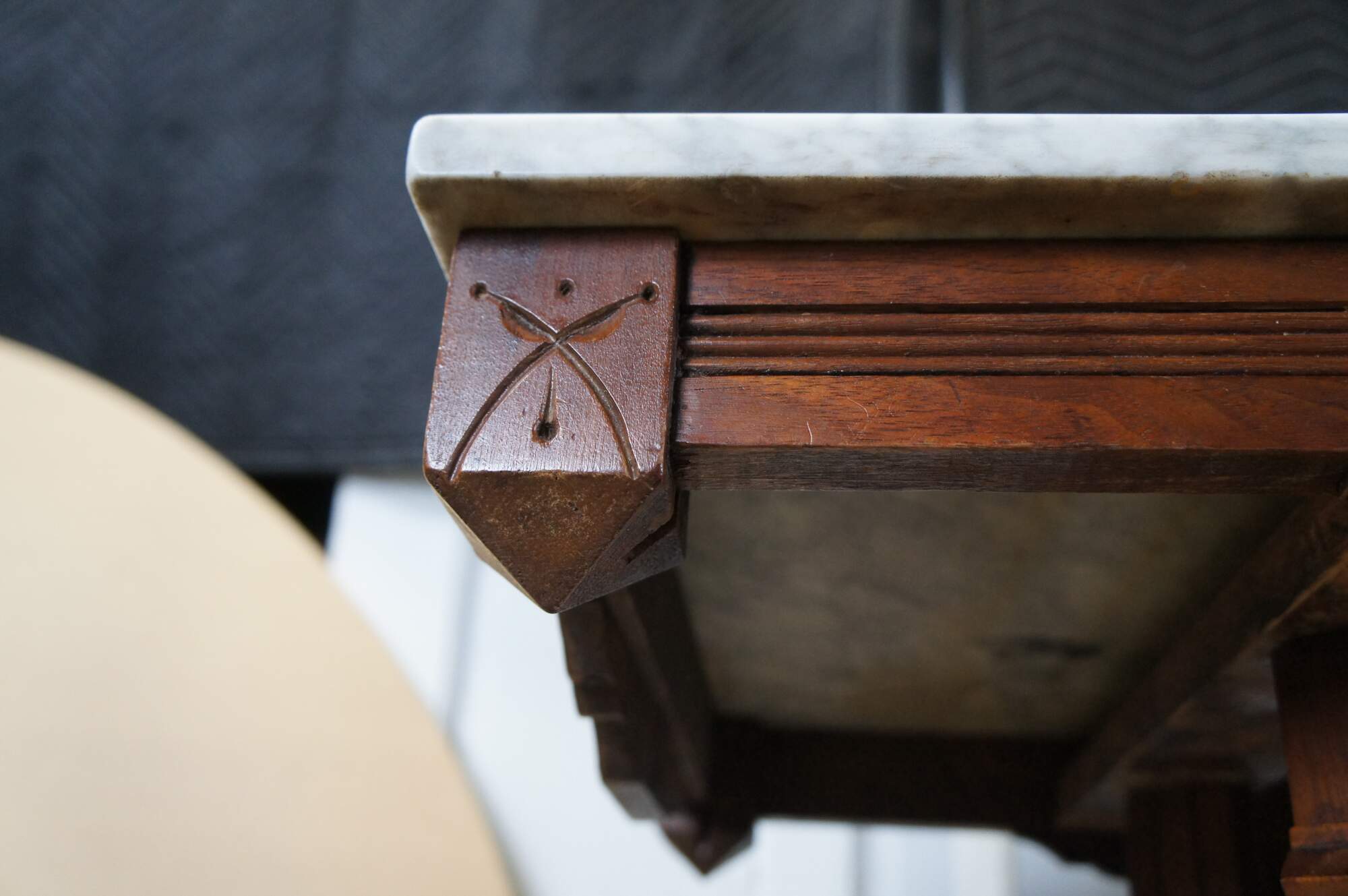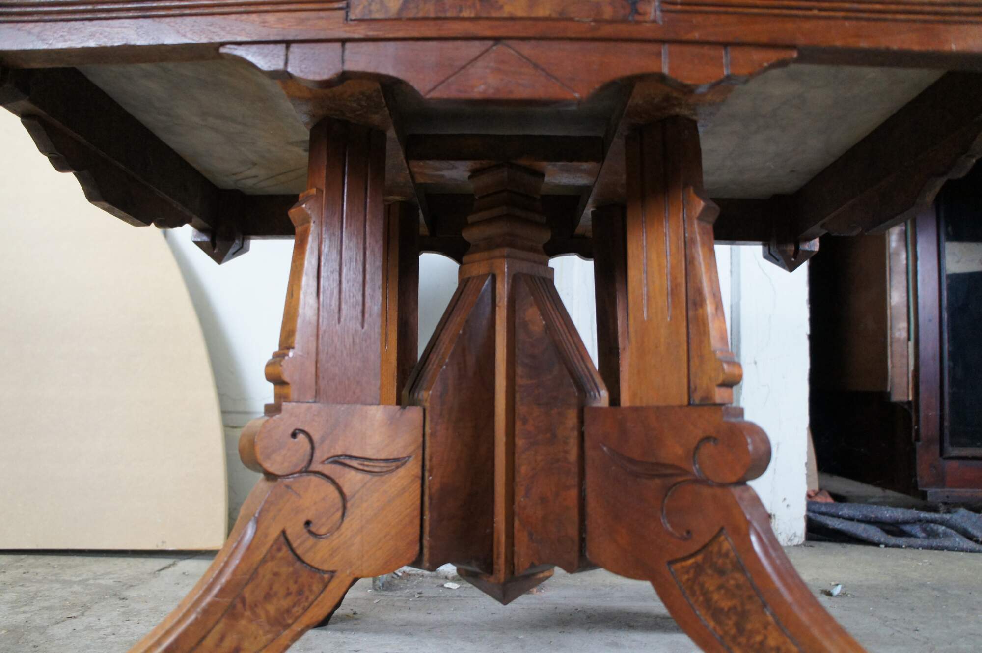 An antique Victorian Eastlake marble top coffee table. Features a rectangular form made from walnut with burled panels and carved accents. The table is supported by four flared legs.