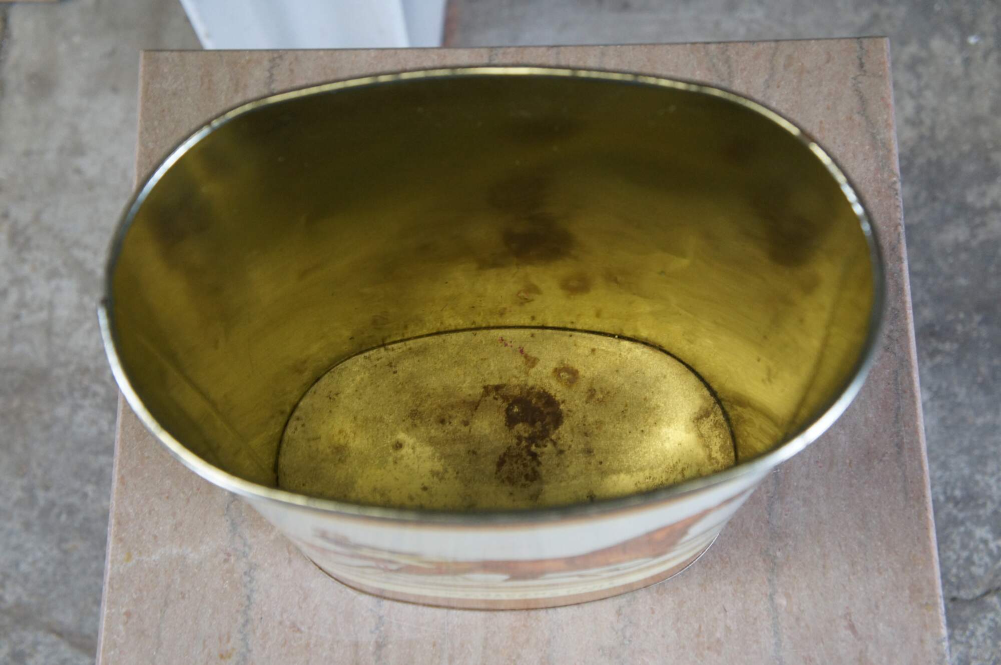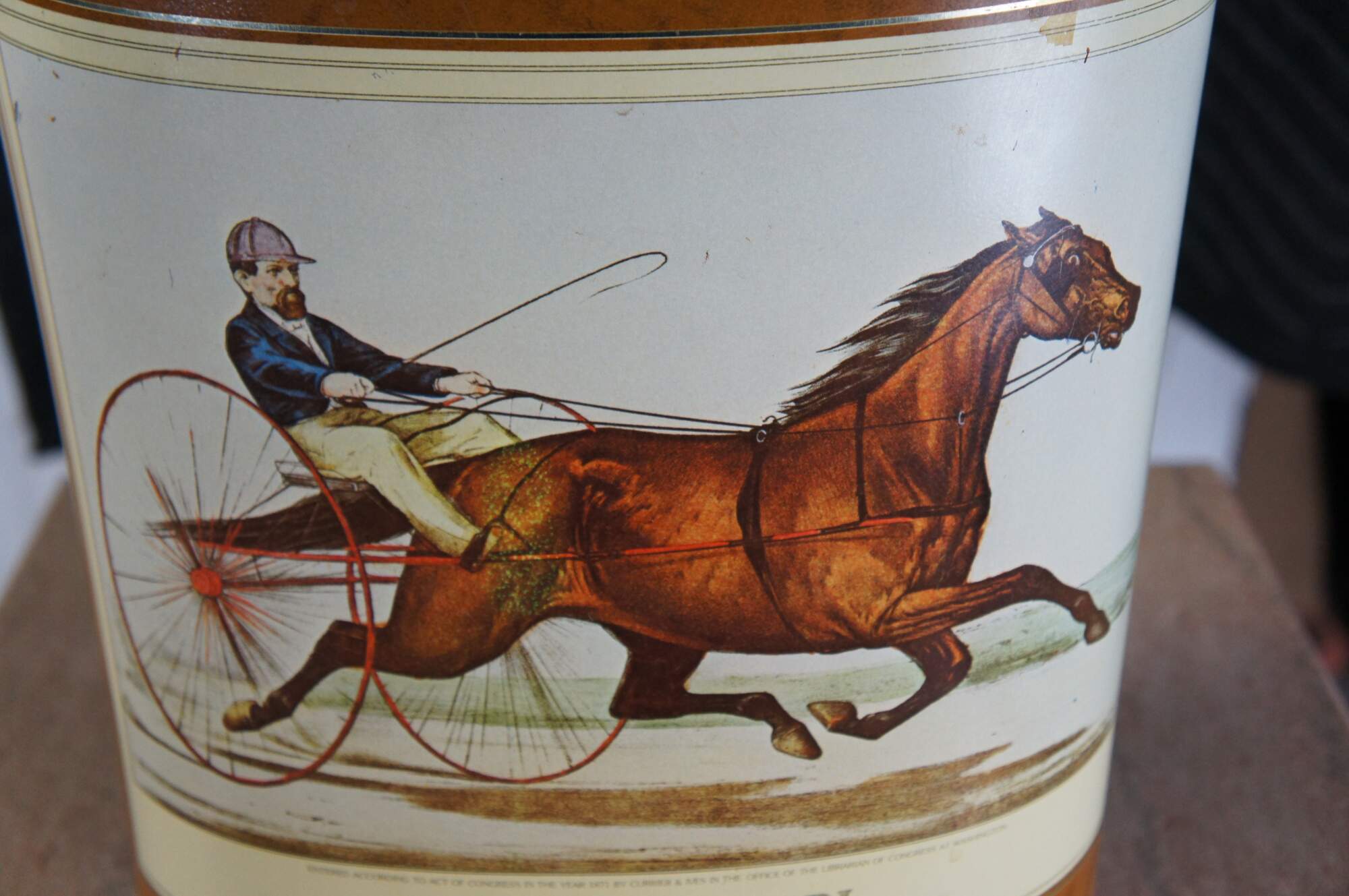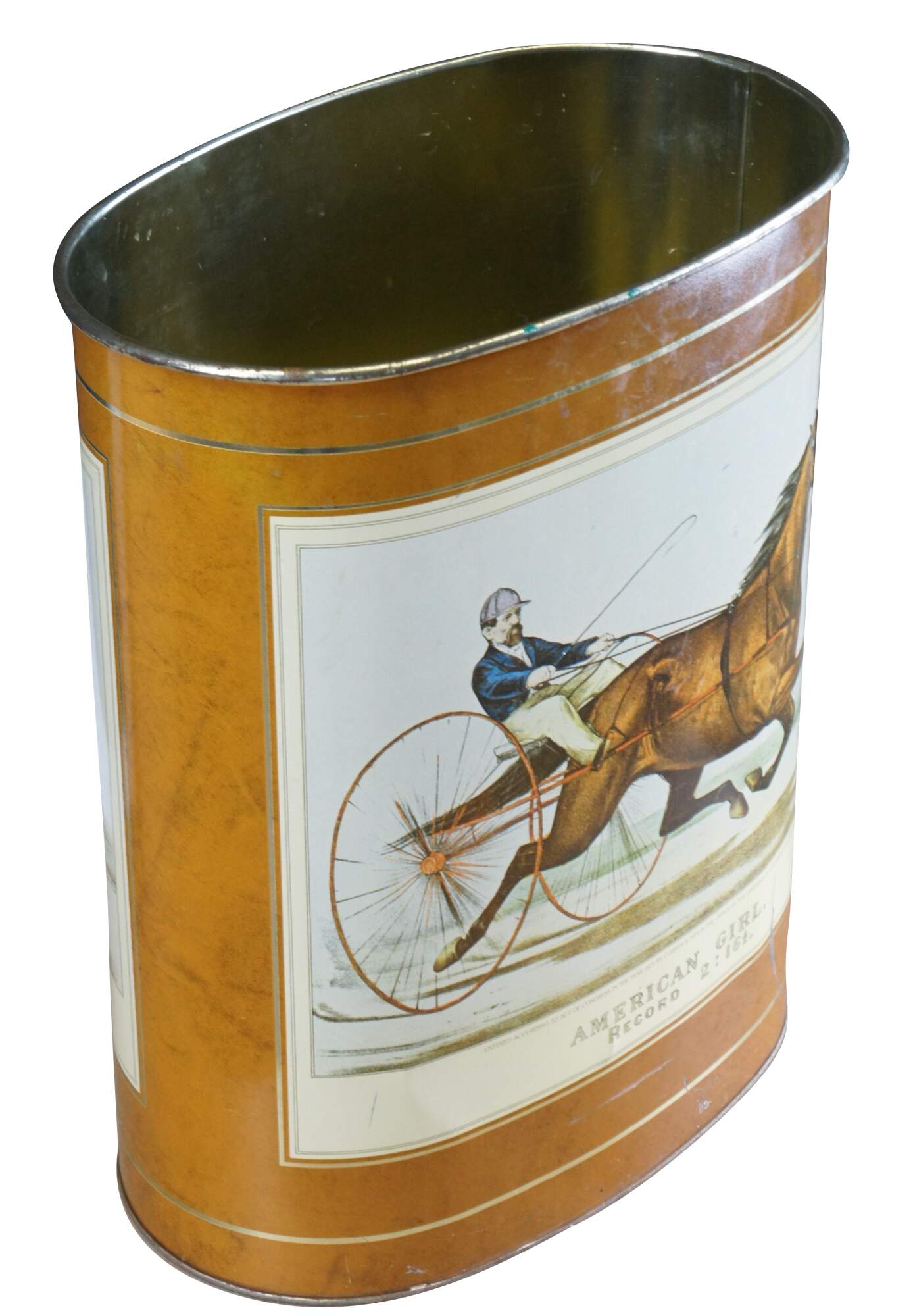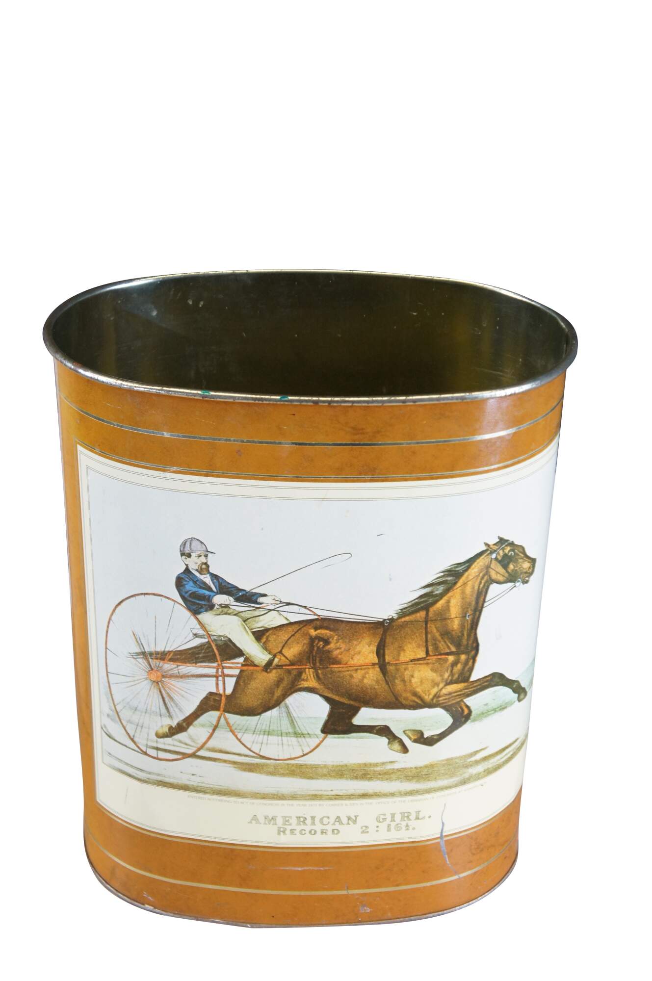 Vintage metal trash can with Currier & Ives American Girl Scene. American girl was a beloved race horse who raced between 1868-75 and won 52 race