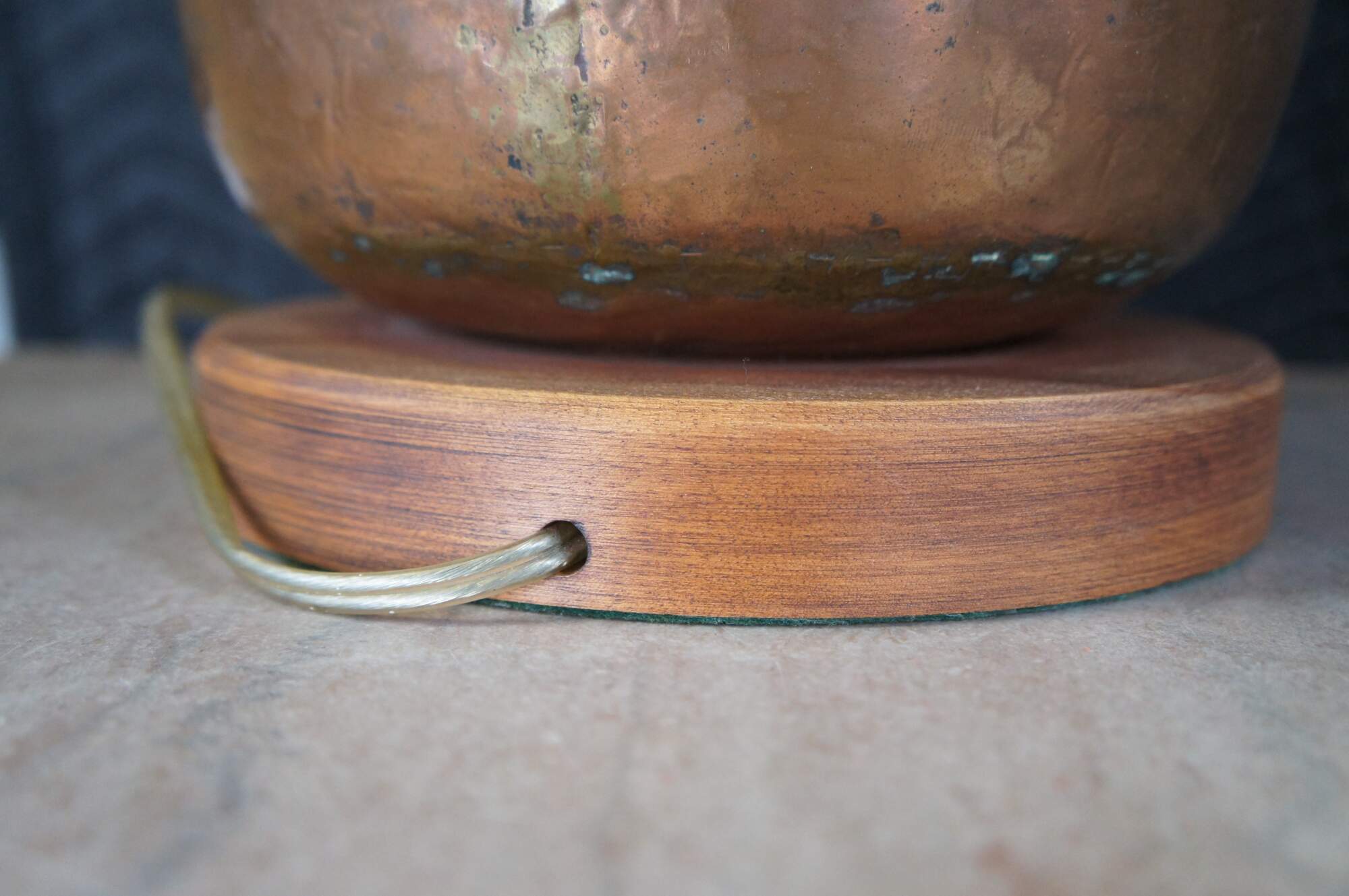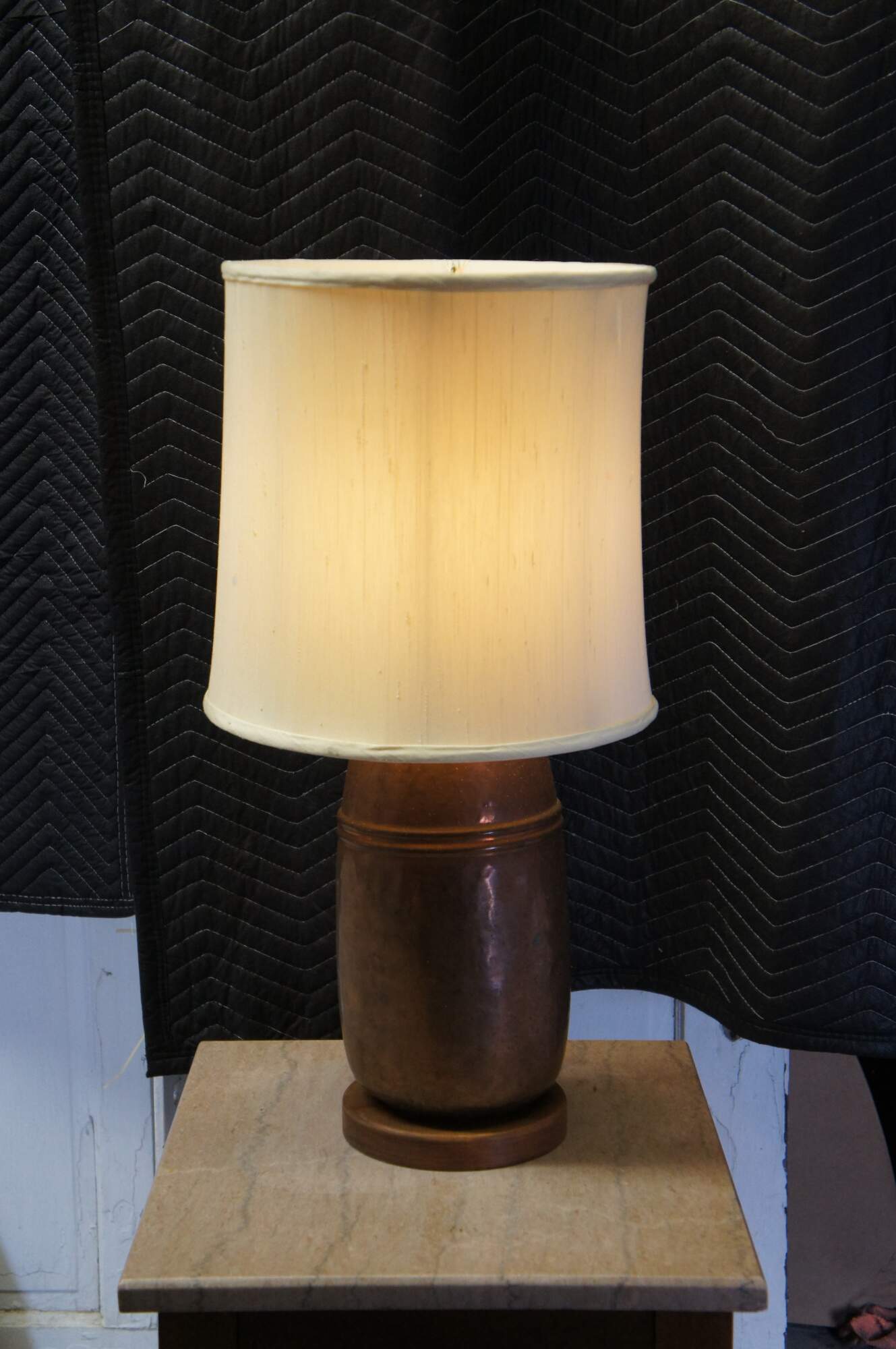 A beautiful antique hammered and dovetailed copper pot or canister table lamp. The rustic 19th century pot has a unique form and charming patina. Sits on a wooden plinth base. The pot was converted to a lamp around 1980.