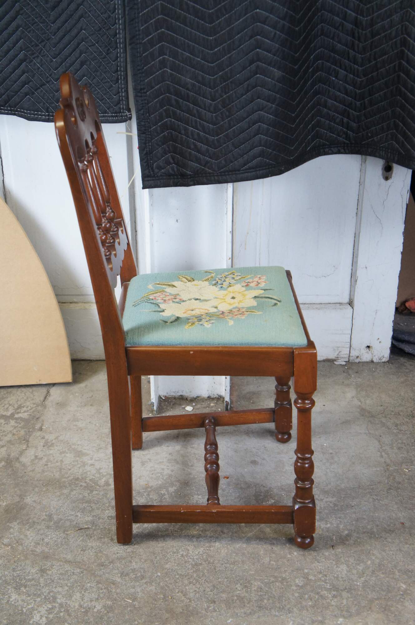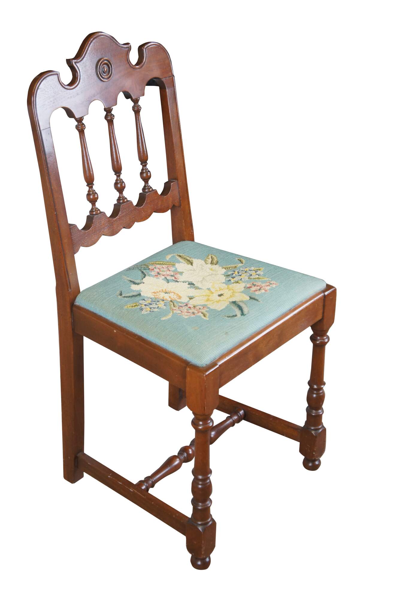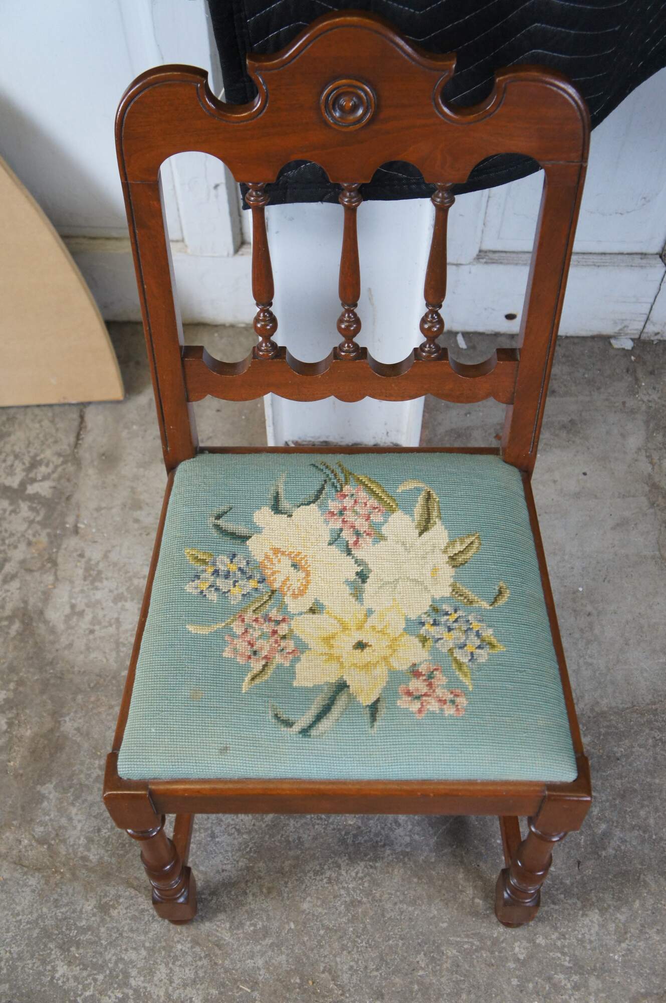 Michigan Chair Company Victorian style side or desk chair, circa 1910-20. Made from walnut with an ornate crest rail and spindled back. Features a floral embroidered seat over turned legs connected by an H stretcher.