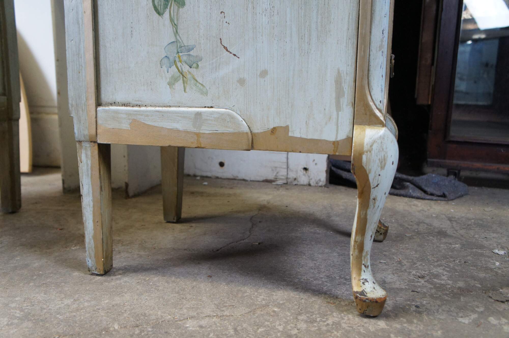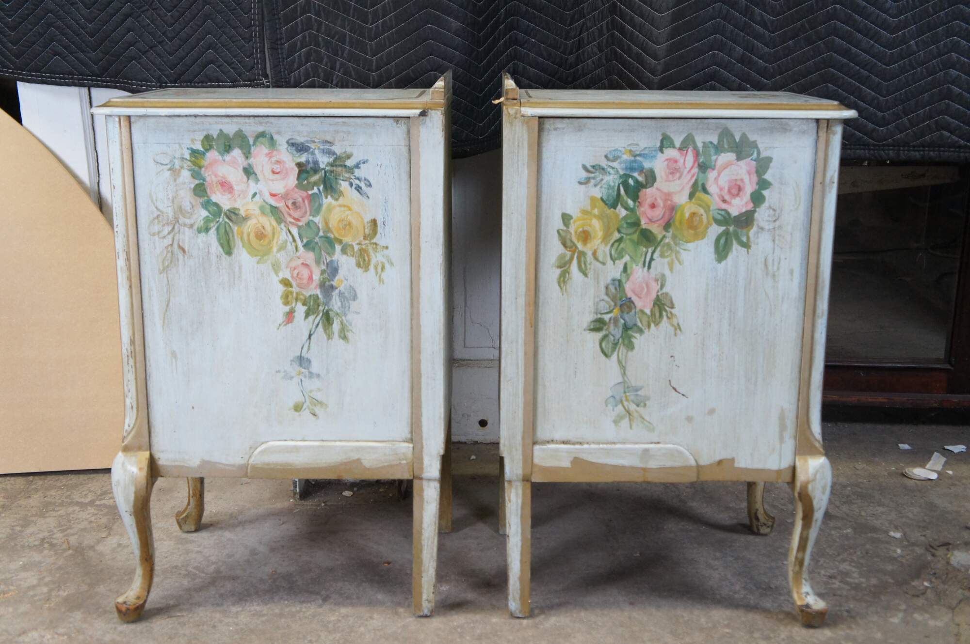 A pair of ealy 20th century end tables. Reclaimed from an old desk. Feature a hand painted blue finish, trimmed in gold with rose motif. Includes three dovetailed drawers with ornate brass hardware