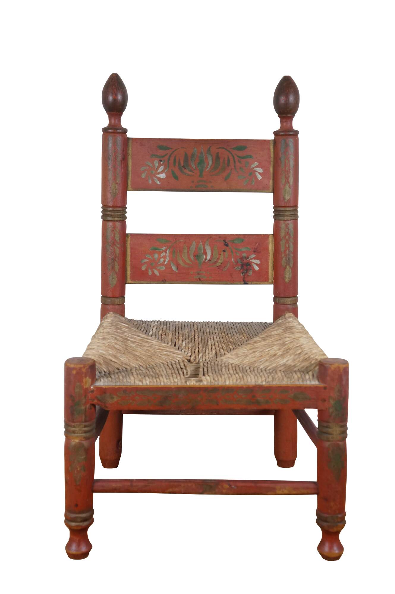 Vintage 20th century Mexican folk art painted child sized ladderback chair featuring shaker styling with turned spindle legs, ladderback, and woven rush seat. Hand painted in red with floral and foliate designs.