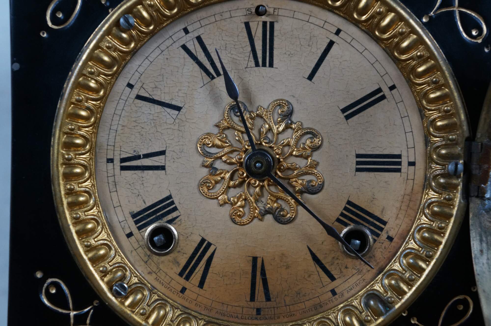Late 19th century black cast iron Ansonia mantel clock. Black lacquered iron case with gold painted art nouveau foliate details. Key wound, chiming. Off white face with black Roman numerals and hands; gilt floral filigree medallion and egg and dart frame. Manufactured by the Ansonia Clock Company, New York, United States of America.